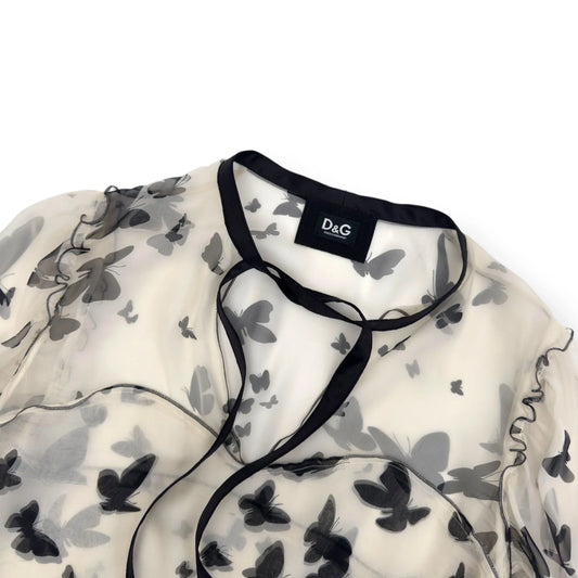 DOLCE & GABBANA BICOLOUR BUTTERFLY PRINT SHEER SILK BOW DETIAL BLOUSE BLACK / WHITE 44 / UK12