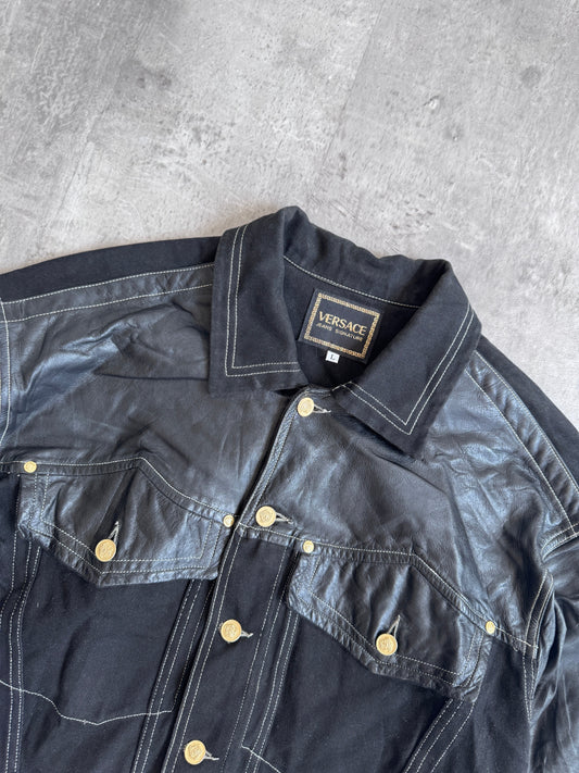 Versace Black Contrast Stitch Leather Hybrid Trucker Jacket