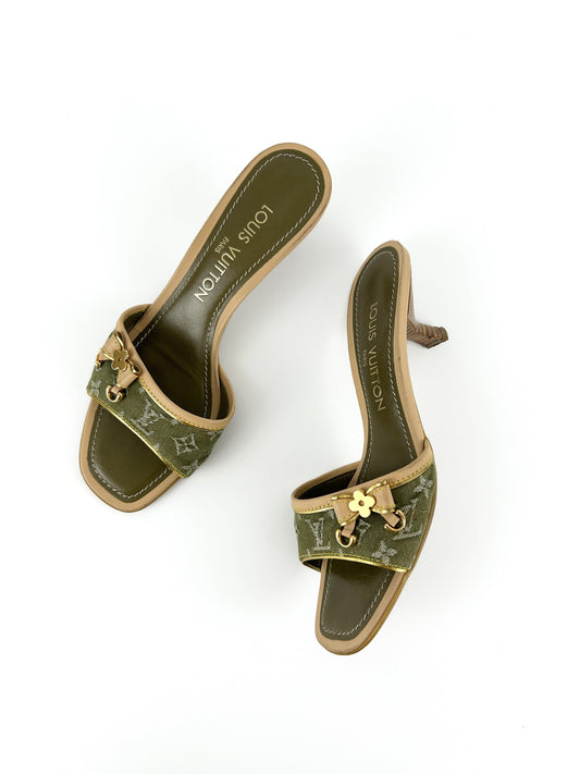 Vintage Louis Vuitton Khaki Denim Mules Heels 2000s