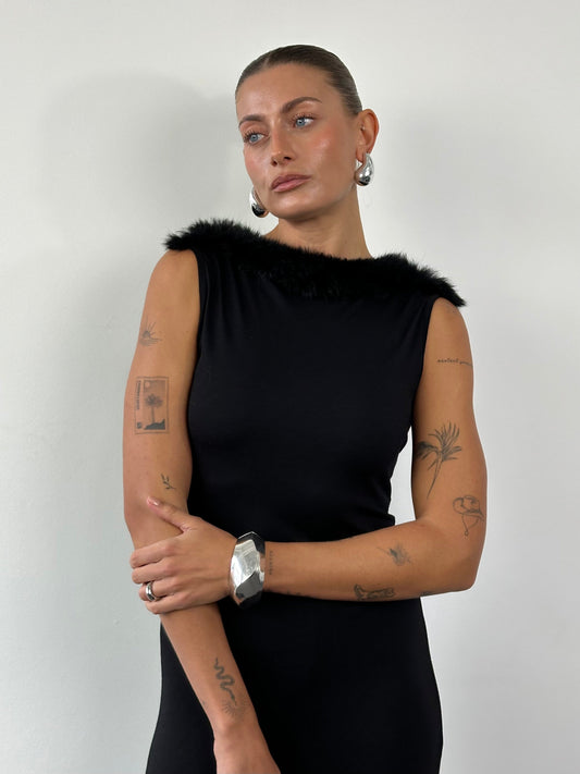 Moschino 1990s Feather Trim Boat Neck Midi Dress - S/M