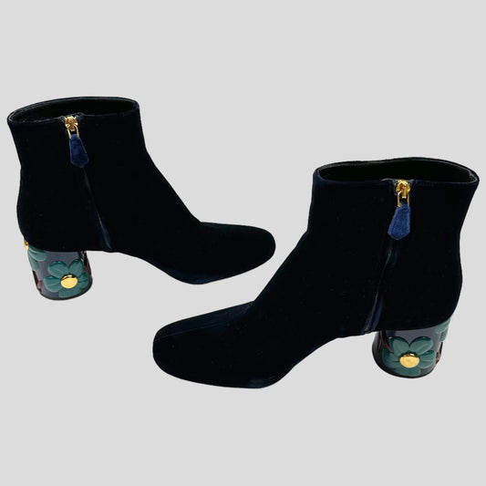 Prada Milano Floral Heel Blue Velvet Boots - UK7