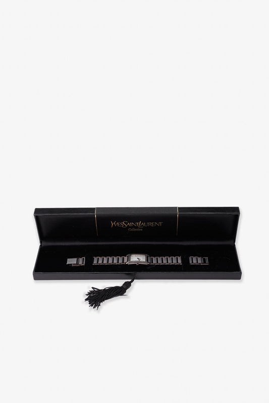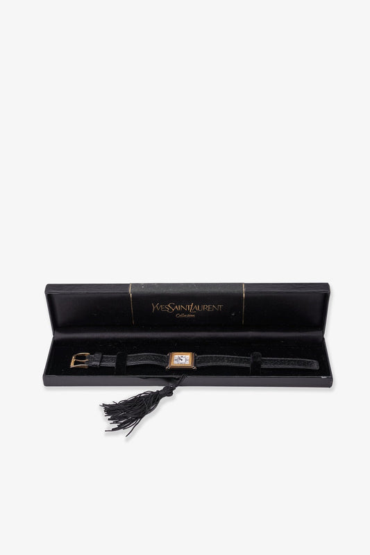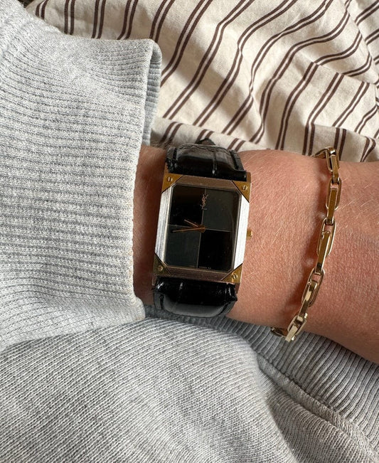Vintage YSL Gold and Silver Plated Watch with Black Leather Strap