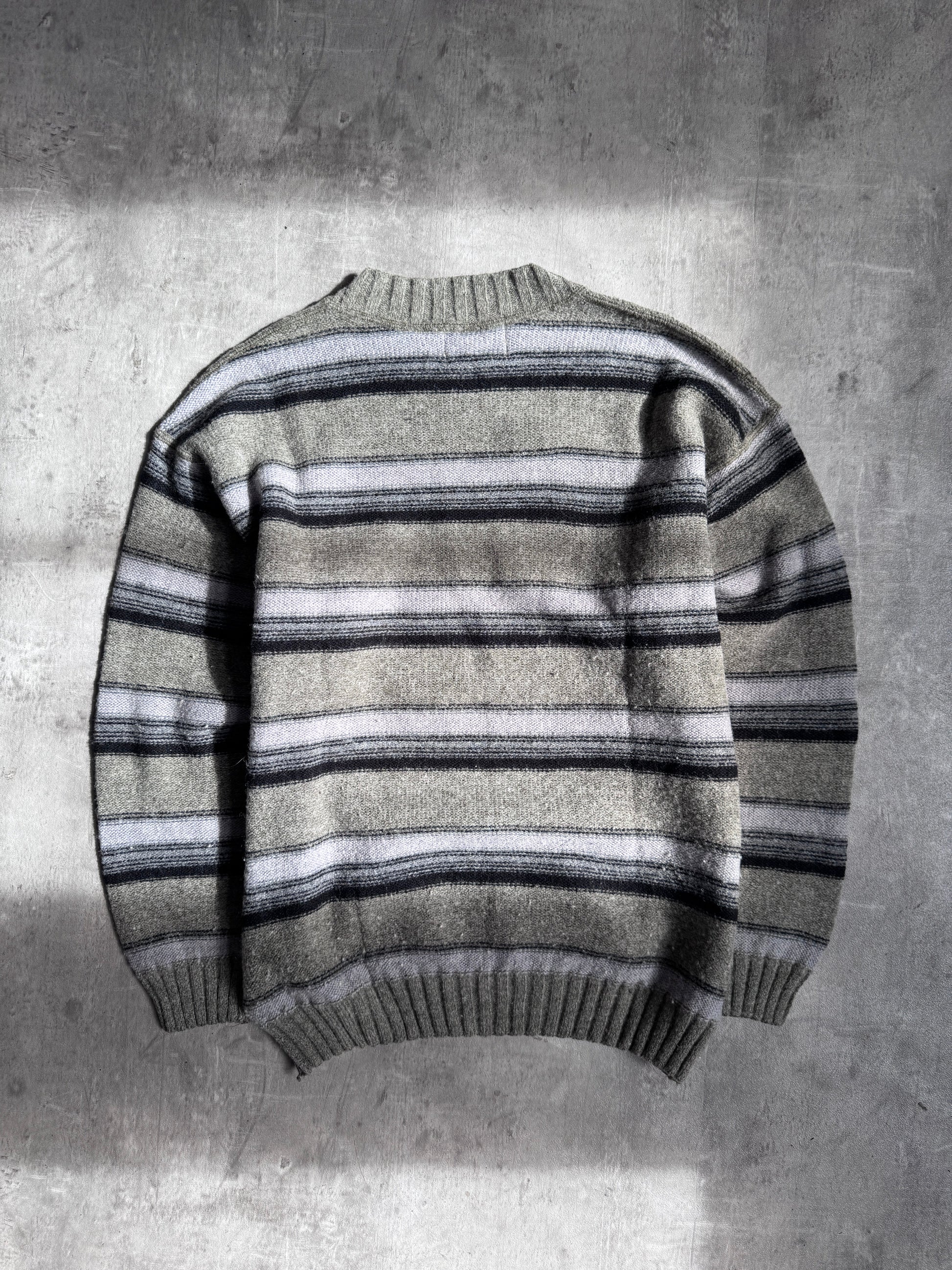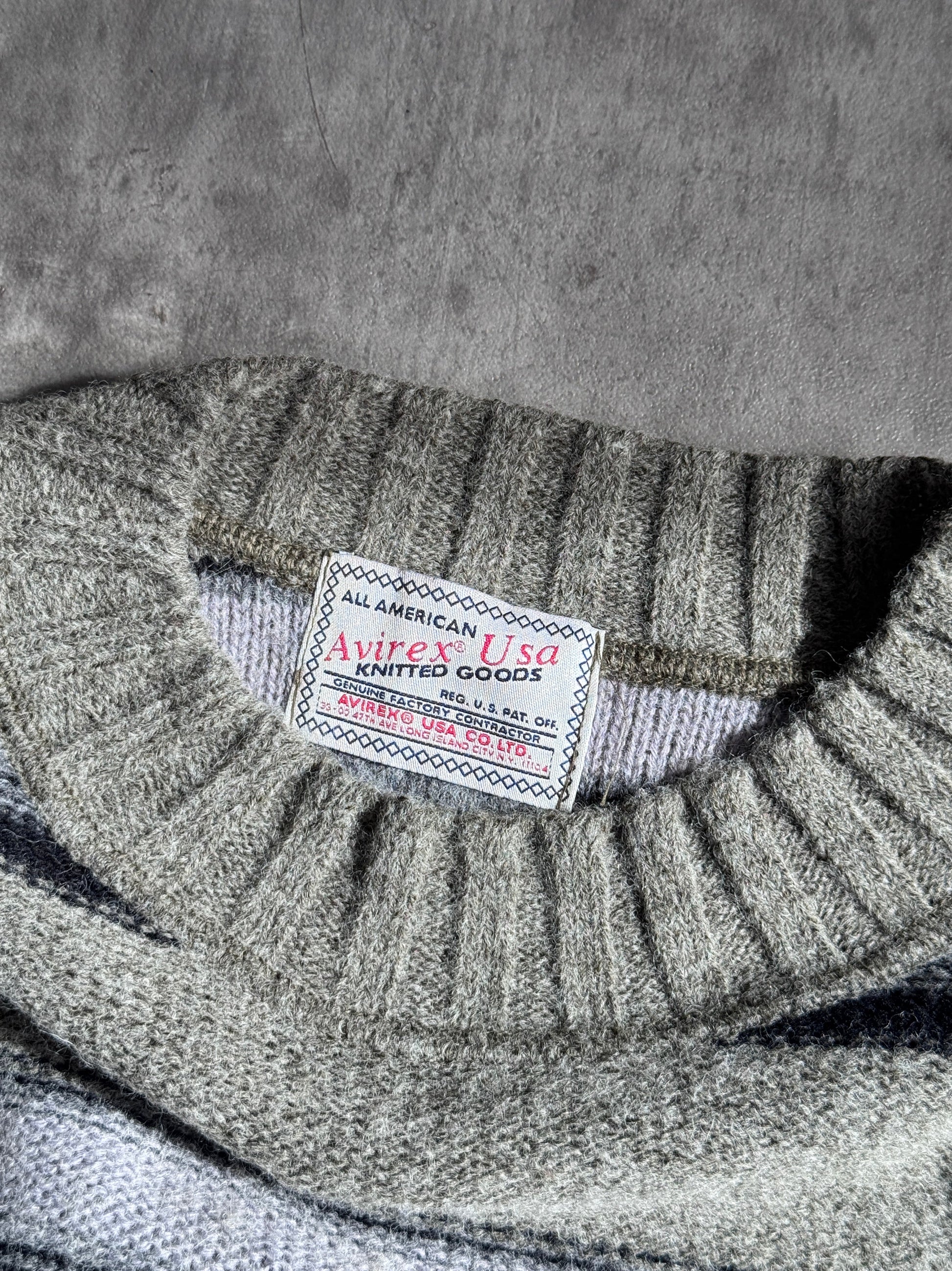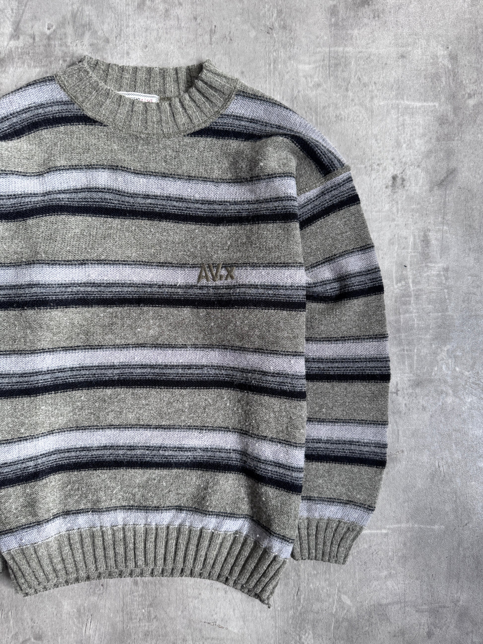 A classic 1990s Avirex wool knit sweater featuring a bold striped pattern in shades of grey and black. Known for their heritage in military-inspired fashion, Avirex also produced timeless knitwear during the 90s, and this piece embodies casual vintage style with premium construction. The embroidered AVX logo at the chest adds a subtle branded touch.
