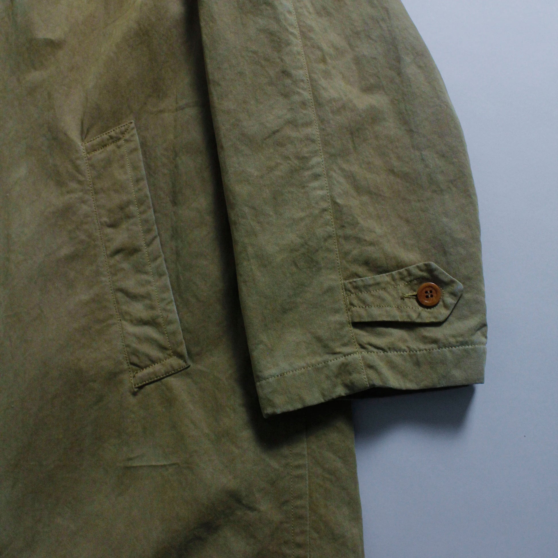 An early example of the Massimo Osti studios rubber wool in this military style cotton trench coat, featuring bone button closure and cuff fastening. Rubberised collar and internal fixed liner. Finished with constructed armpit vents for breathability and easier movement.