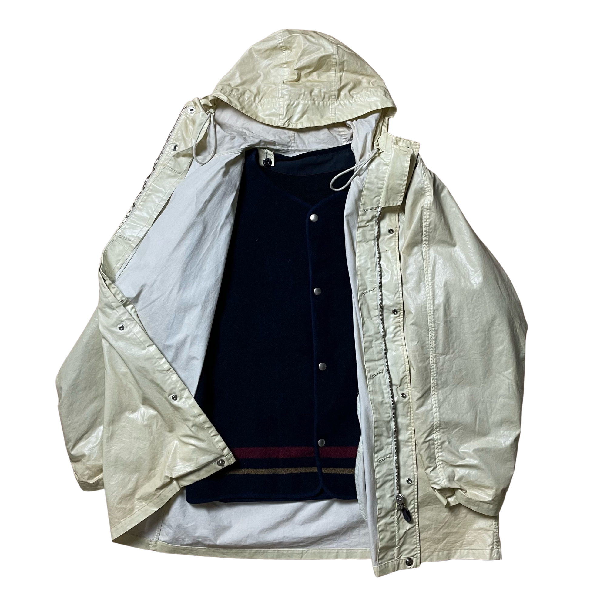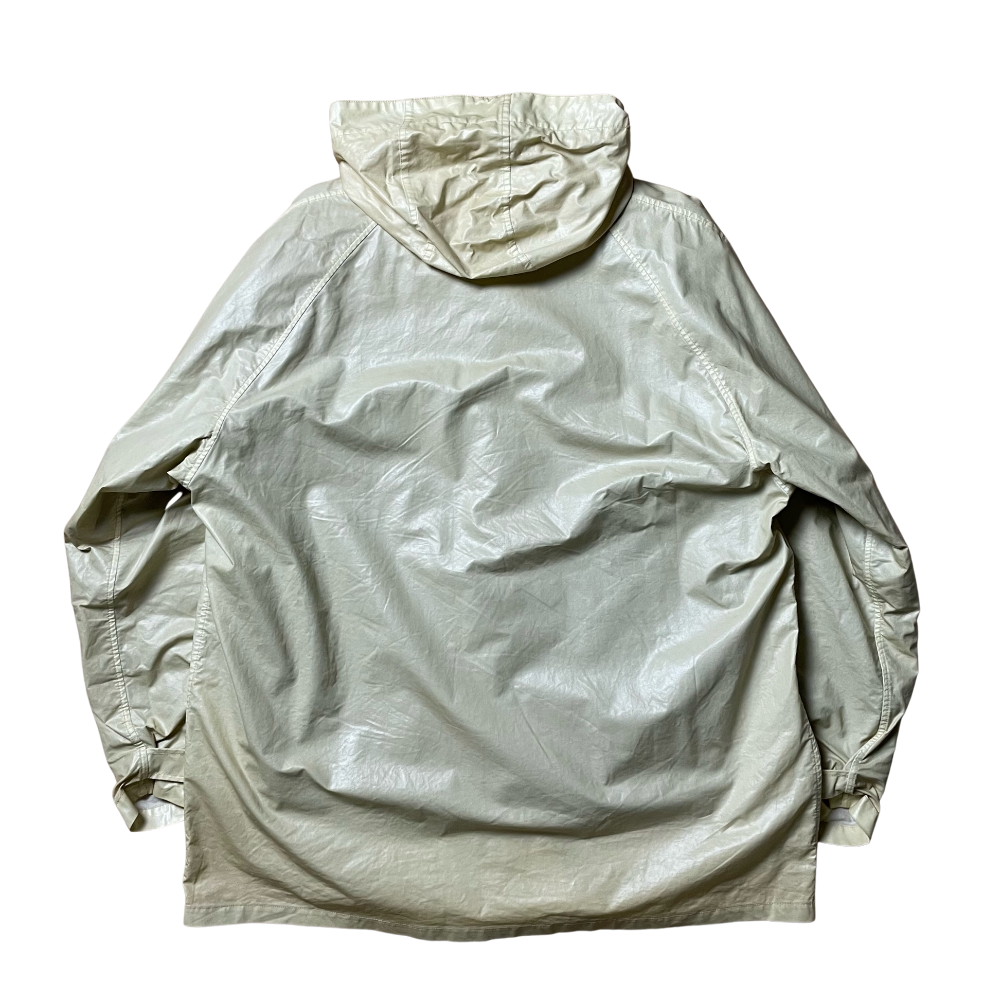 Designed by Massimo Osti. Glazed silk hooded parka. Elastic rope hood fastening, press stud cuff adjustments. Detachable wool liner. Large double pocket function. Finished with iconic branding features throughout. Cream colour way.