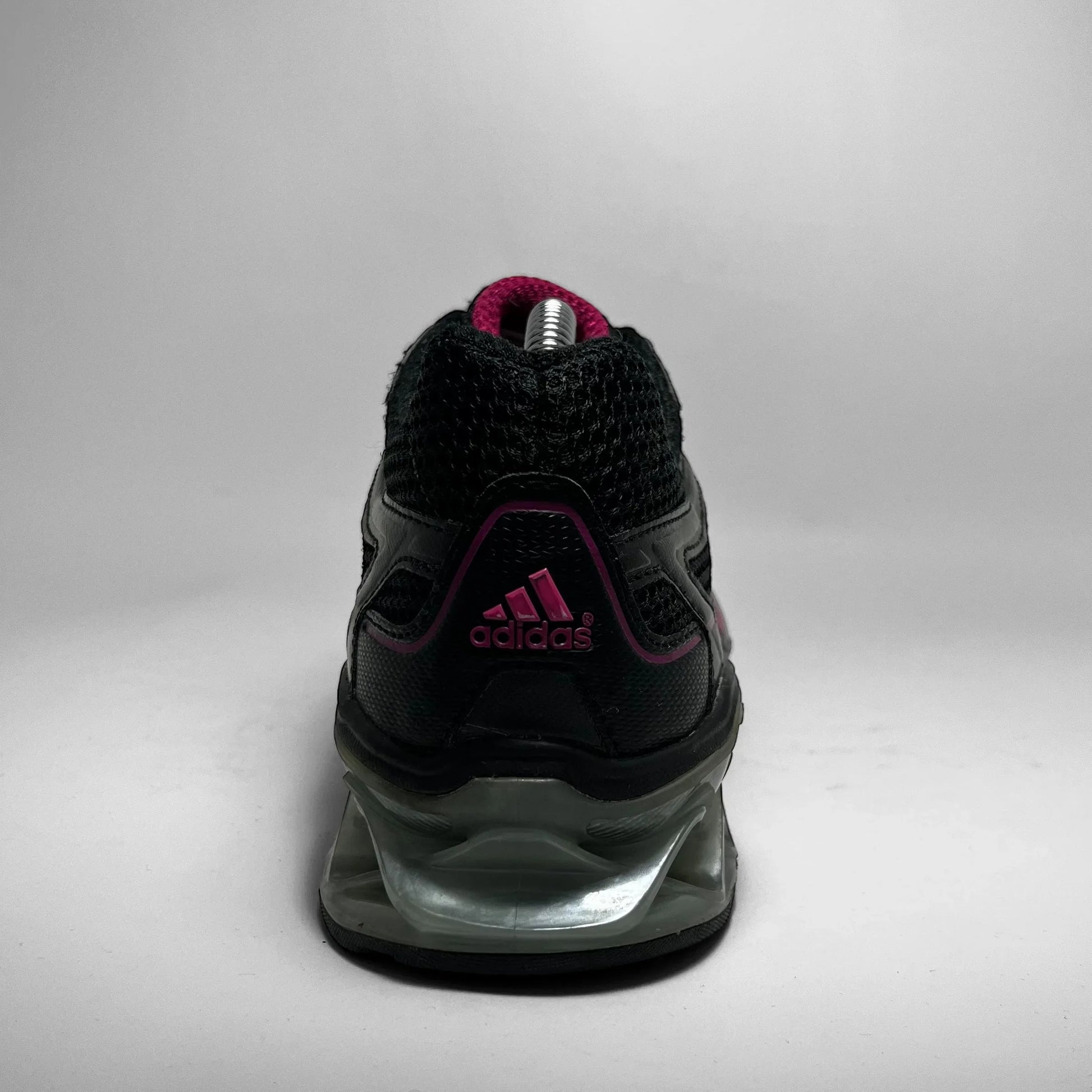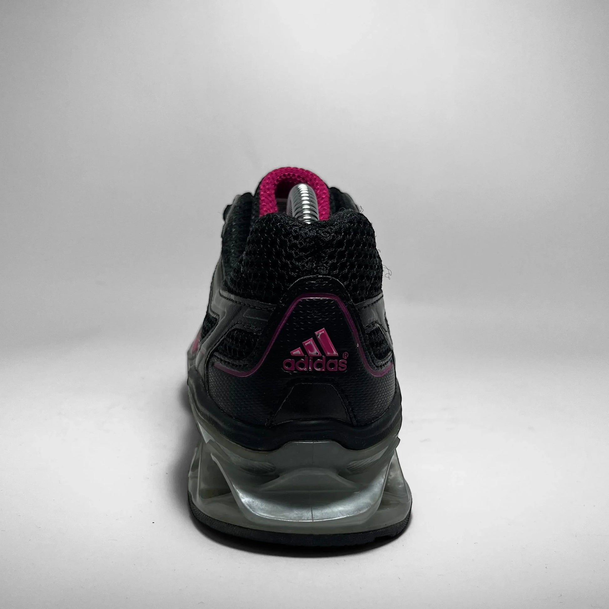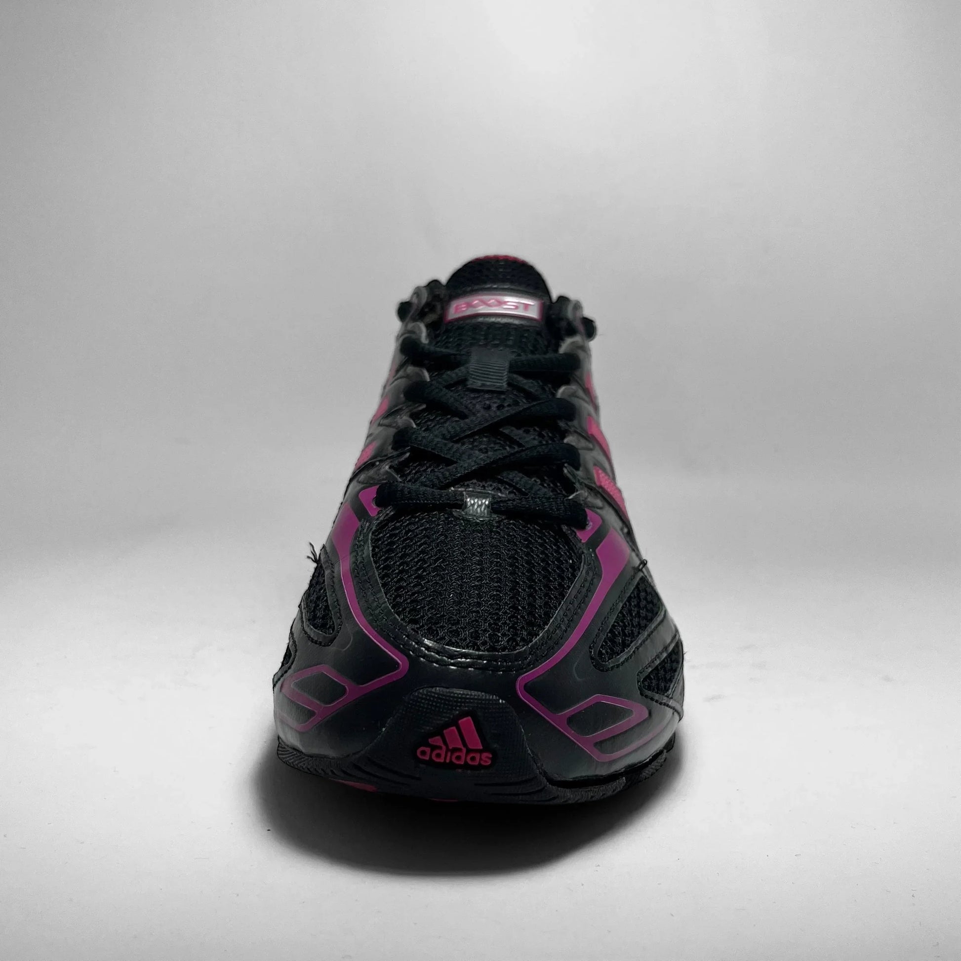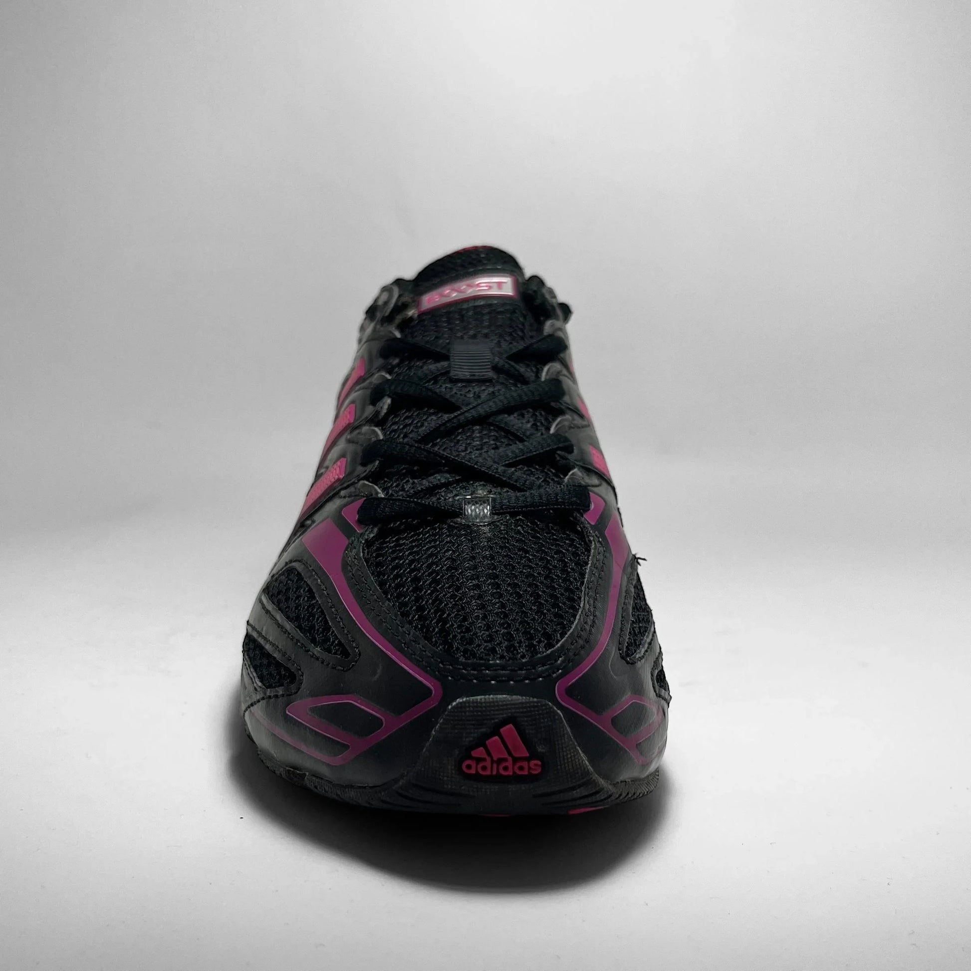 This is a rare Adidas Boost Bounce model from 2010, combining Bounce heel tooling with a molded structure and an early use of the "Boost" script—predating the official Boost launch in 2013. The shoe features a black mesh upper with synthetic overlays and magenta accents. Though not widely documented, it's a unique and obscure release from the era.