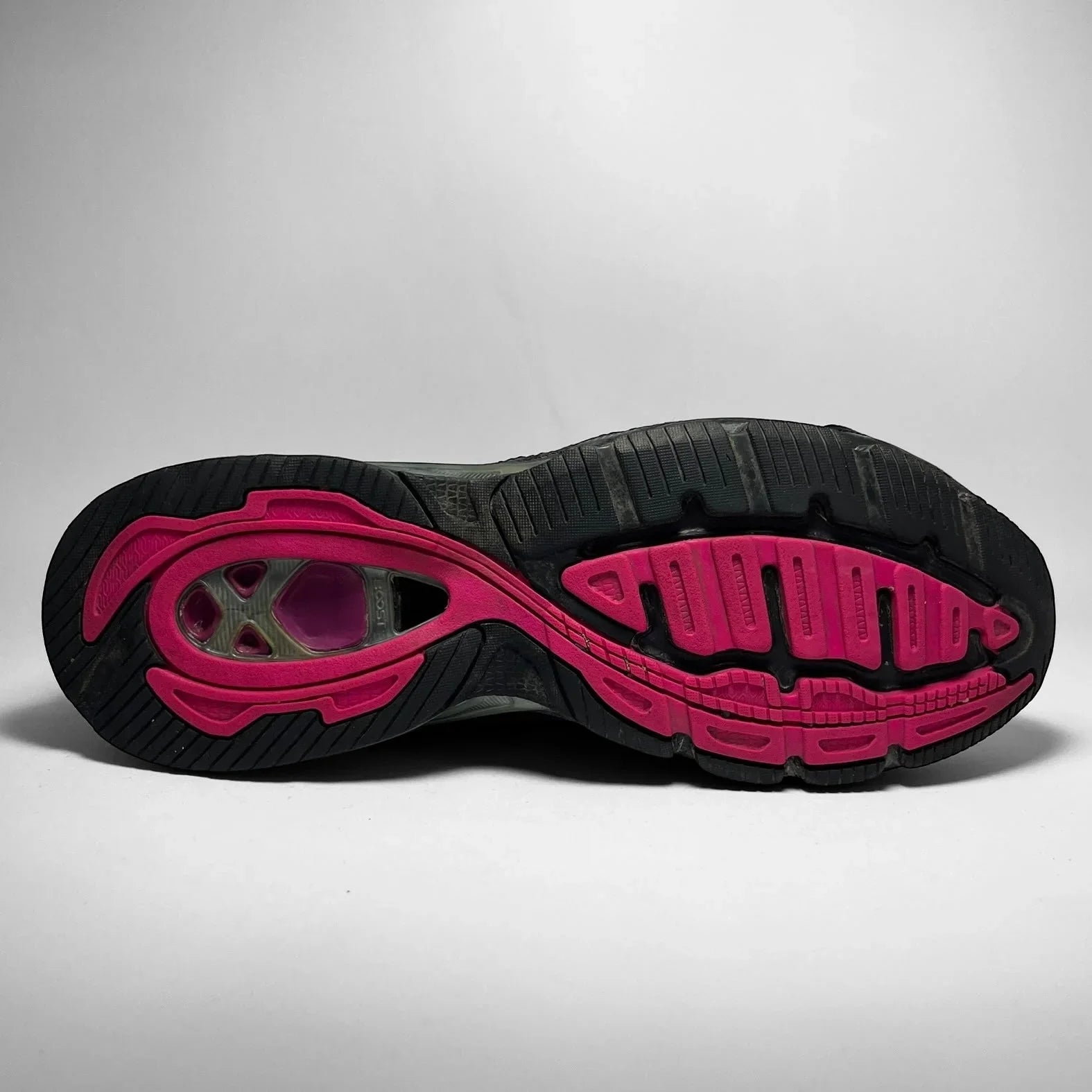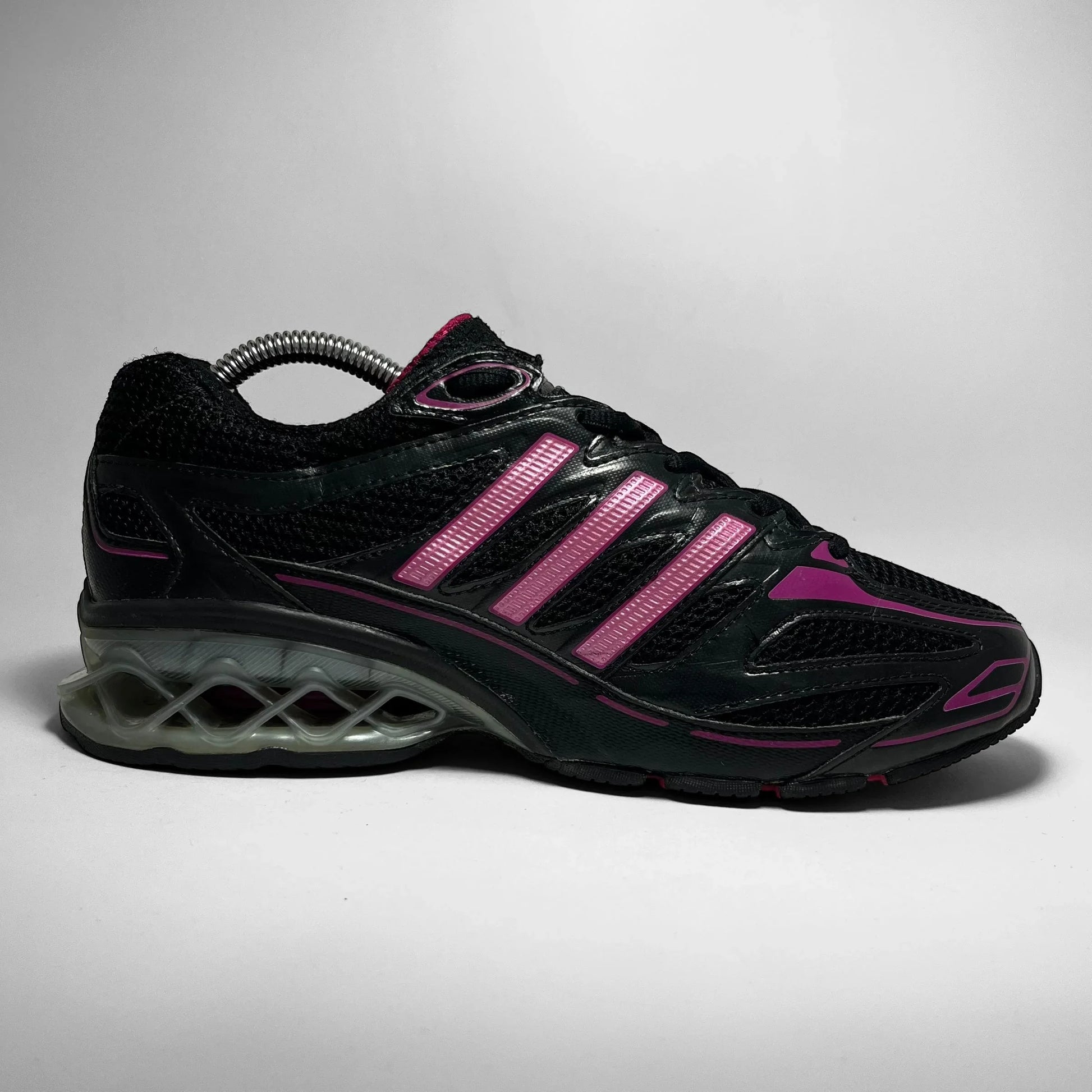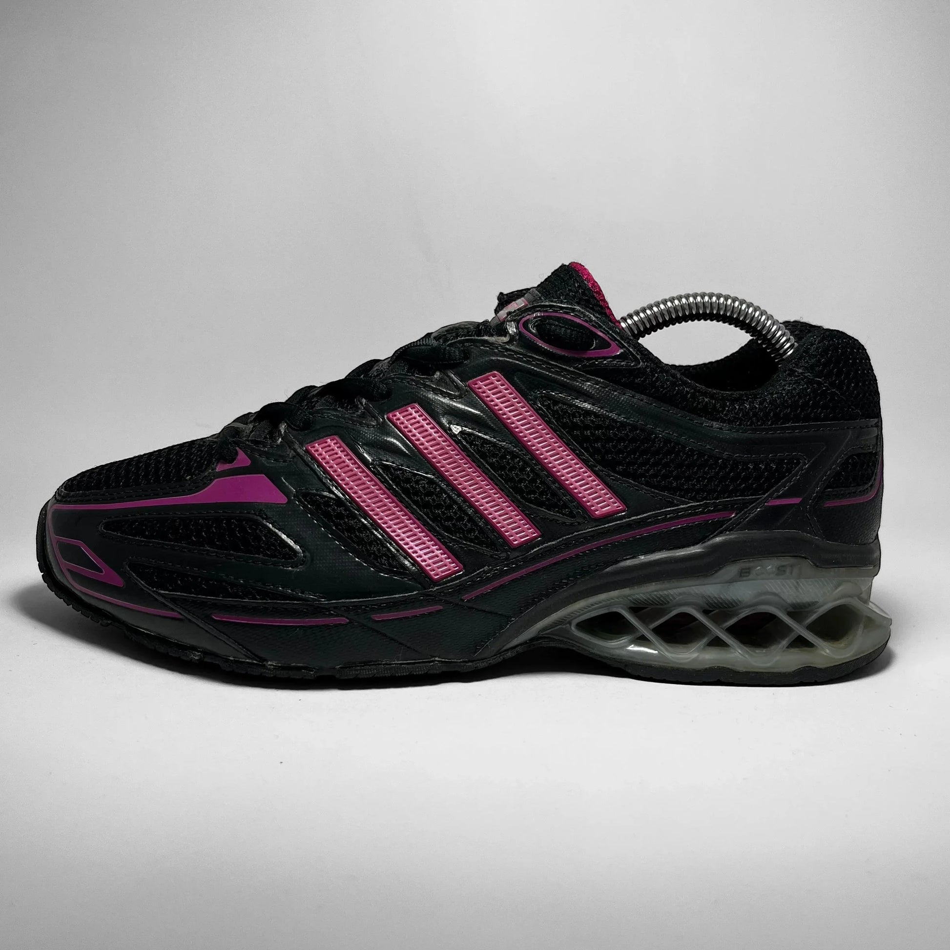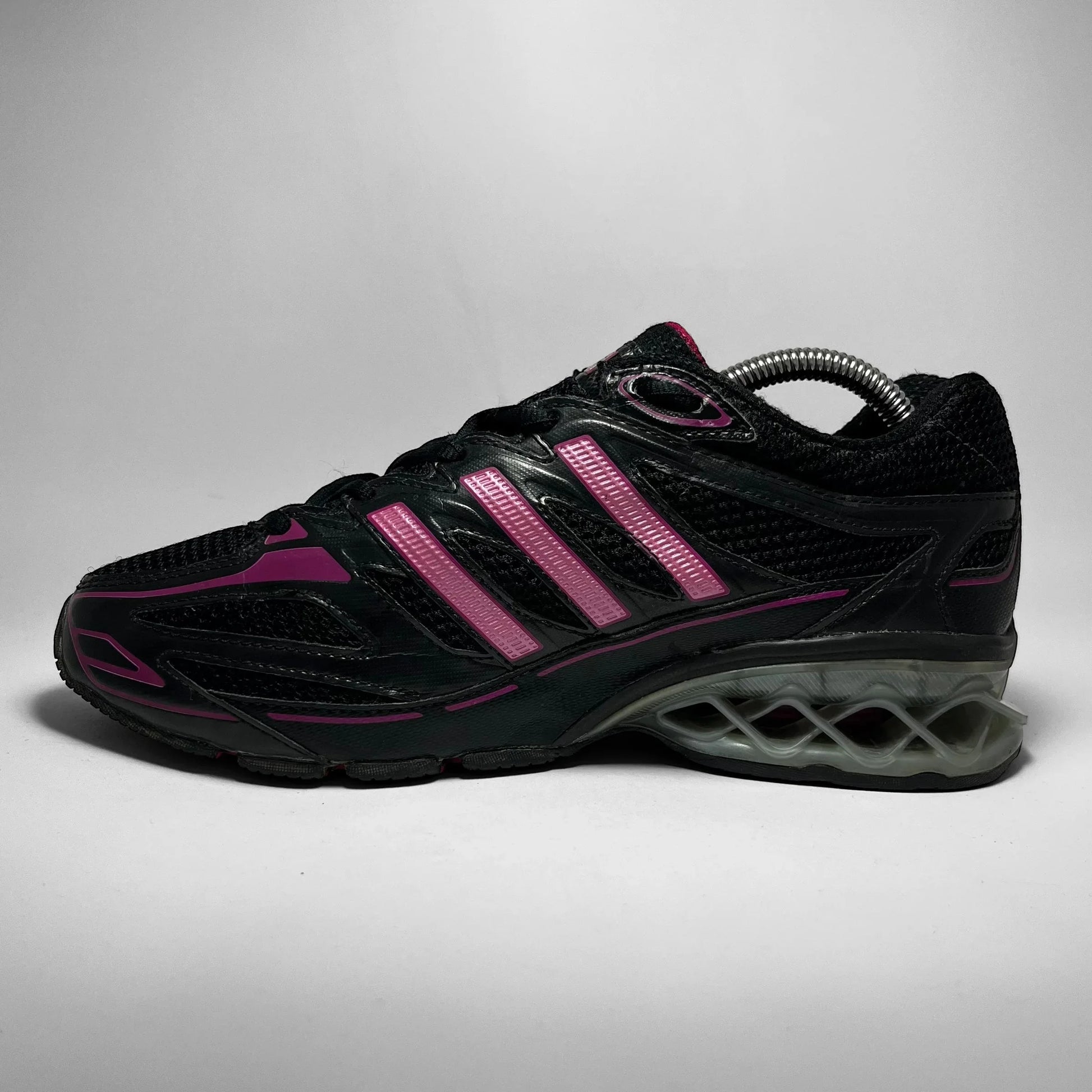 This is a rare Adidas Boost Bounce model from 2010, combining Bounce heel tooling with a molded structure and an early use of the "Boost" script—predating the official Boost launch in 2013. The shoe features a black mesh upper with synthetic overlays and magenta accents. Though not widely documented, it's a unique and obscure release from the era.