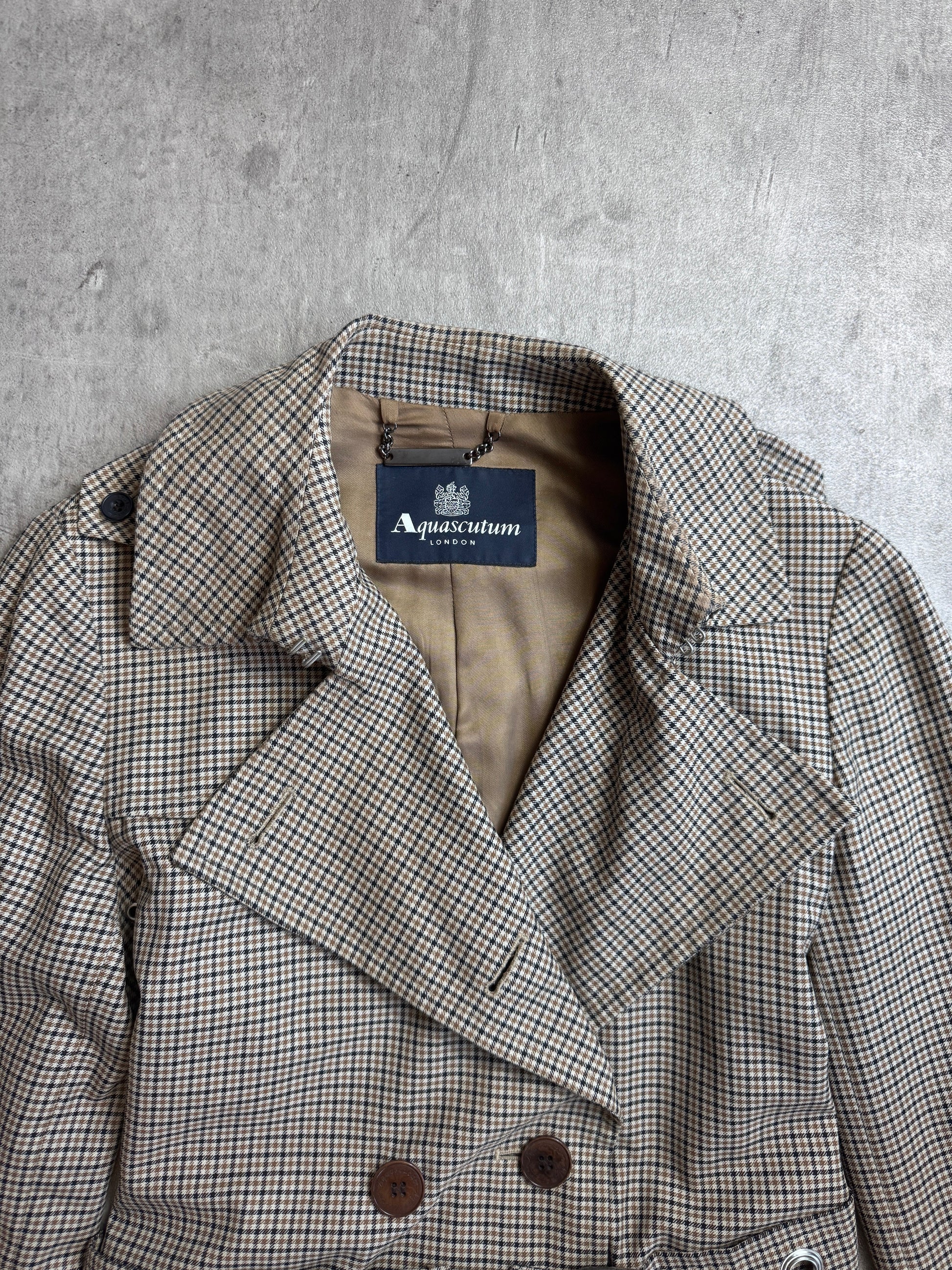 Featuring a double-breasted front, tailored fit, and the signature Aquascutum Club Check lining, it delivers timeless style with subtle luxury detailing. Ideal for collectors or anyone seeking refined, versatile outerwear.