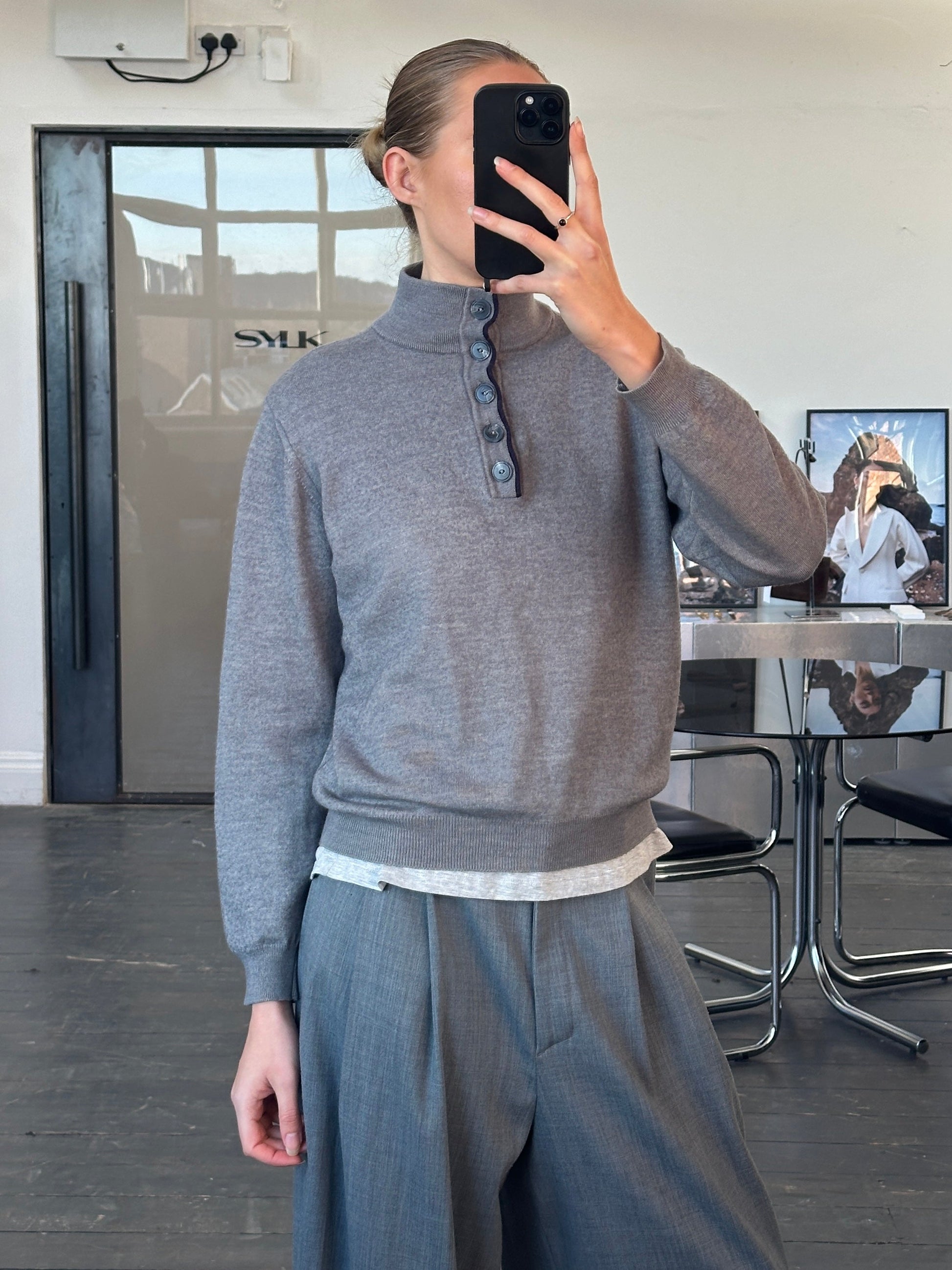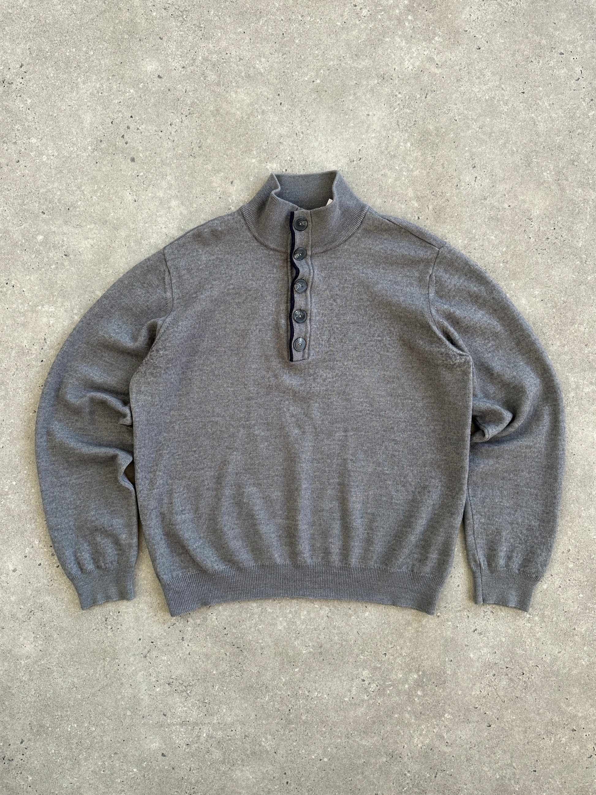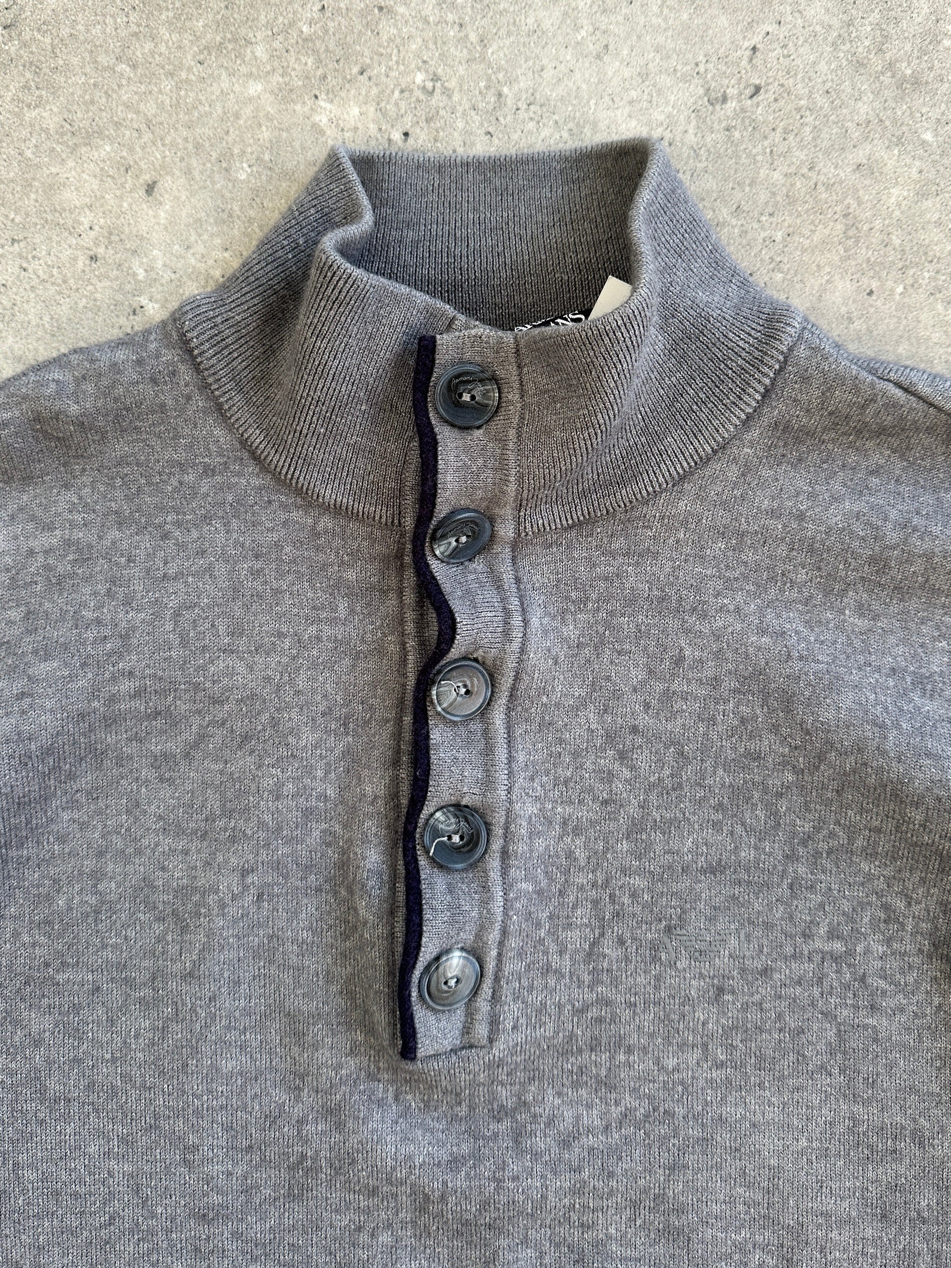 A grey 2000s Armani Jeans knit featuring a minimal button-neck detail and subtle navy trim. Clean and contemporary with a soft quiet-luxury feel.
