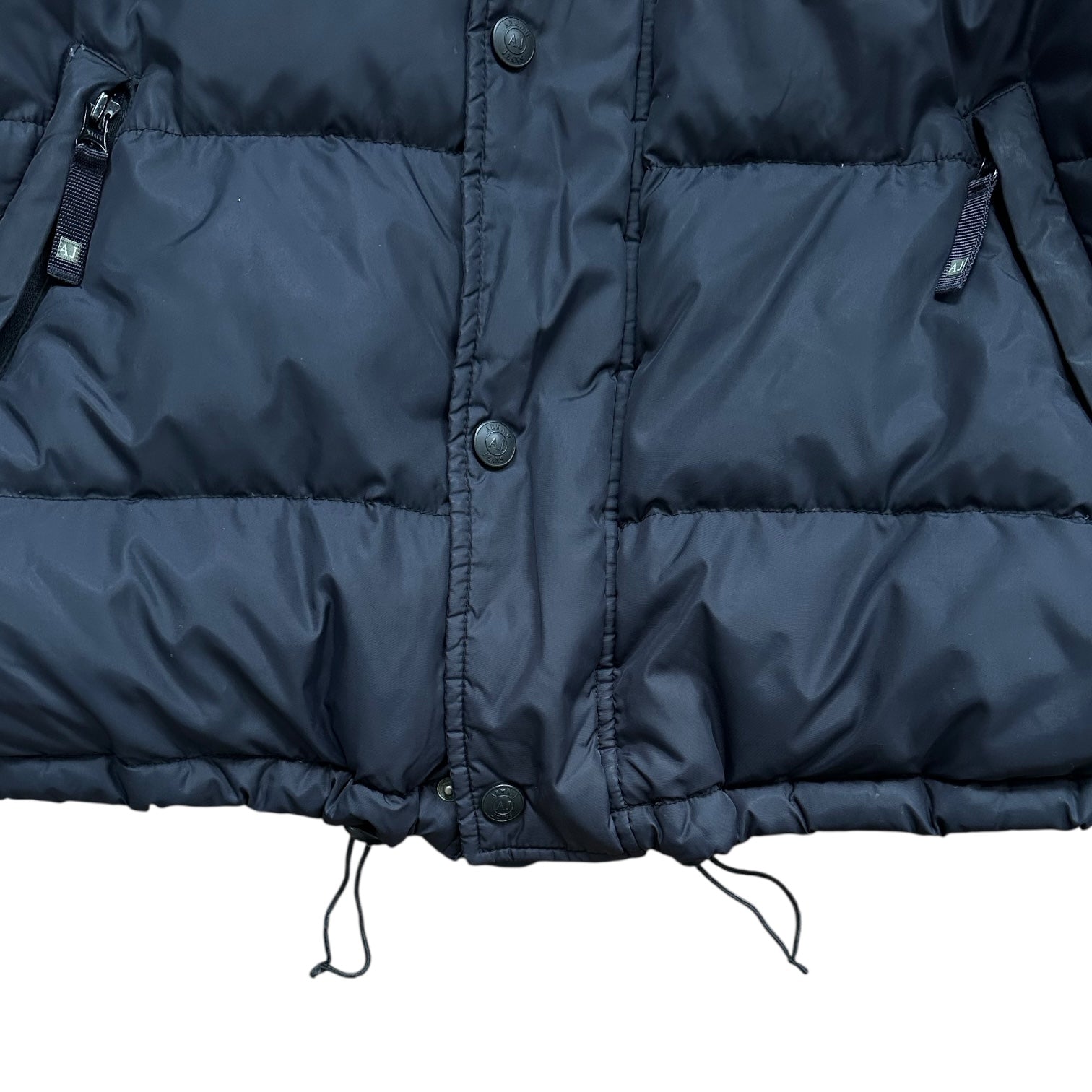 Armani Jeans Navy Blue Down Puffer Jacket. Vintage piece from the 2000s, classic shape with adjustable waist and hood. Inner features a ski skirt, perfect for the winter season!