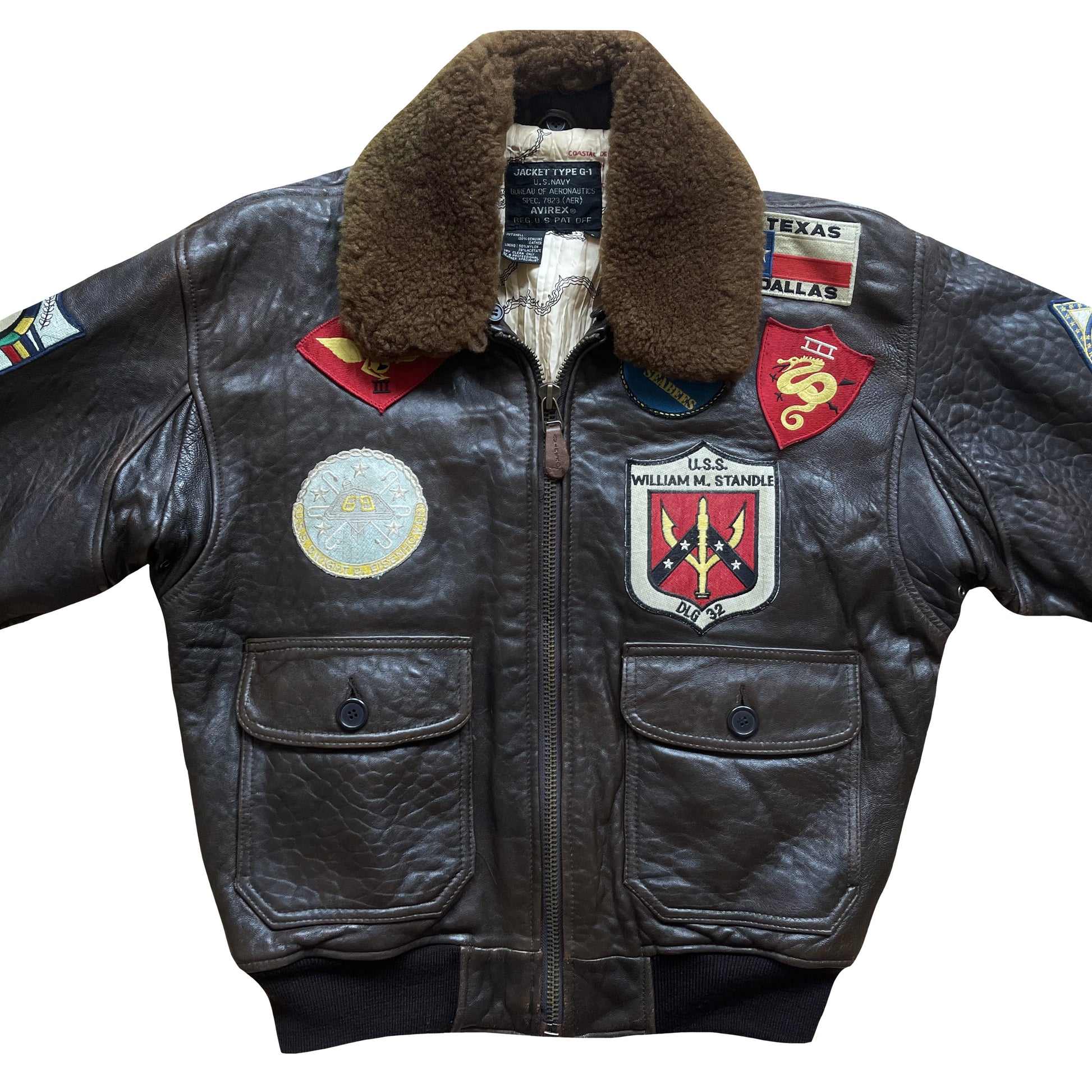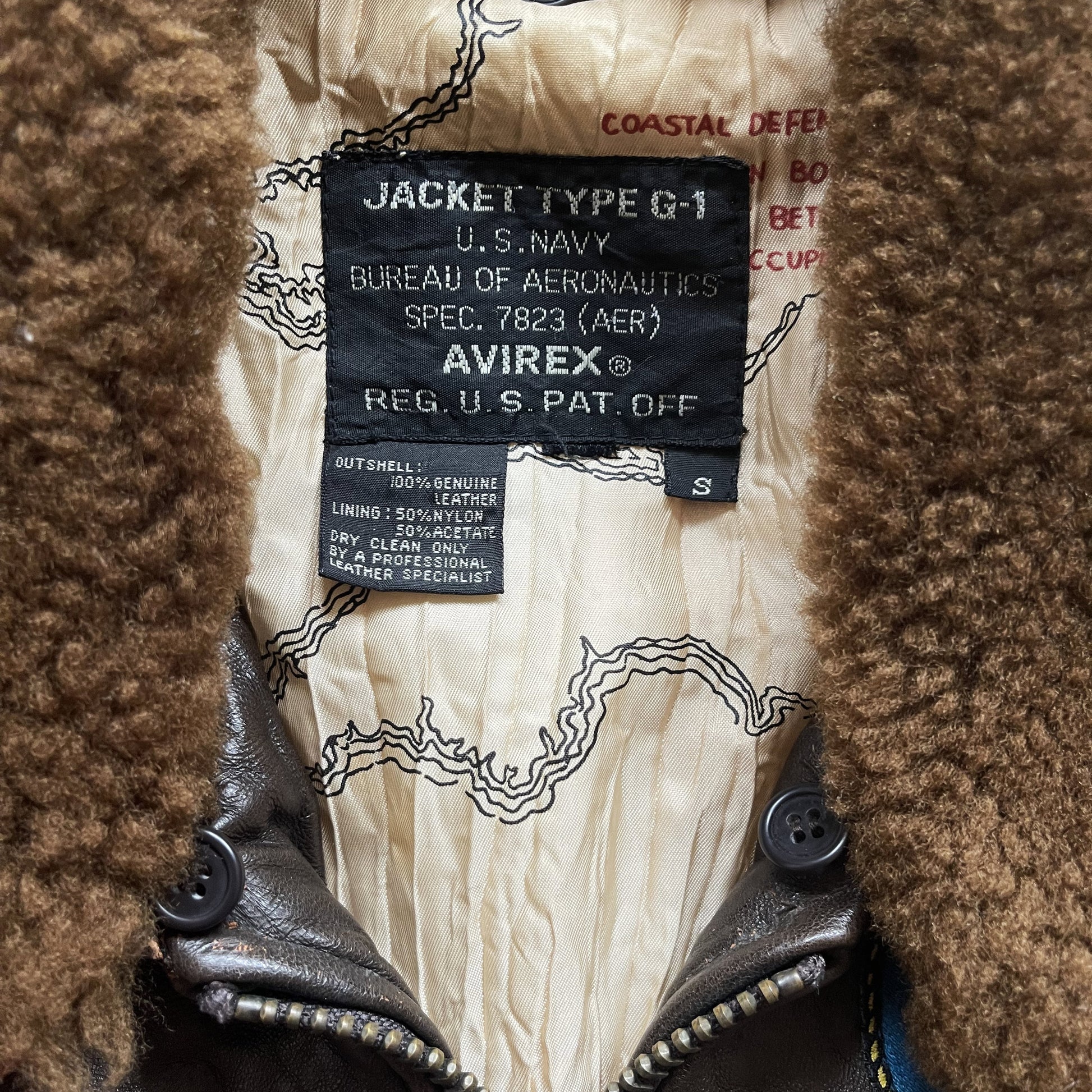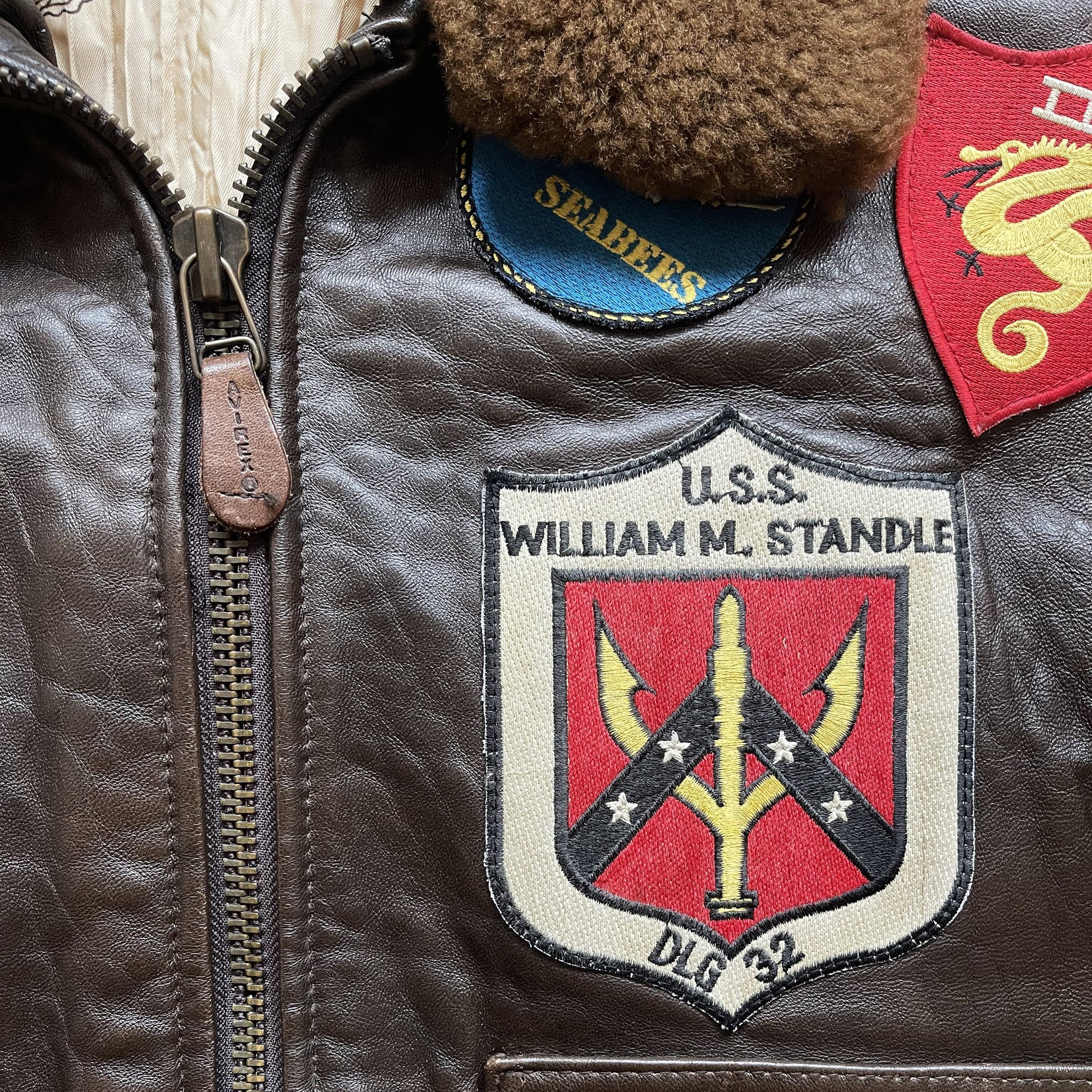 • The back side leather patch features the US Navy Galveston Far East Cruise 63-4 era, the first release of the Avirex G-1 flight leather jacket.