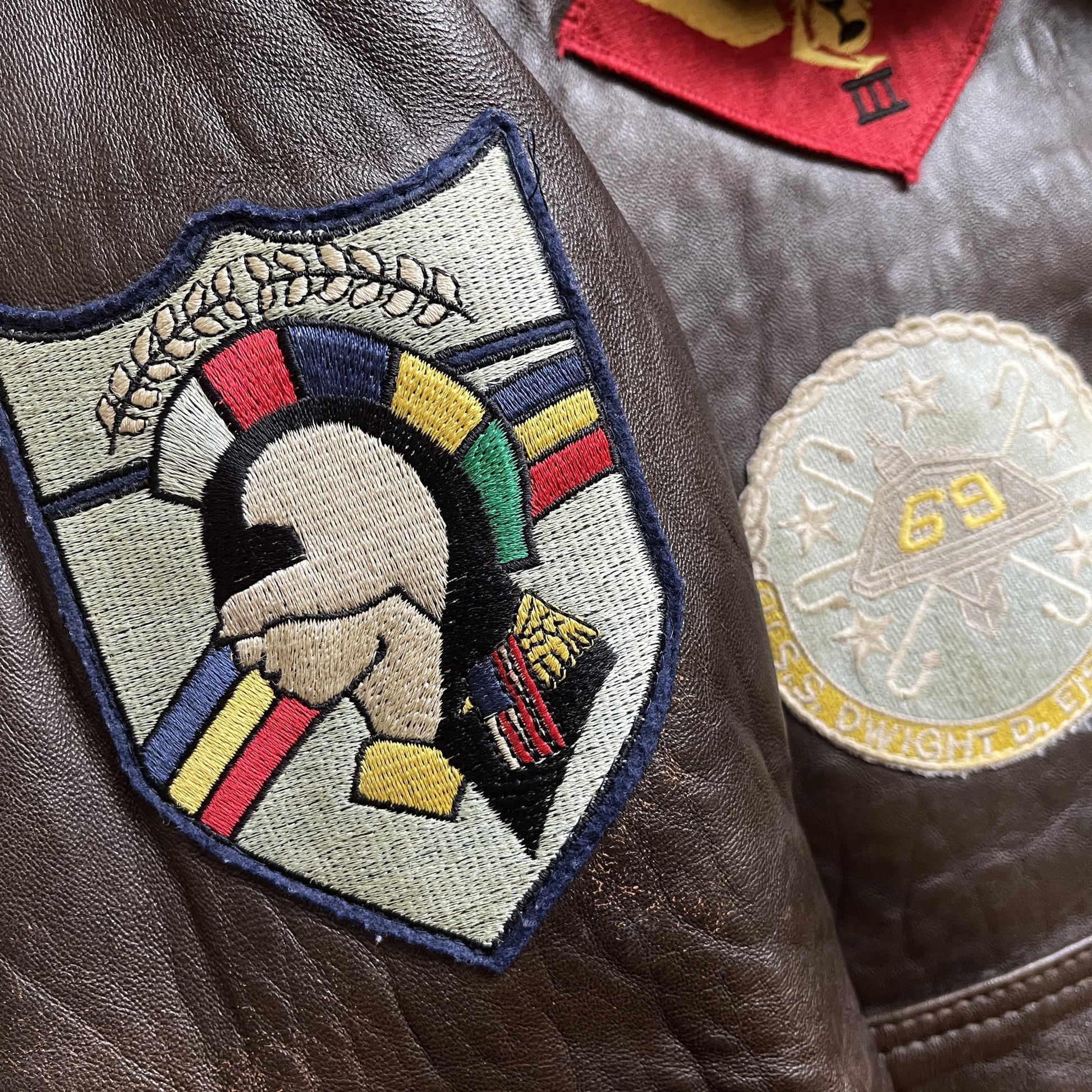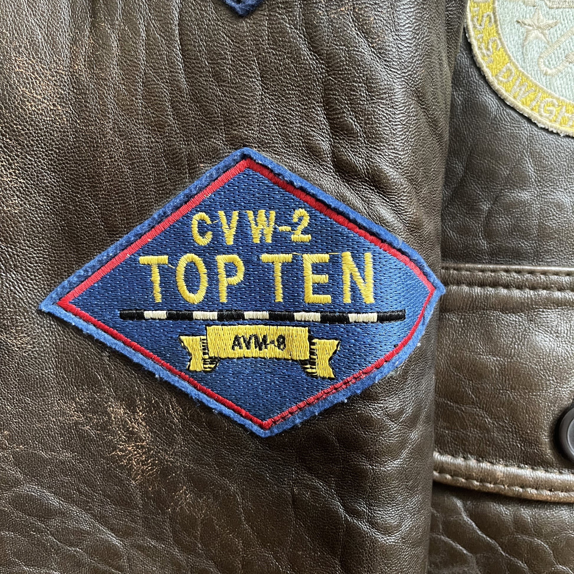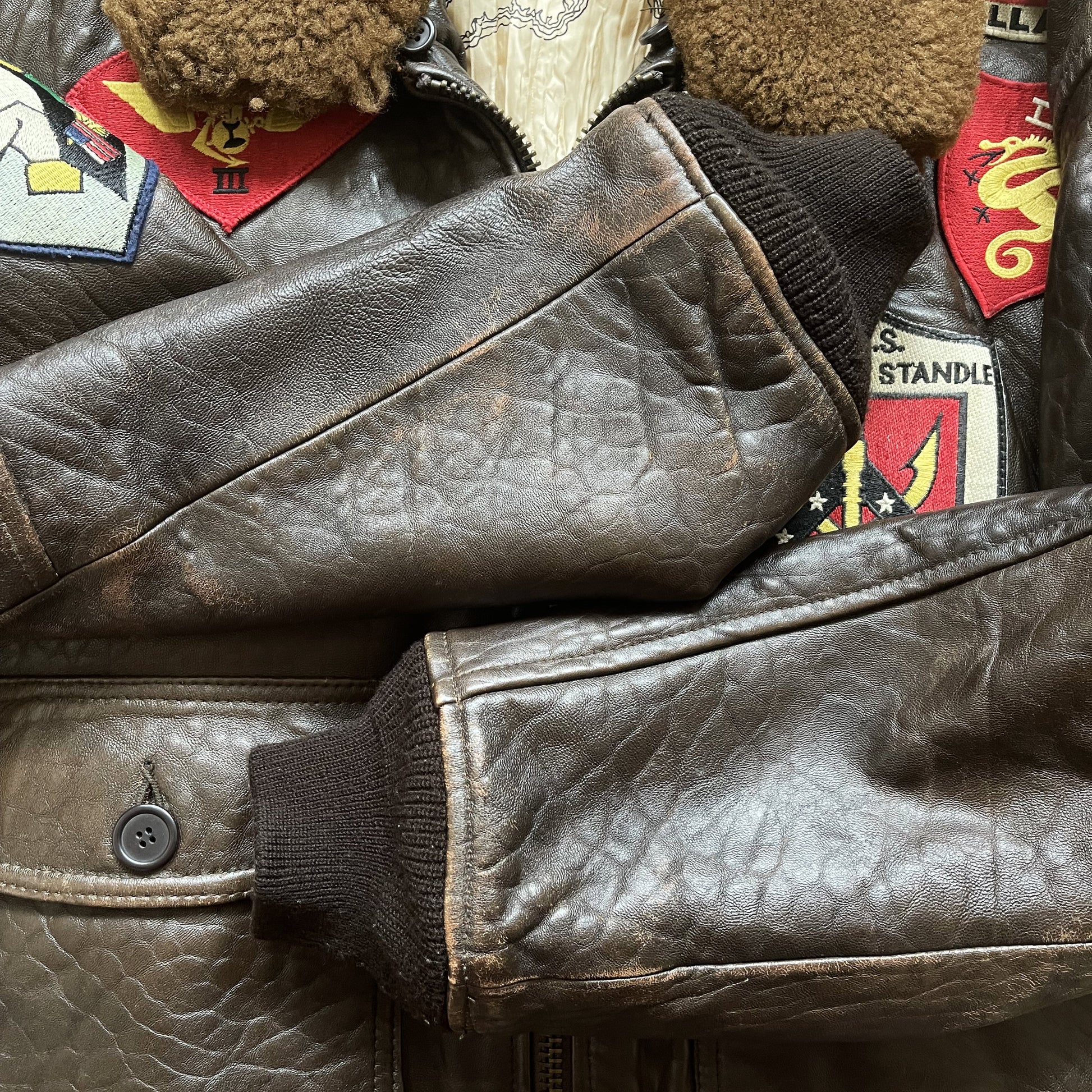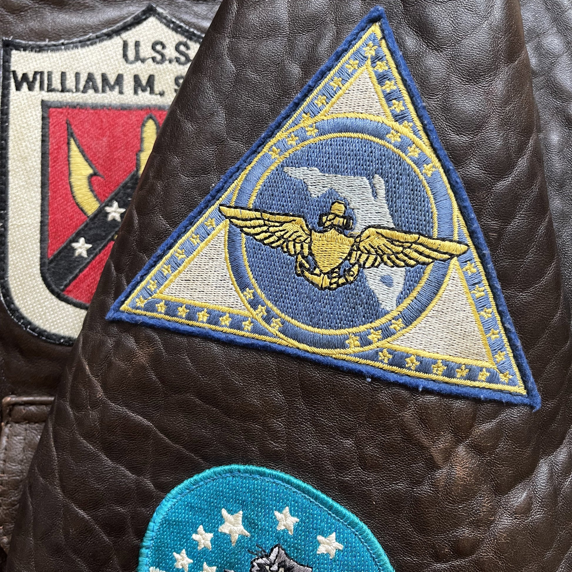 • The back side leather patch features the US Navy Galveston Far East Cruise 63-4 era, the first release of the Avirex G-1 flight leather jacket.