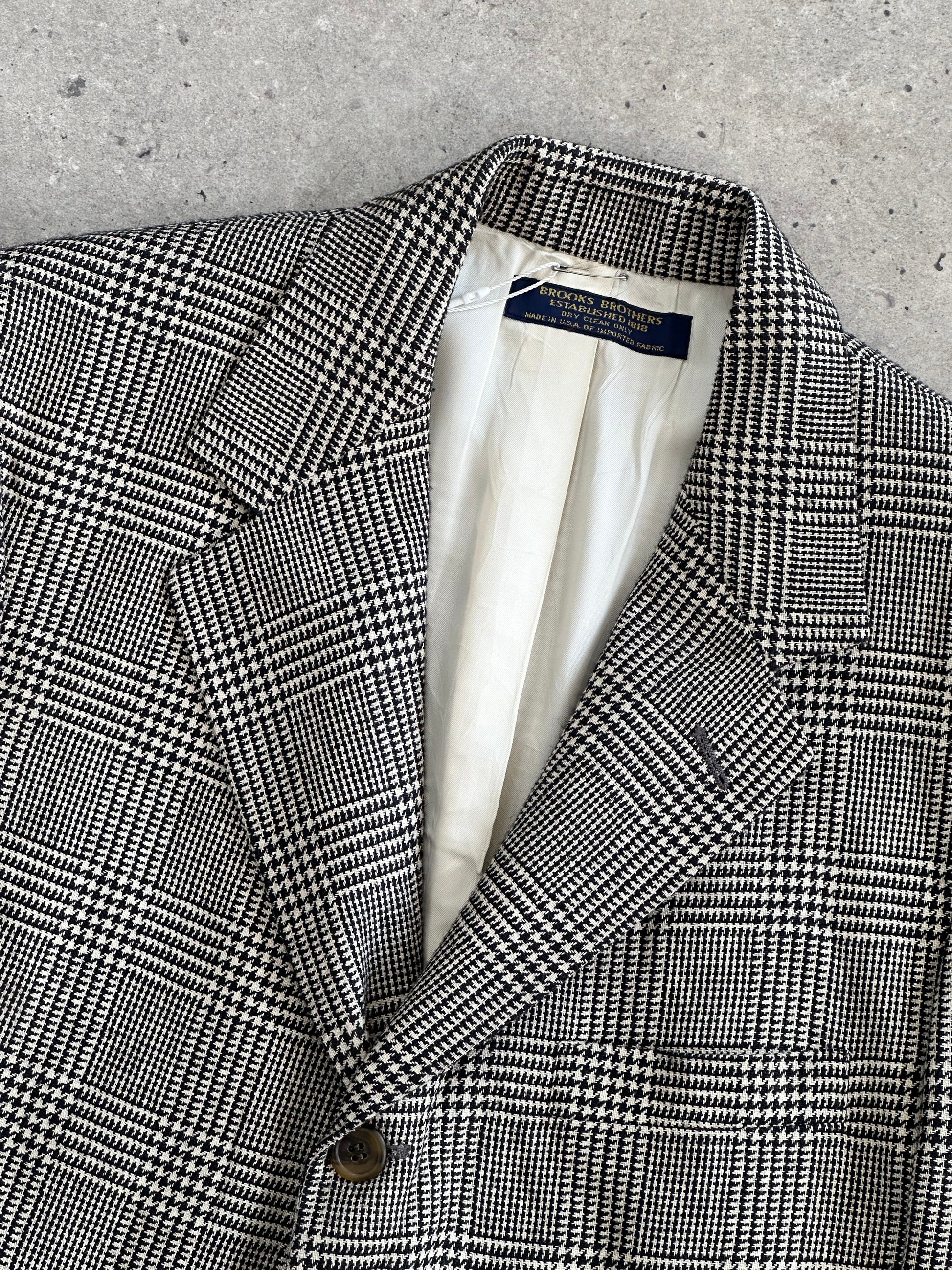 A classic 1990s Brooks Brothers single breasted blazer in a refined black and beige check, featuring a 100% silk lining, softly structured silhouette and traditional American tailoring.