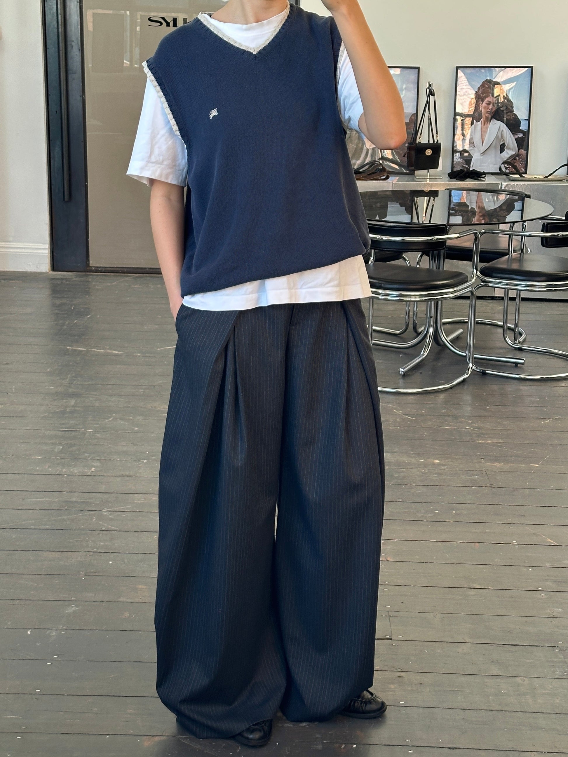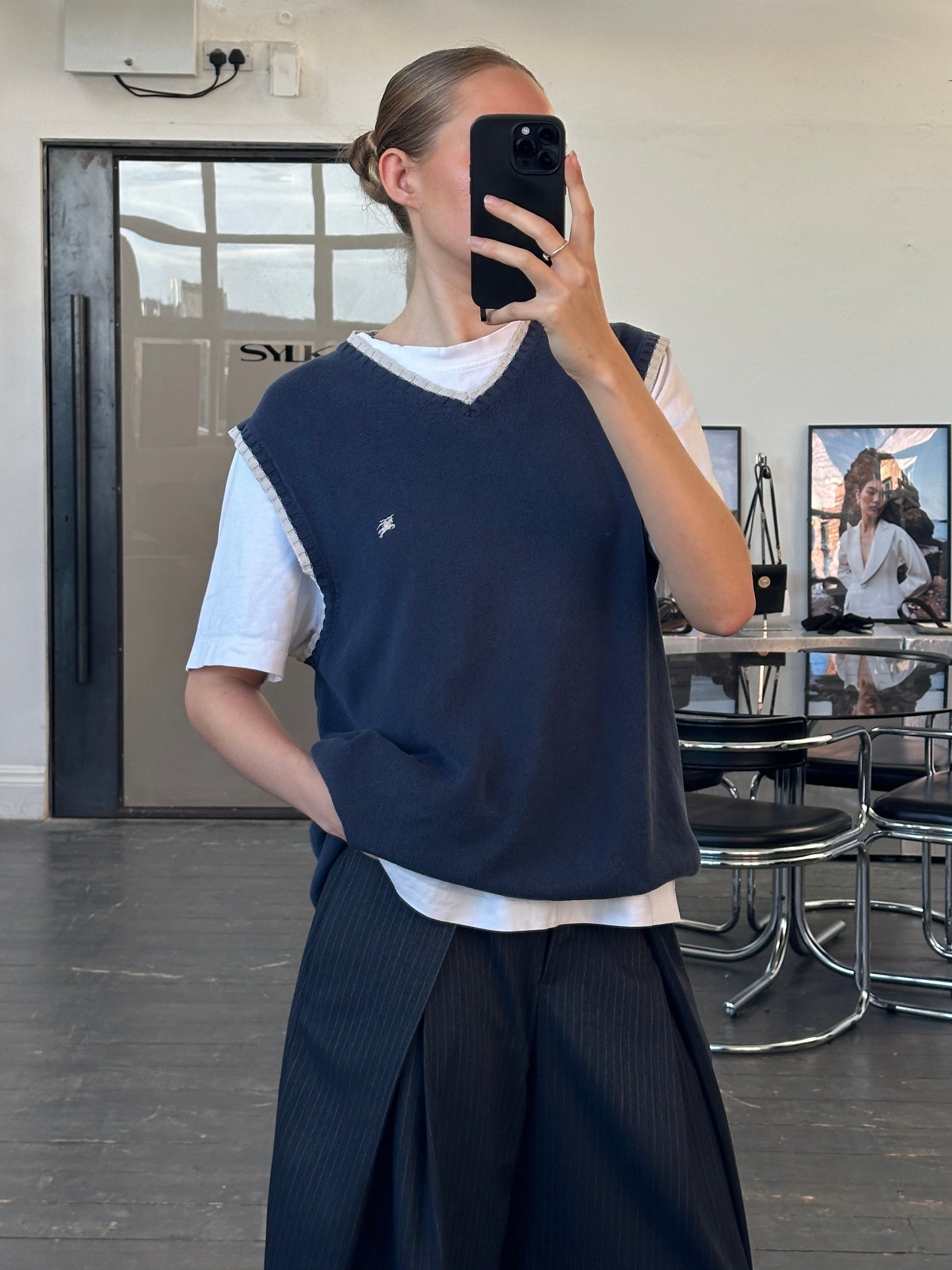 Burberry 1990s lightweight blue knitted vest with a soft handle, featuring contrast white ribbed trim and subtle Equestrian Knight logo embroidery.