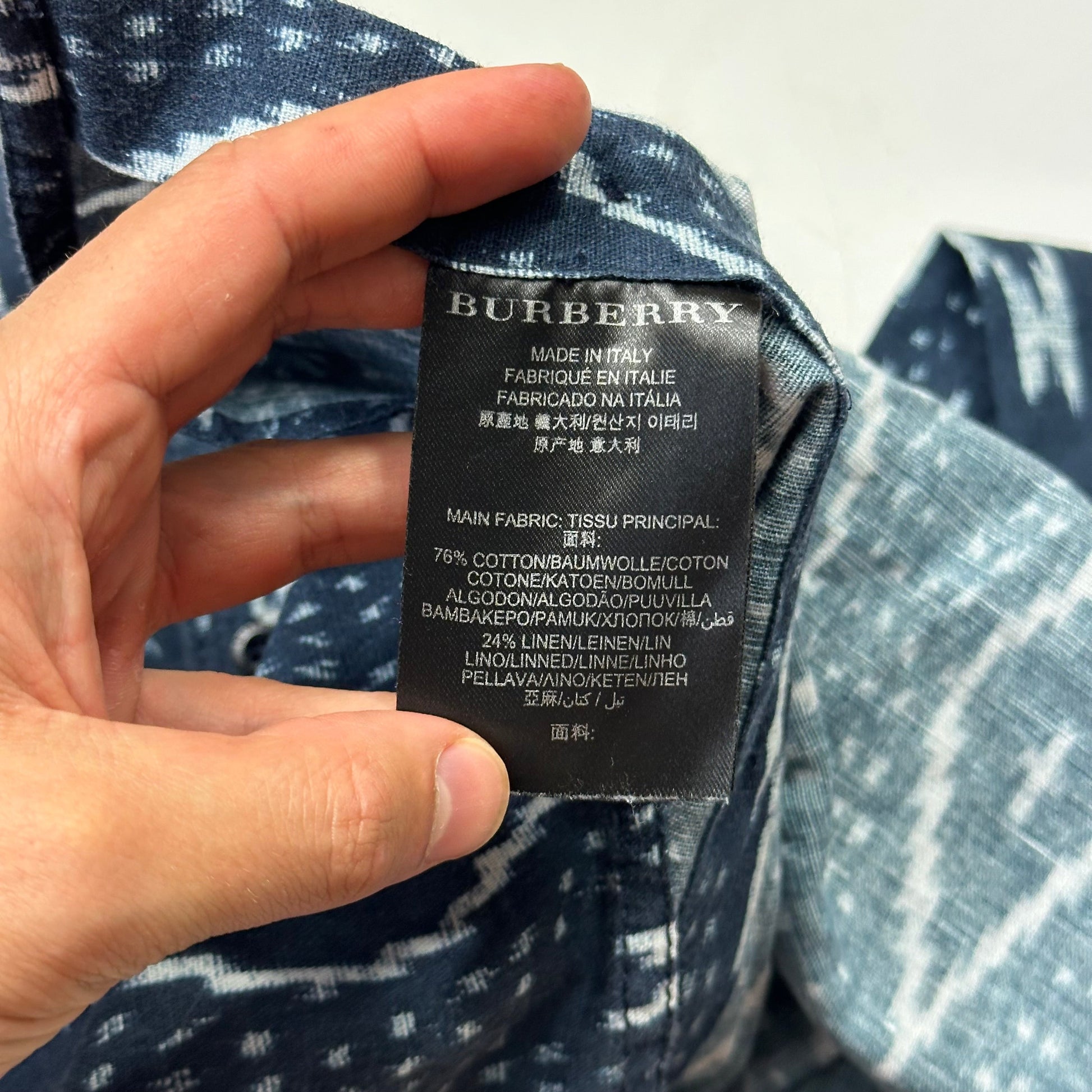 Extremely rare Burberry Prorsum Ikat print collared long sleeve shirt, from Burberrys incredibly expensive Prorsum line with a retail of around £1100, beautiful cotton linen blend material in blue Ikat print as seen throughout the 2012 runway.