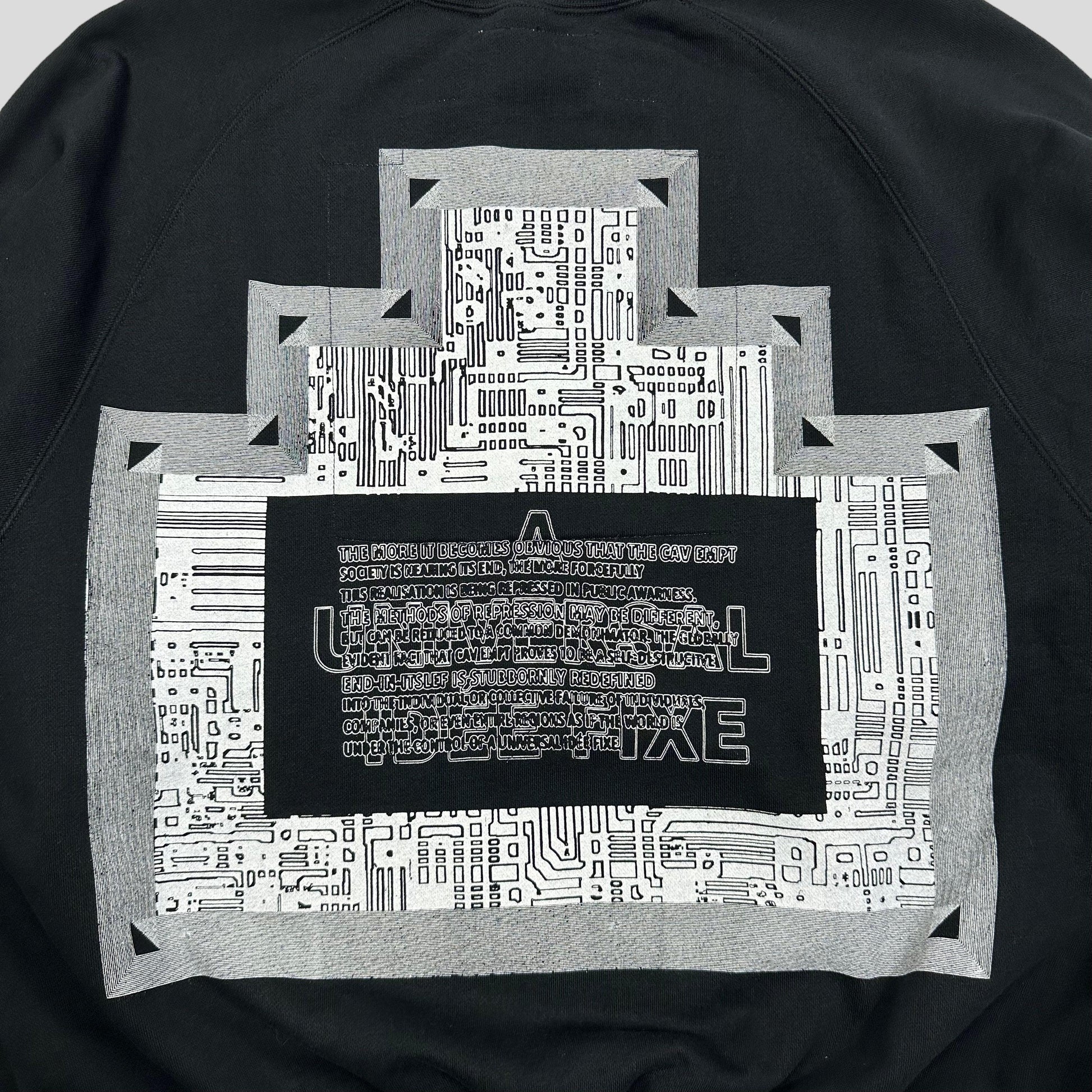 Cav Empt 2016 Idee Fixe Big Crewneck, signature logo patch to the arm, unique ziggurat graphic on the back, black crewneck, very oversized and boxy fit with raglan sleeves.