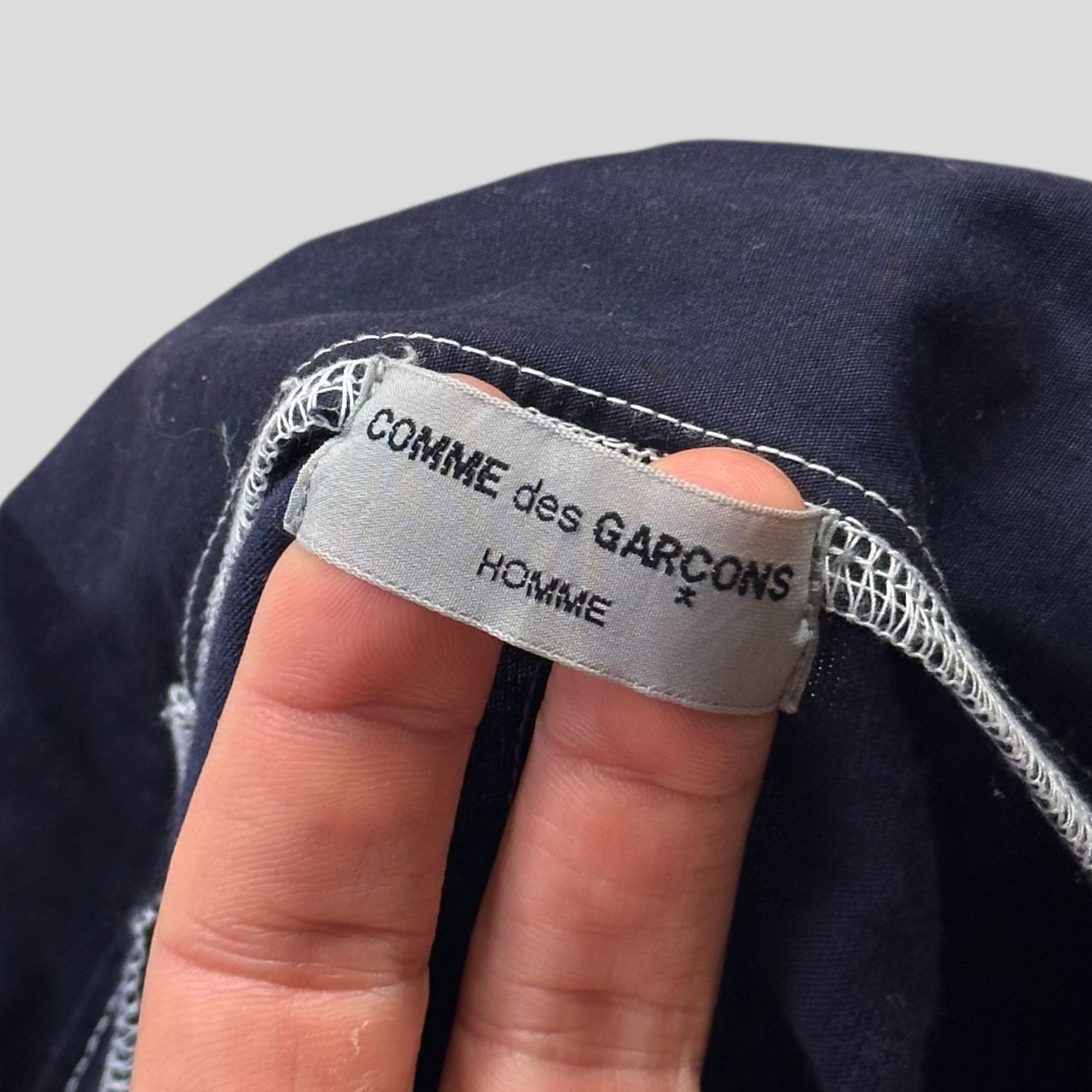 Very rare Comme Des Garçons Zip-up cotton boxy navy shirt with white contrast stitch and zip detailing, hand pockets to the front, subtle contrasting textured collar, beautiful vintage piece.