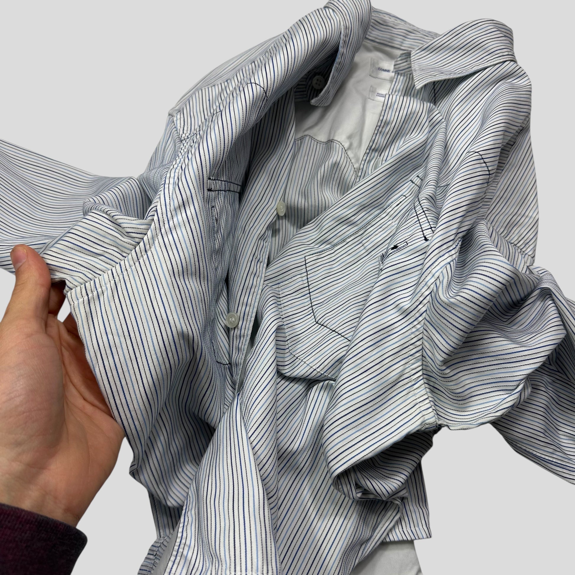 Very rare 2000’s Comme Des Garçons SHIRT line white long sleeve cotton shirt with embroidered stripes all over, pockets to chest, shirt is reversible and turns into a white body shirt with striped arms and chest pockets.