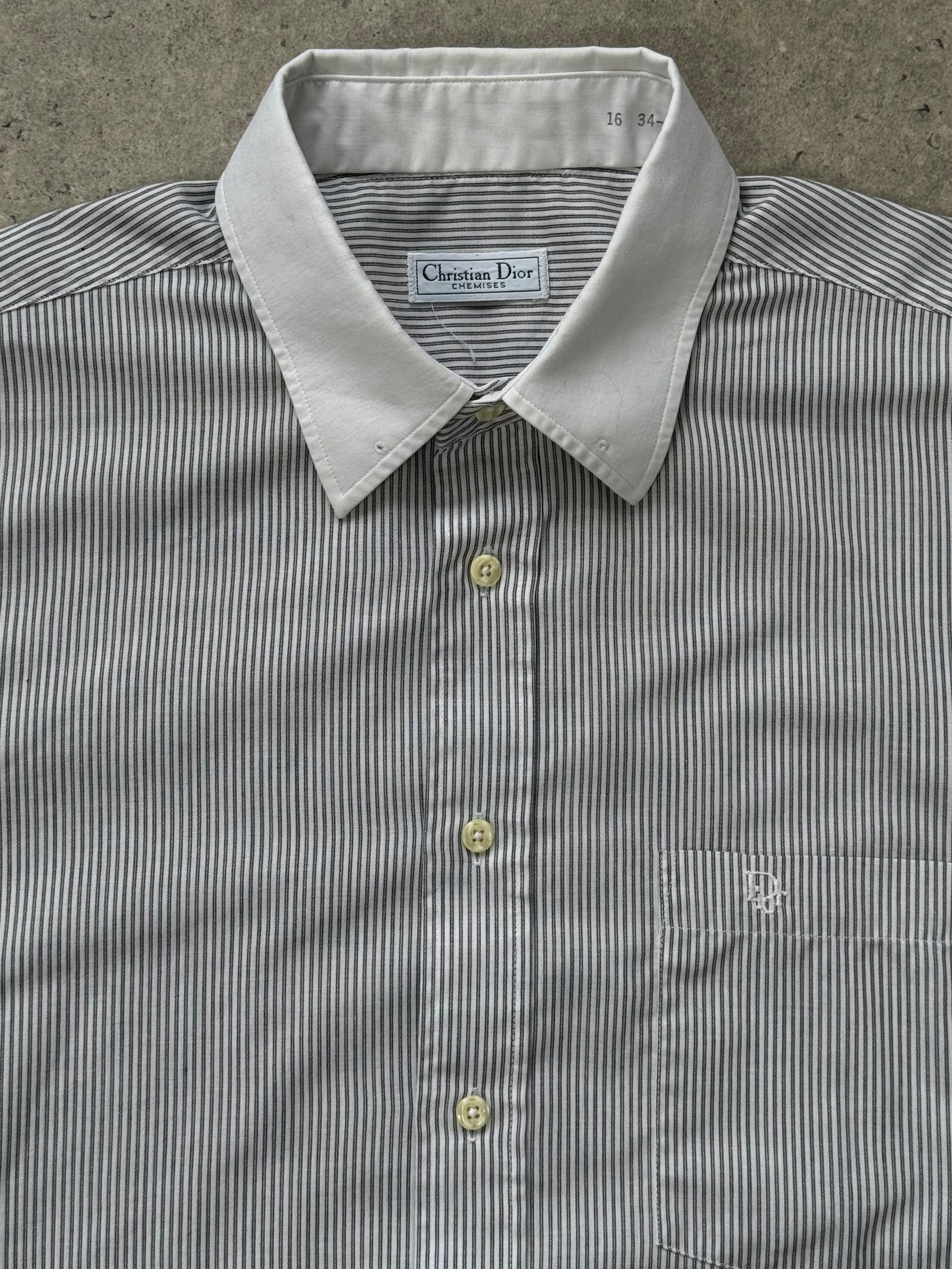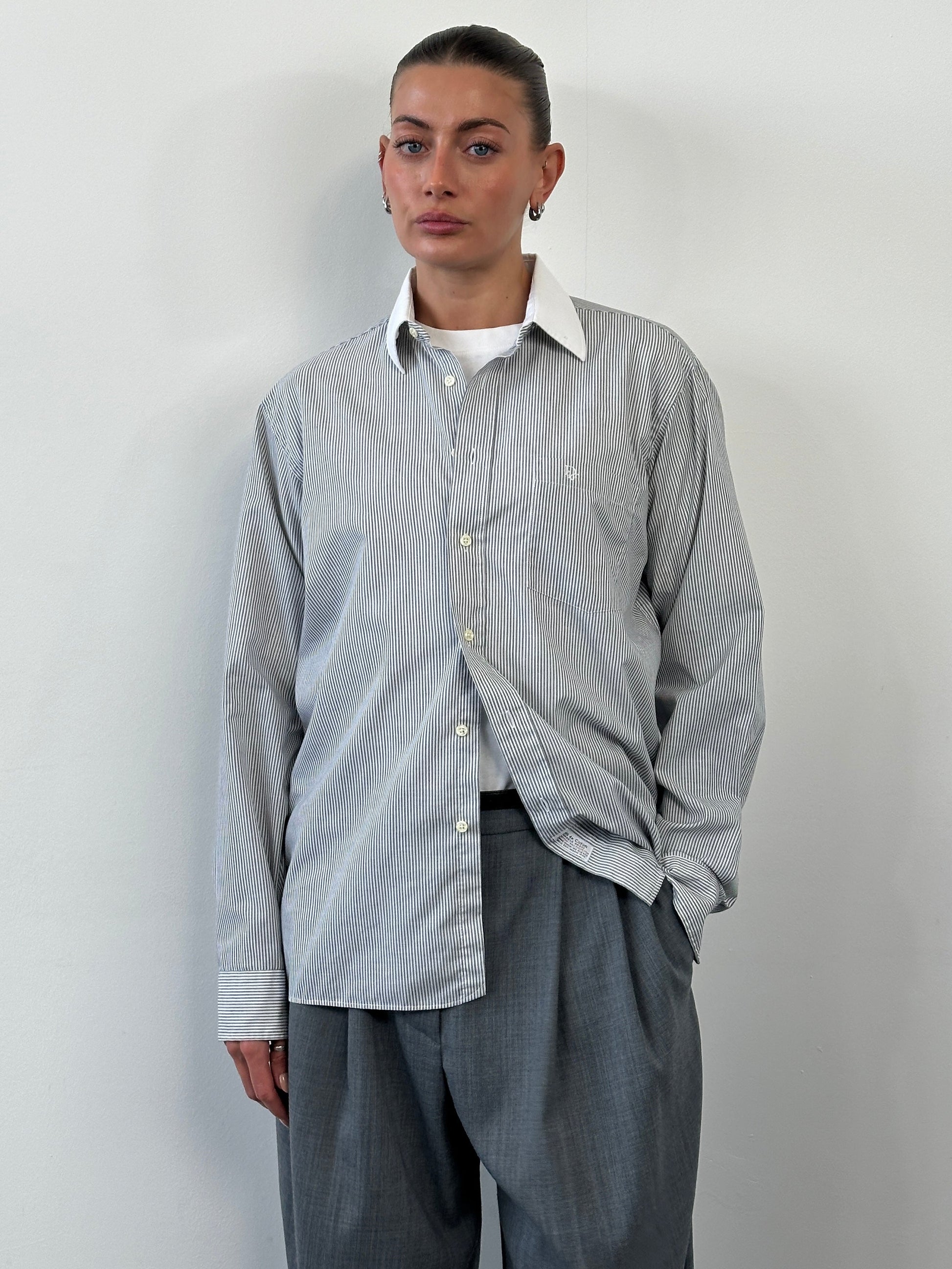 A vintage Christian Dior Chemises 1990s striped shirt in grey and white cotton with subtle embroidered chest detail. Designed with a classic point collar, full button front and softly structured silhouette in durable cotton blend shirting.