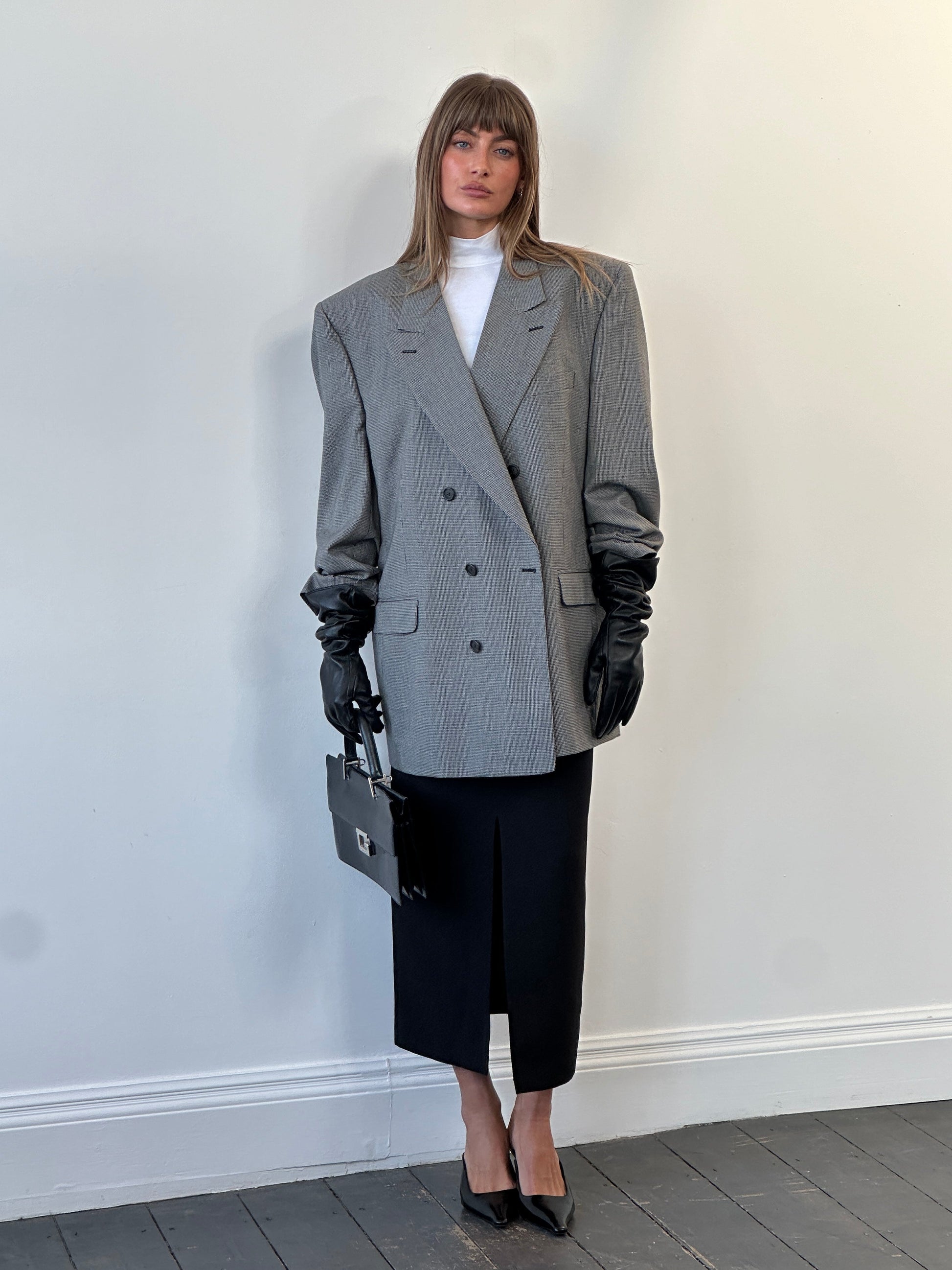 Vintage 1980s Christian Dior Monsieur blazer in a classic grey houndstooth pattern, tailored in the USA from pure wool. The double breasted cut and sharp peak lapels give this piece a refined, heritage-inspired silhouette.