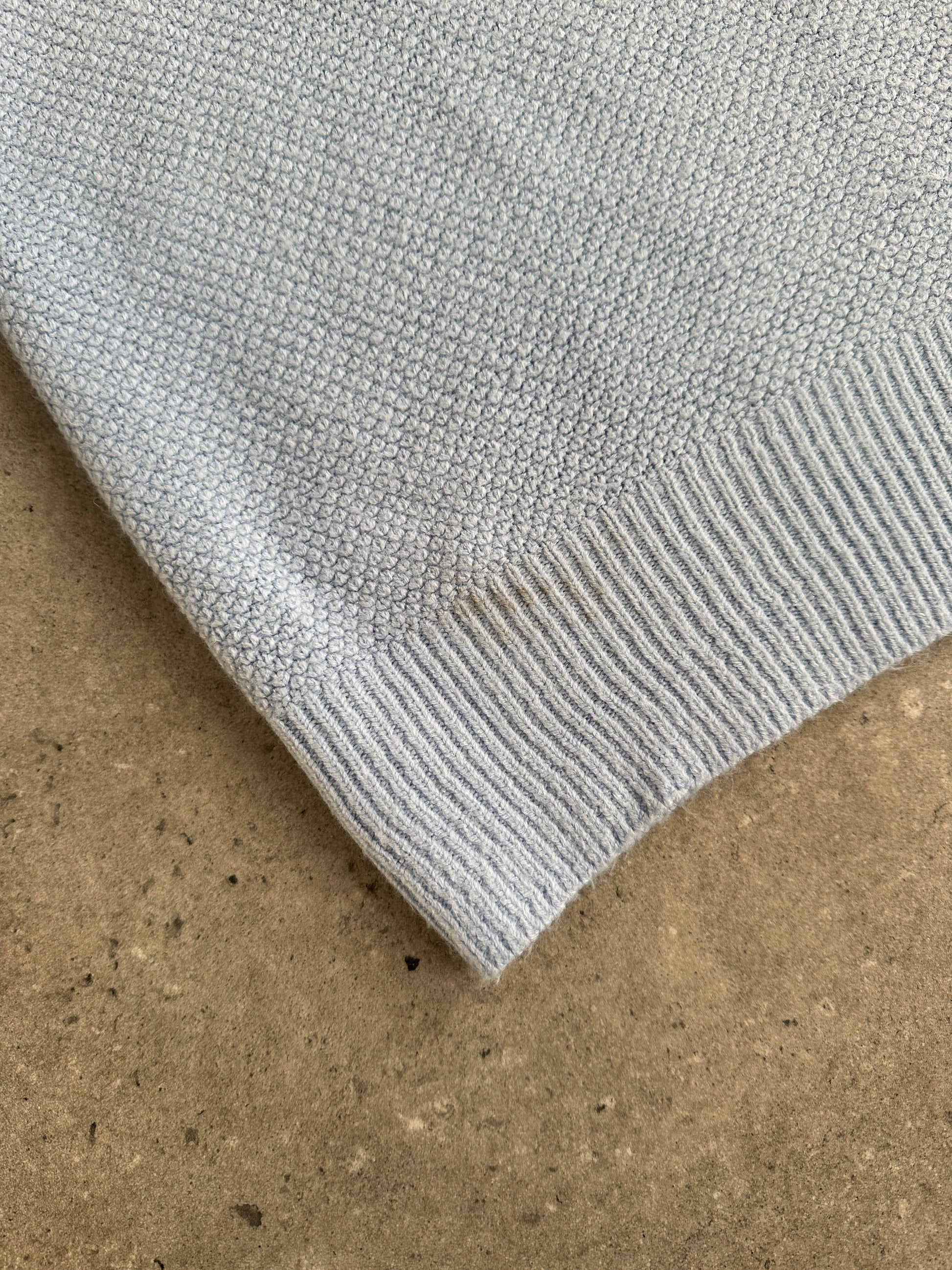 A soft light blue 1980s Christian Dior V-neck jumper, detailed with subtle chest embroidery and ribbed trims. Lightweight and versatile.
