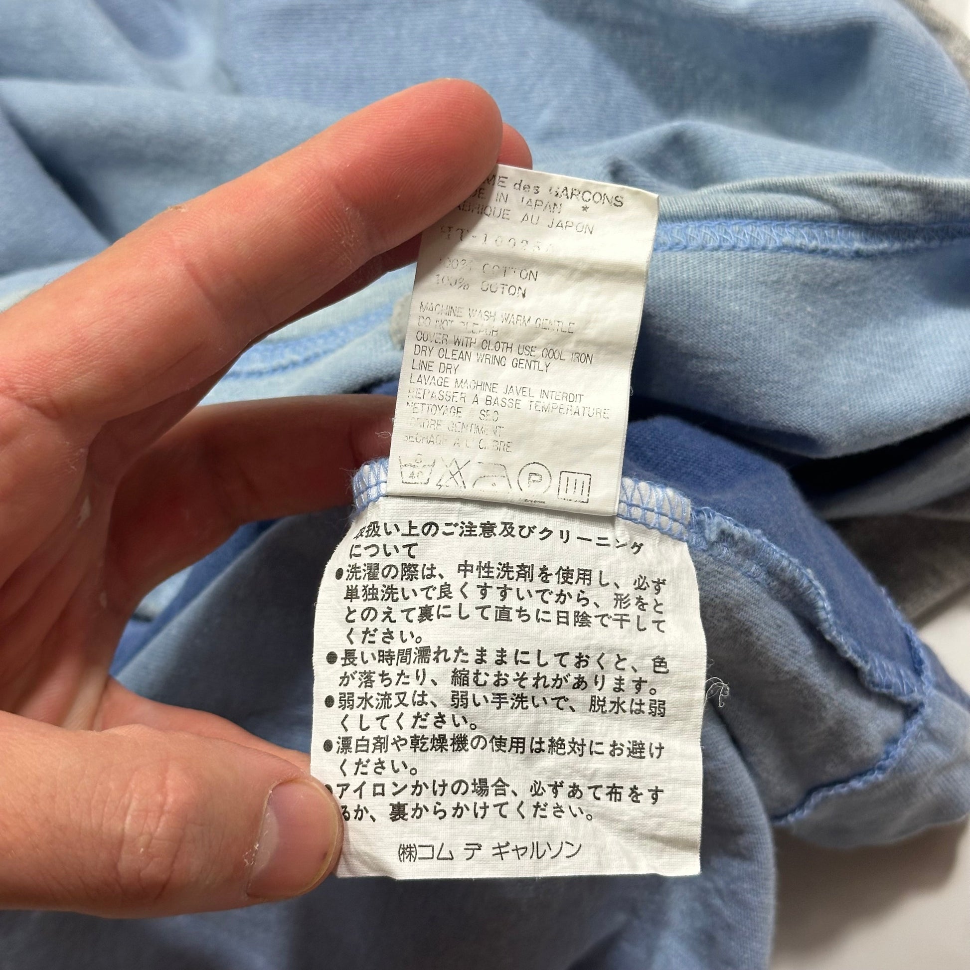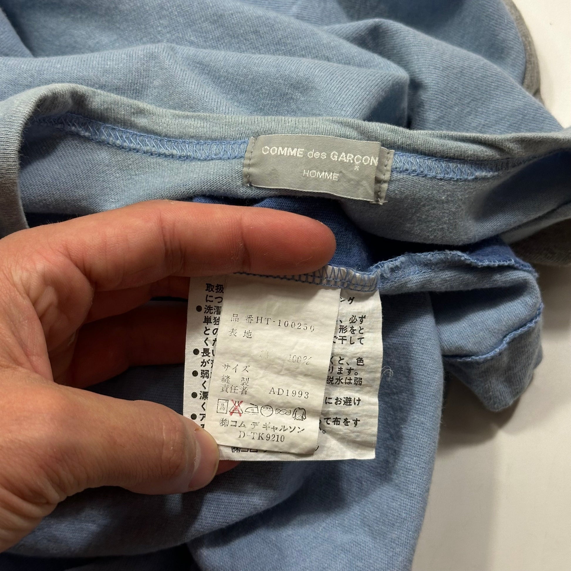 Very rare AD1993 CDG Homme reconstructed asymmetrical colour block baby blue cotton longsleeve t-shirt, beautiful piece that features the same reconstructed technique seen throughout this amazing season.