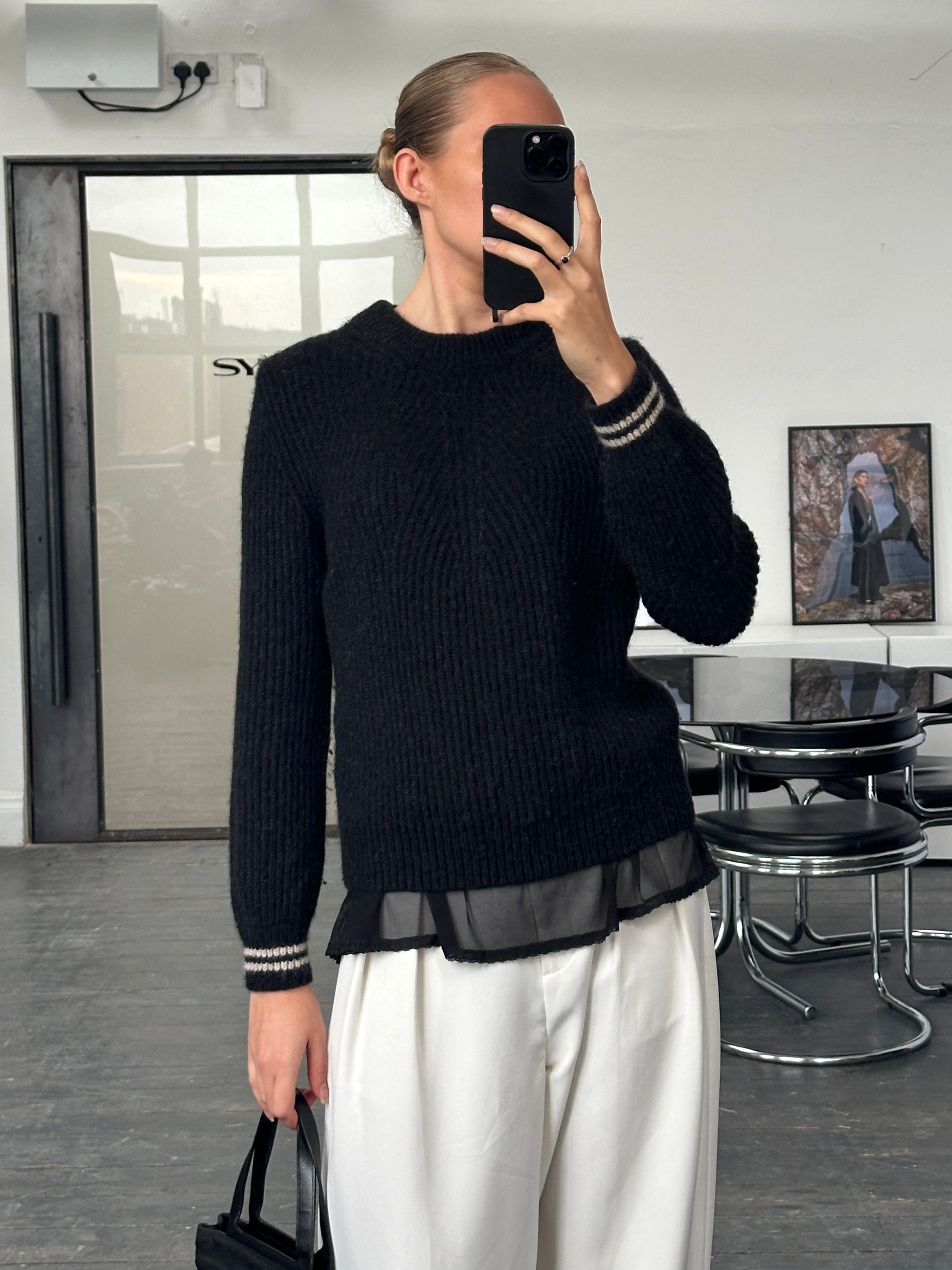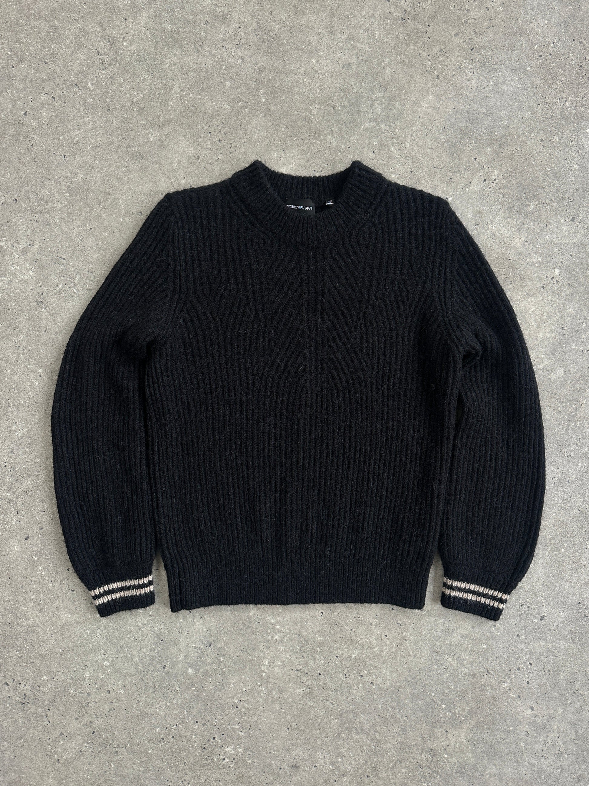 A black ribbed crew neck jumper crafted in a soft alpaca and wool blend, designed with a clean minimalist silhouette typical of Emporio Armani’s 2021 knitwear era. Subtle cuff striping adds a refined contemporary touch.