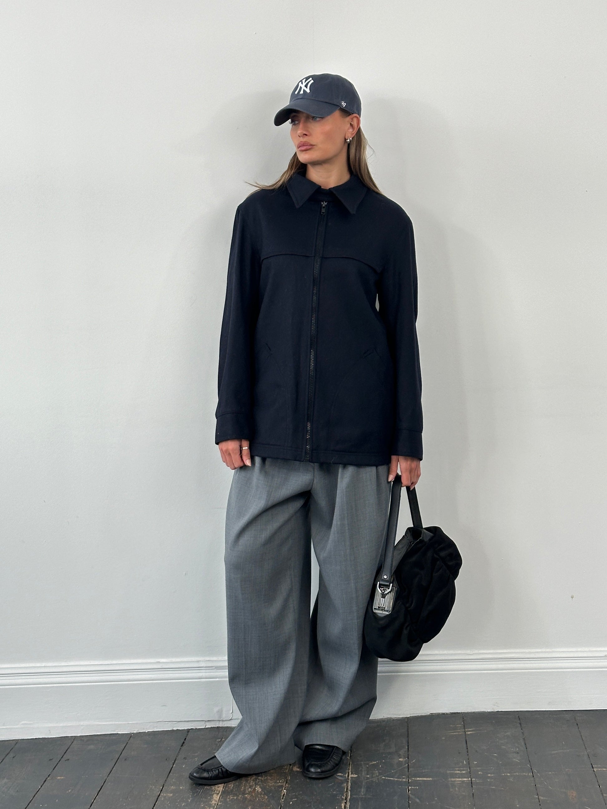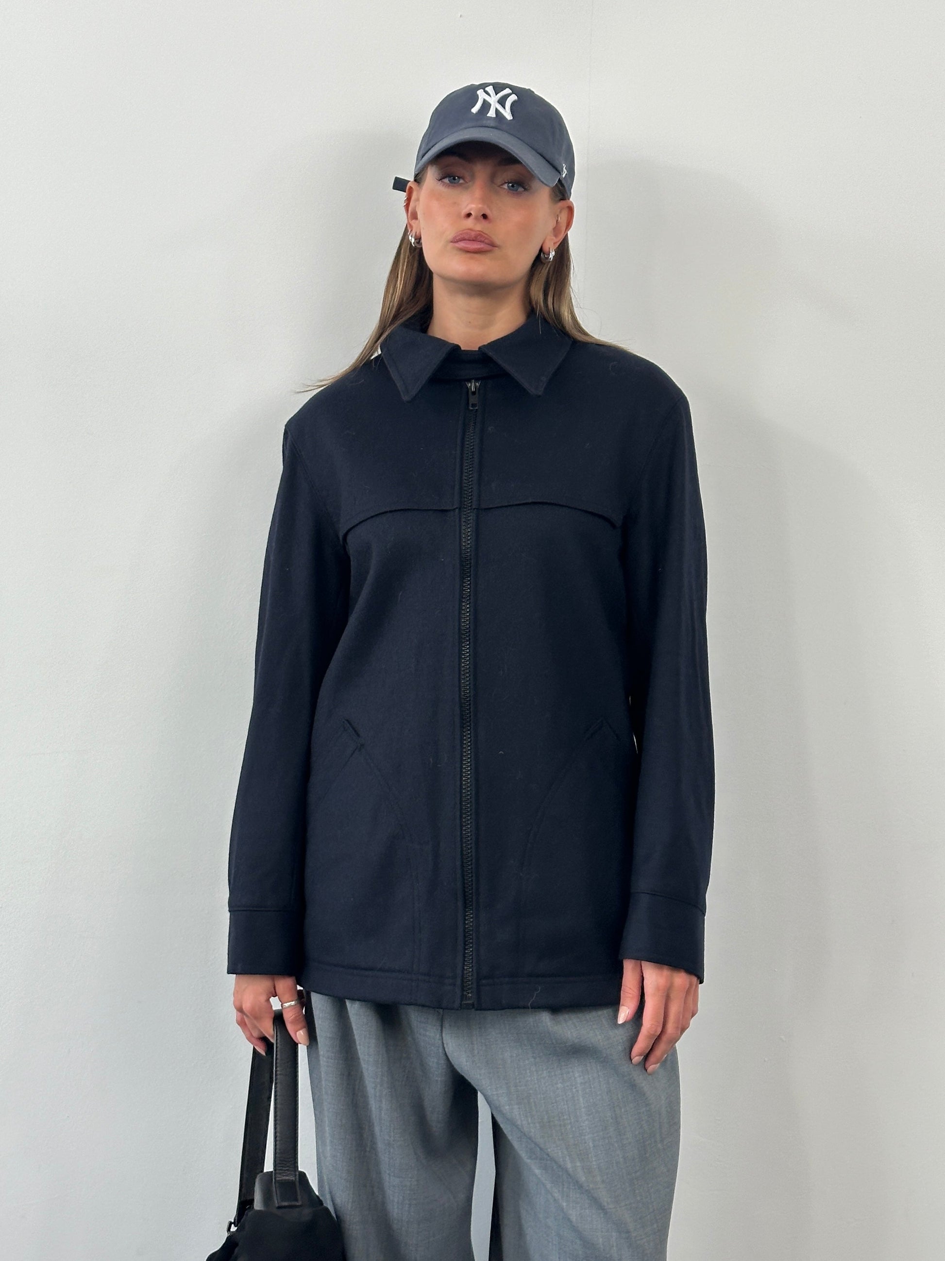 Vinatge 1990s navy double faced wool jacket by Ermenegildo Zegna Yatching, finished with a clean zip front and a structured collar with subtle neck fastening detail. Minimal and functional in design.