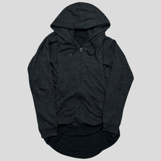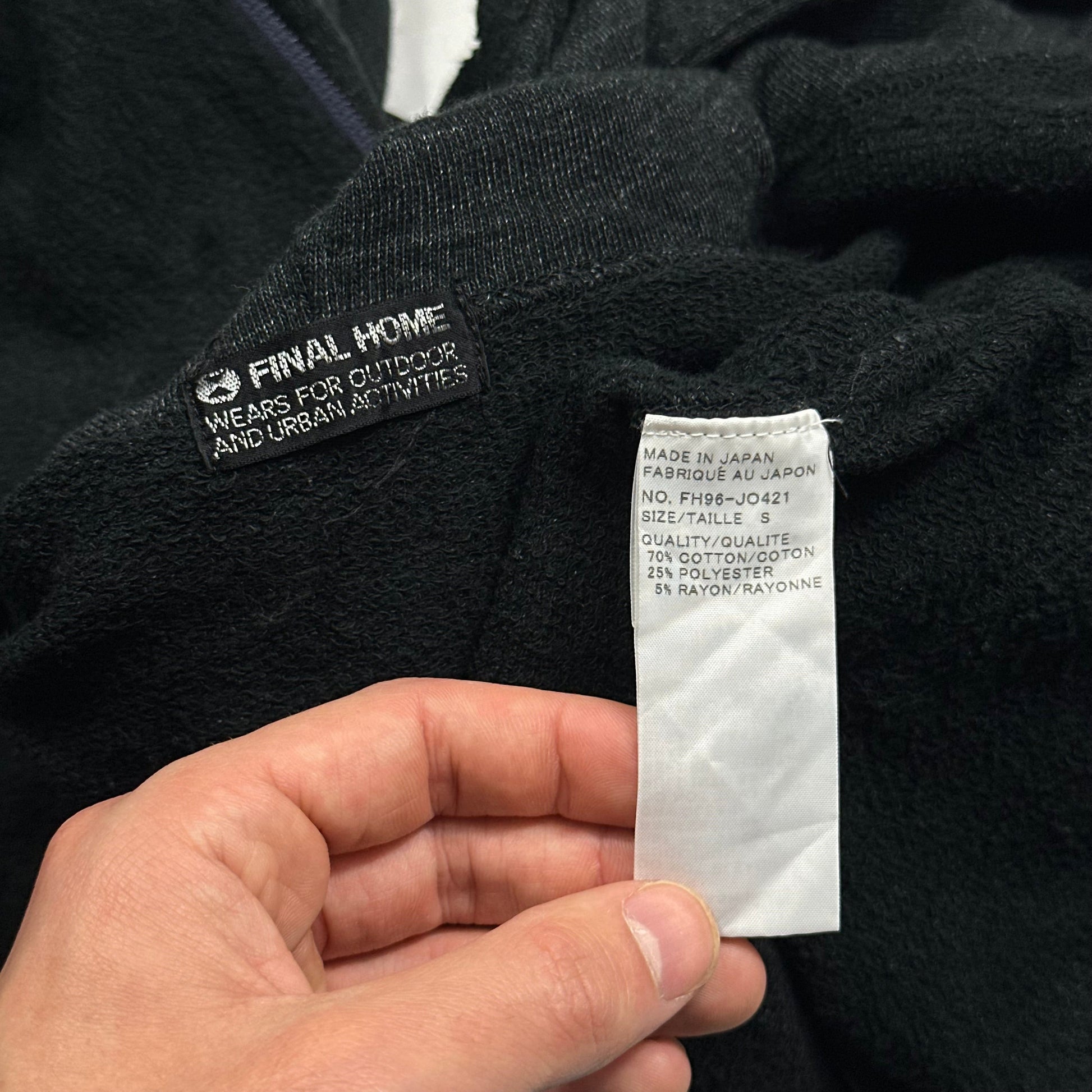 Very rare Final Home by Issey Miyake unique grey and black hoodie cardigan, can be worn numerous different ways with the hood inside out or stacked, buttoned up or open, Final Home survival logo that can be shown by unbuttoned the cardigan, super unique piece.