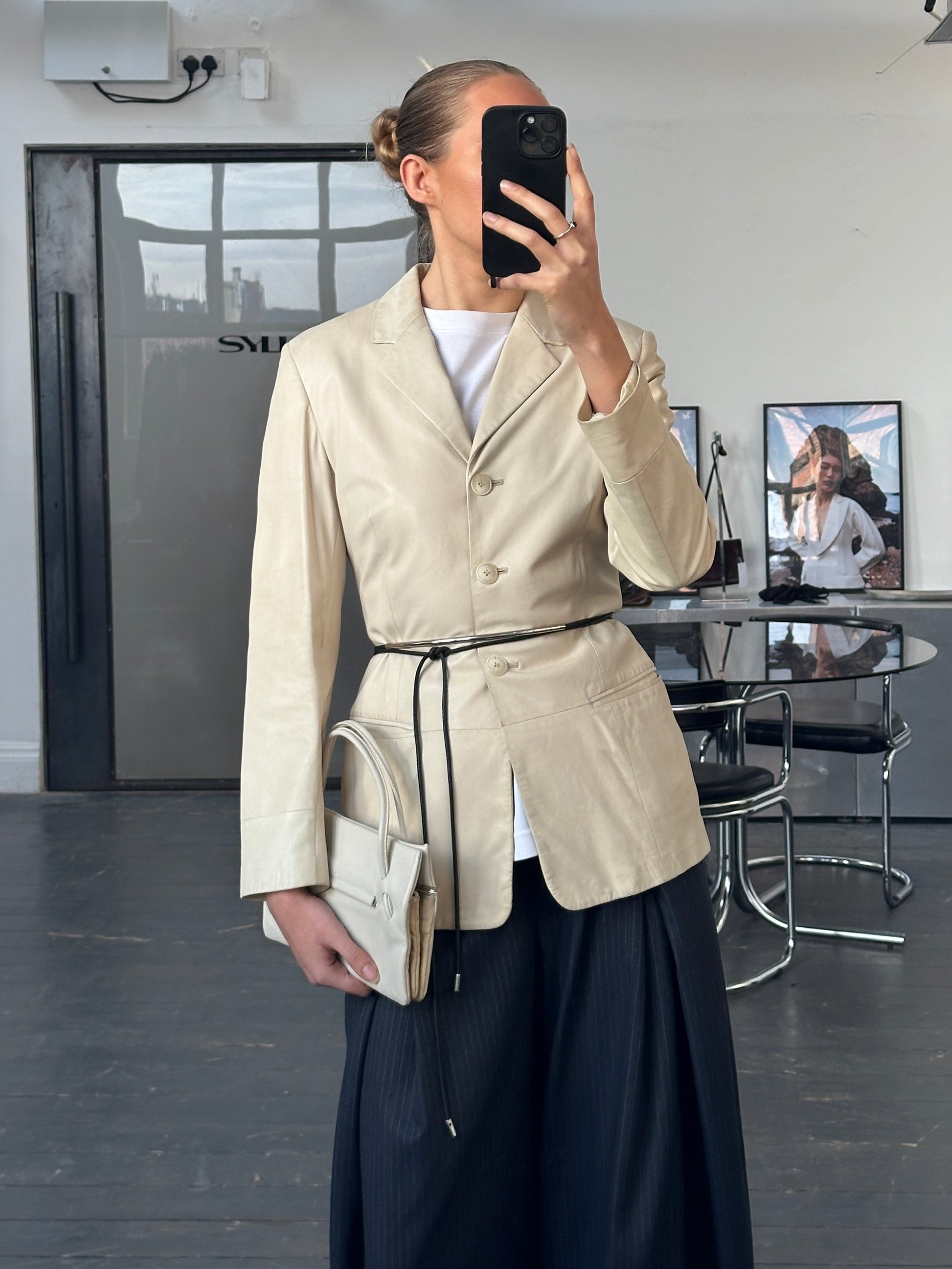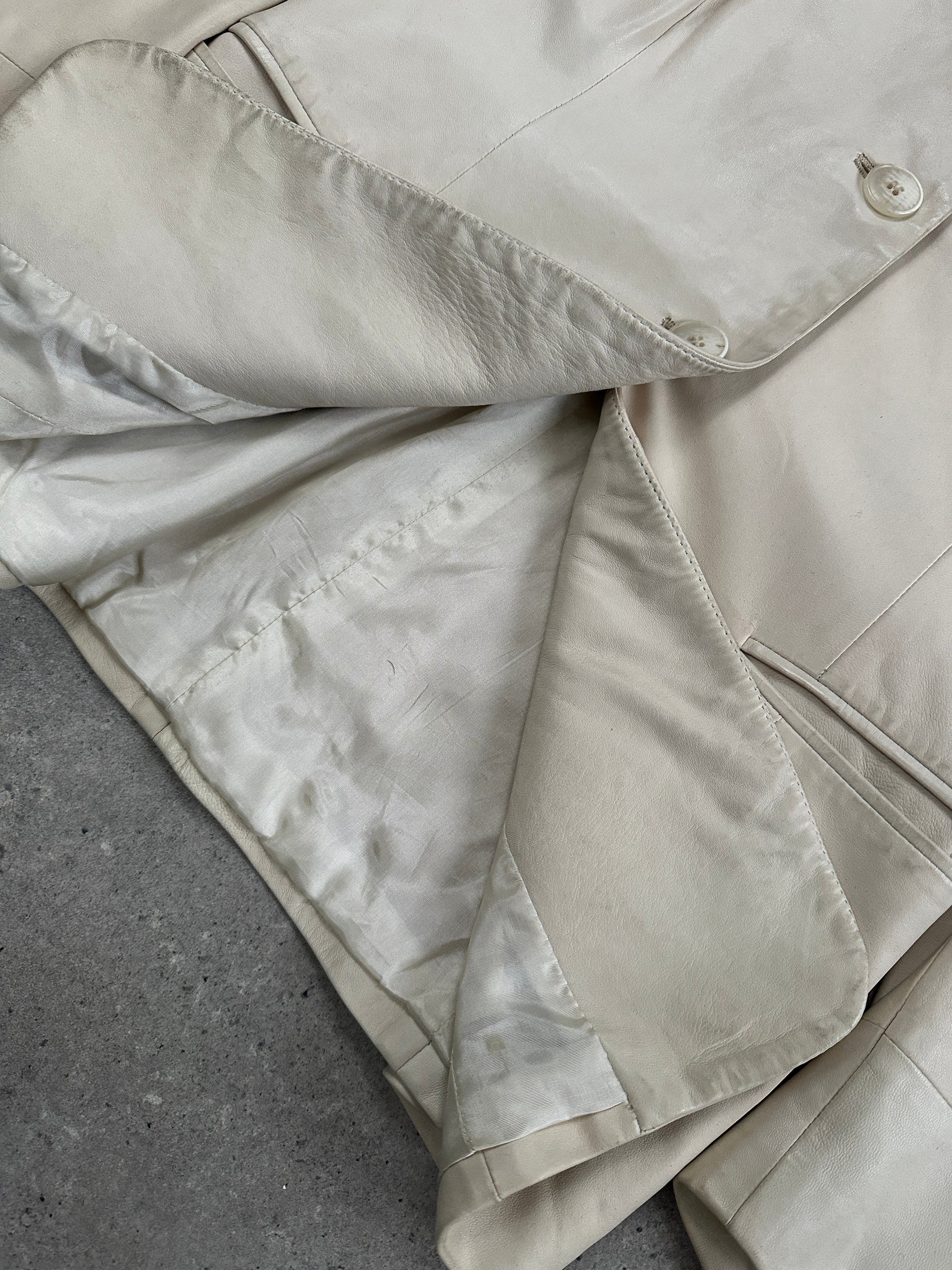 Vintage 1990s Gianni Versace cream leather jacket with a softly tailored silhouette and clean minimalist detailing. The smooth hand of the leather and the gentle shaping at the waist give this piece a quietly elevated finish.