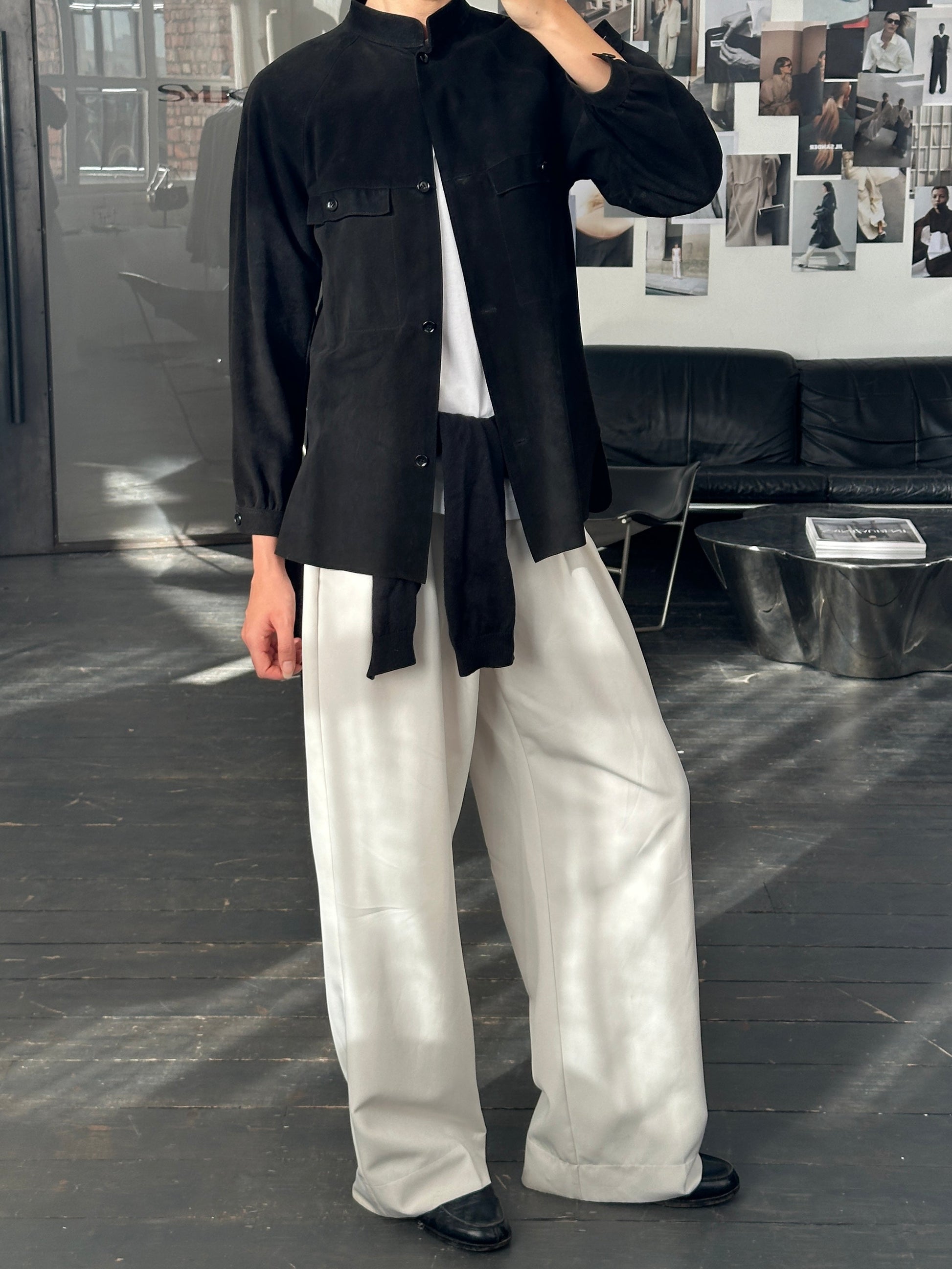 ~ Minimal overshirt silhouette with mandarin collar and flap chest pockets
