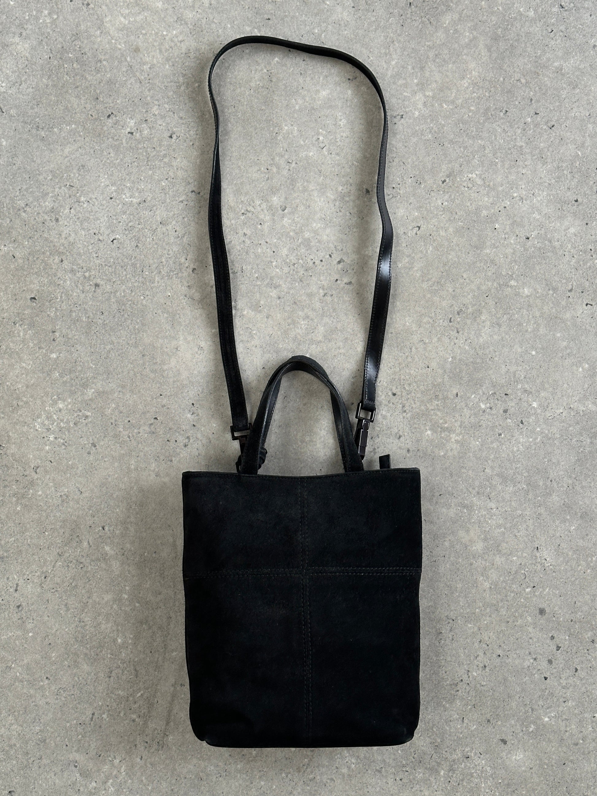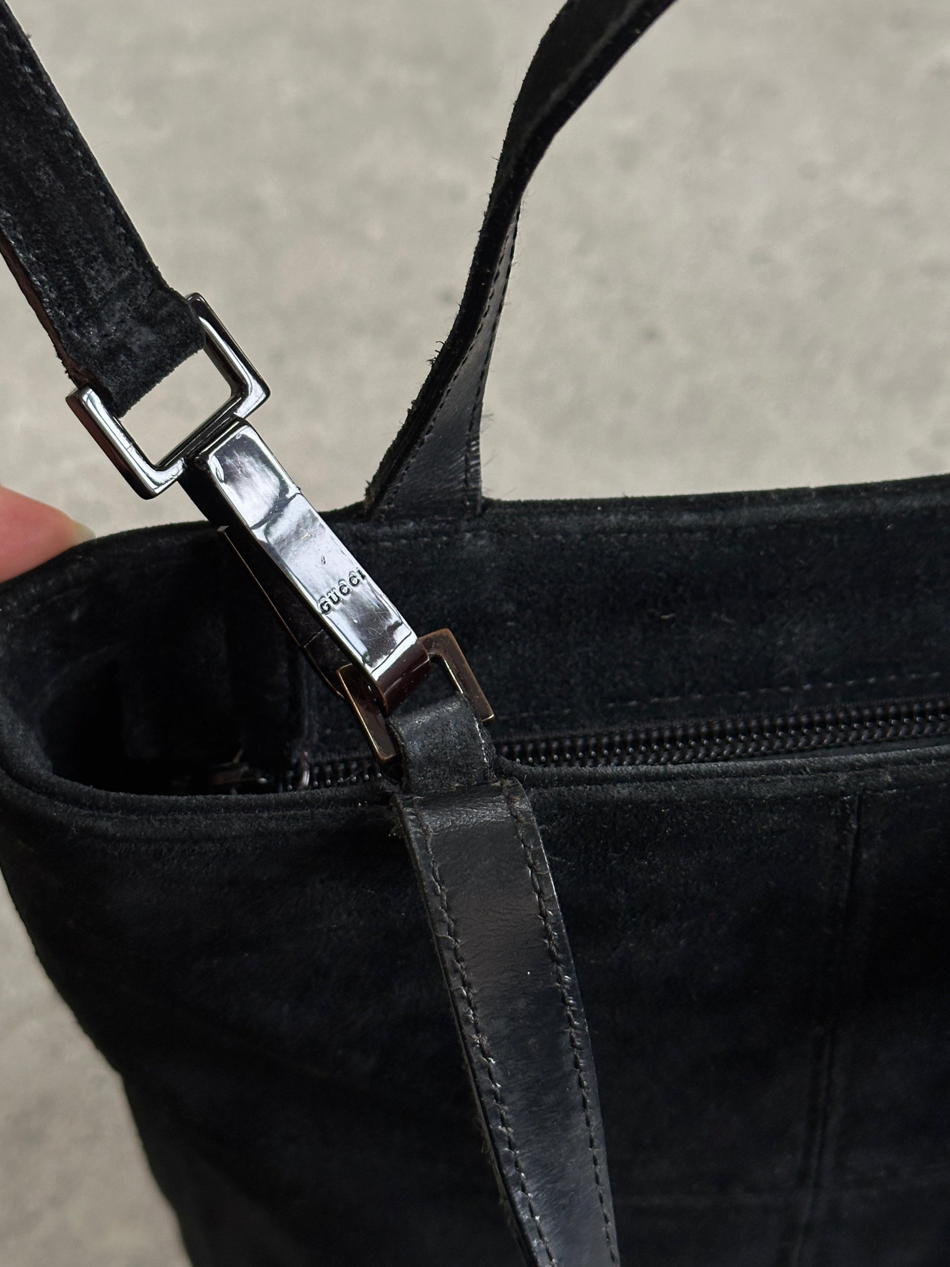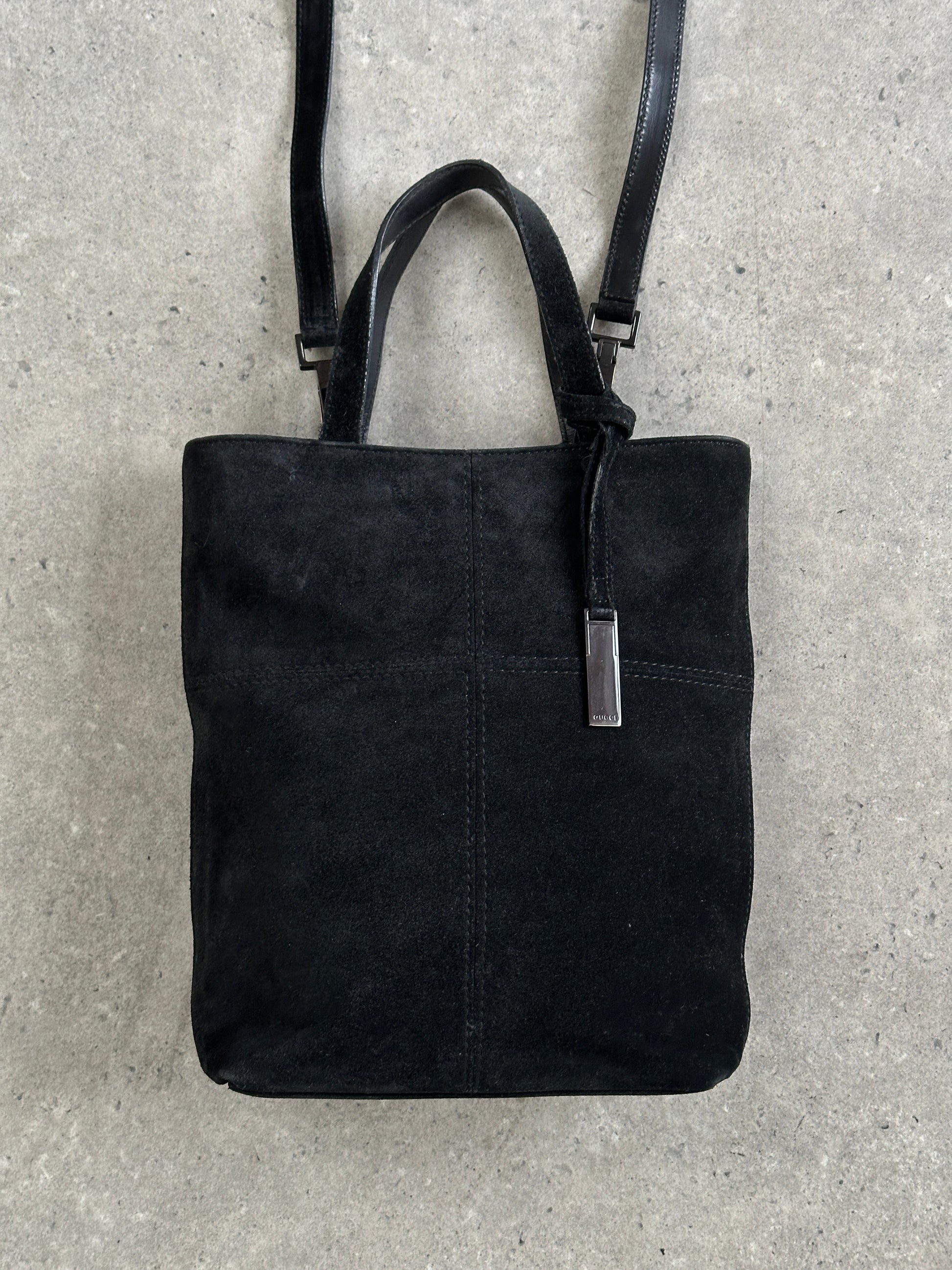 A refined Gucci 2000s suede mini bag with a structured silhouette, designed with a slim top handle and a detachable crossbody strap for versatile wear. Finished with subtle metal logo detailing and clean panel construction, this understated piece reflects Gucci’s early 2000s quiet luxury era.