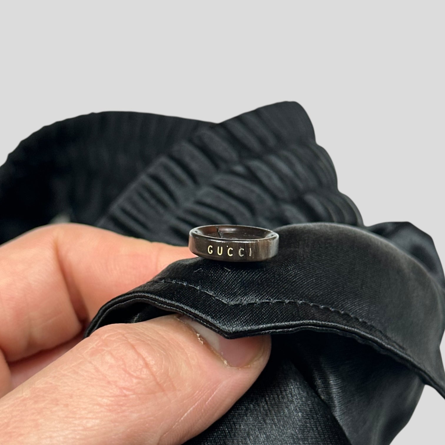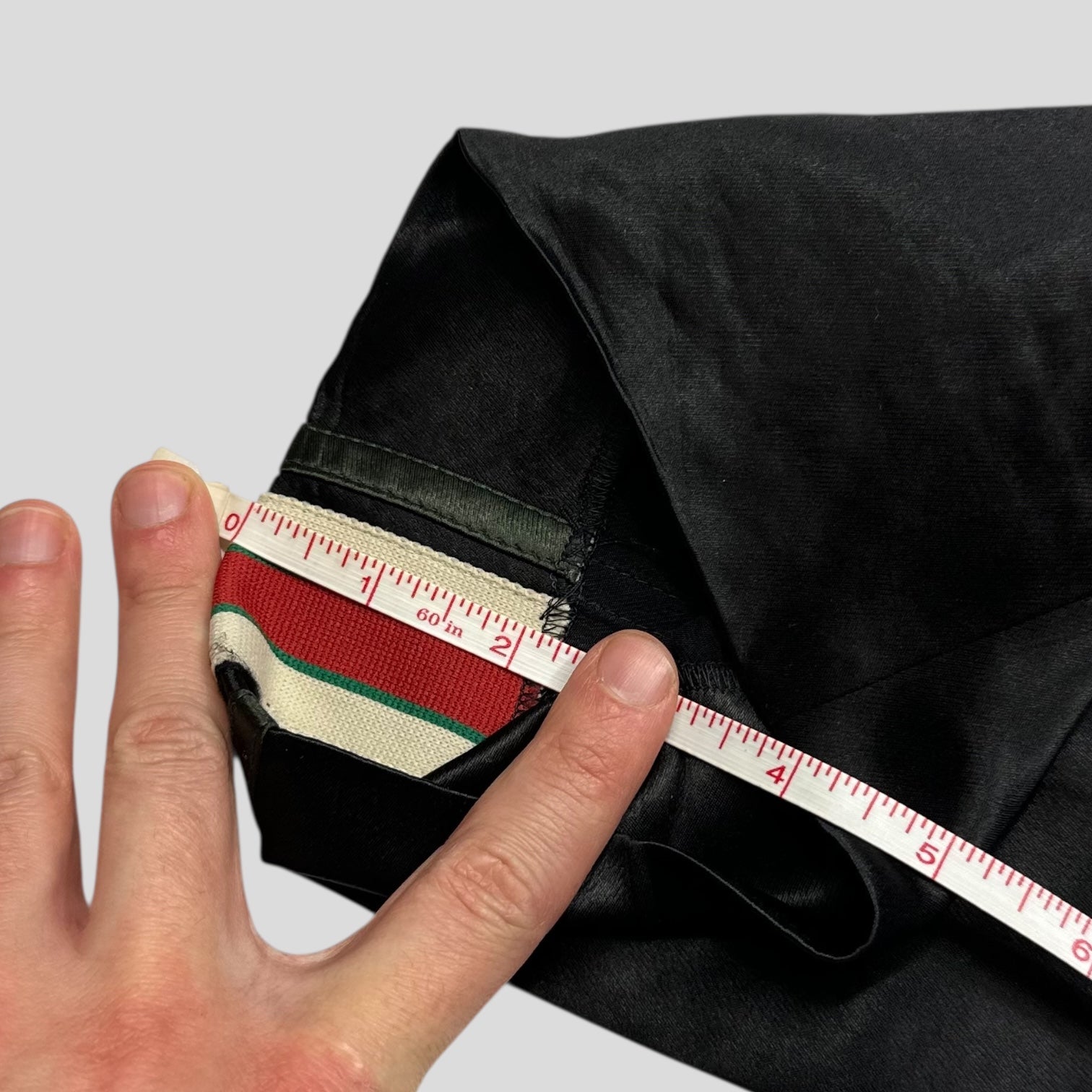 Rare 2017 Gucci black acetate tracksuit jogger trousers, relaxed fit, retro logo and Gucci web stripes to outside legs, elastic and drawstring waist, unisex fit.