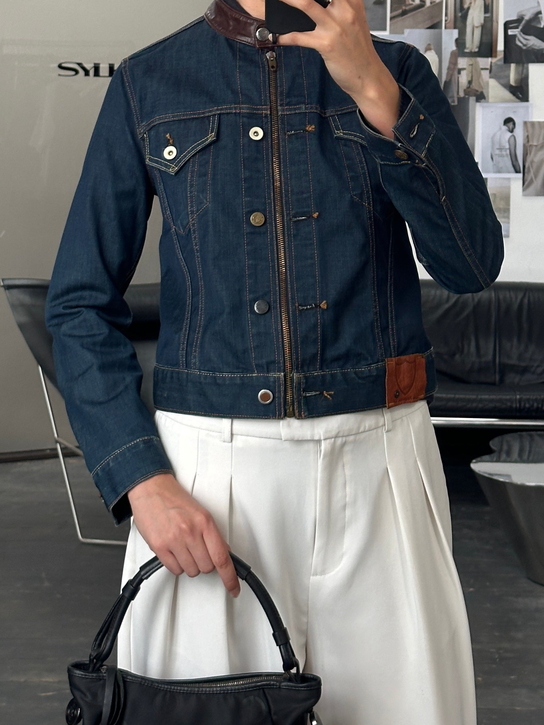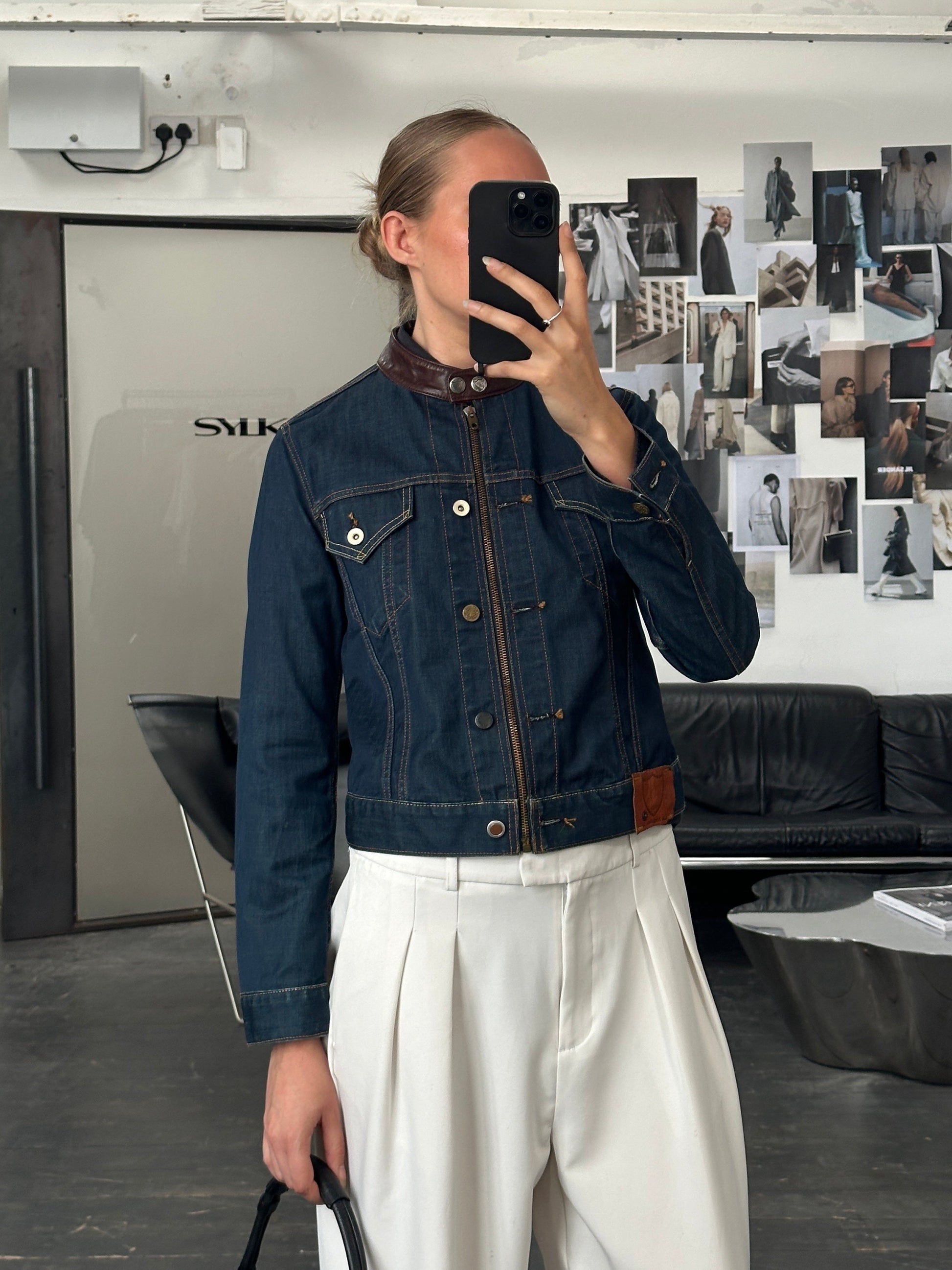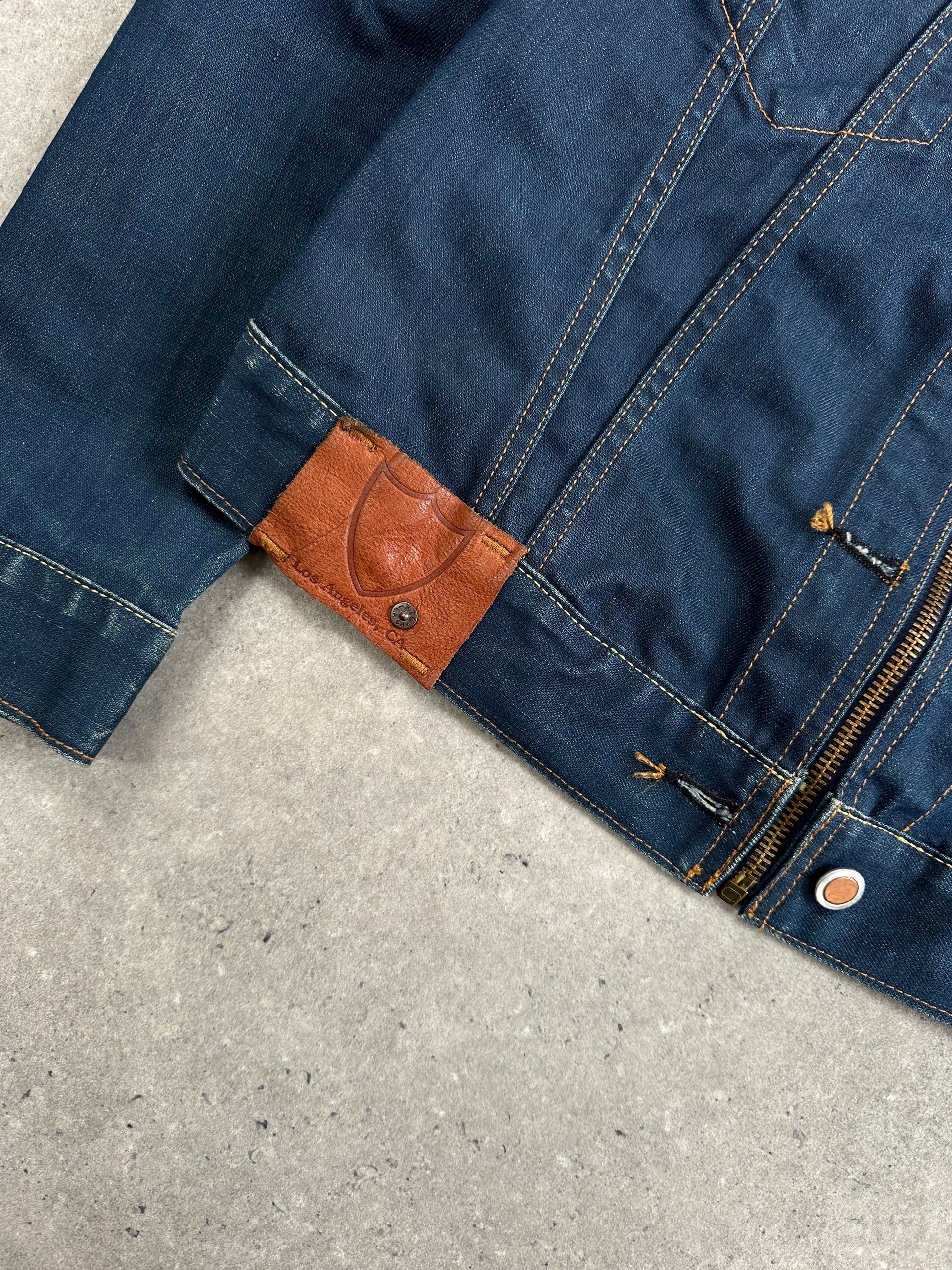 Cut from deadstock Italian denim, this HTC Night Flyer jacket reworks a classic trucker silhouette with motorcycle edge. The cropped fit is defined by bold paneling, a leather snap-tab collar, and contrast stitch detailing. It embodies HTC’s early 2000s fusion of heritage workwear and Los Angeles luxury.