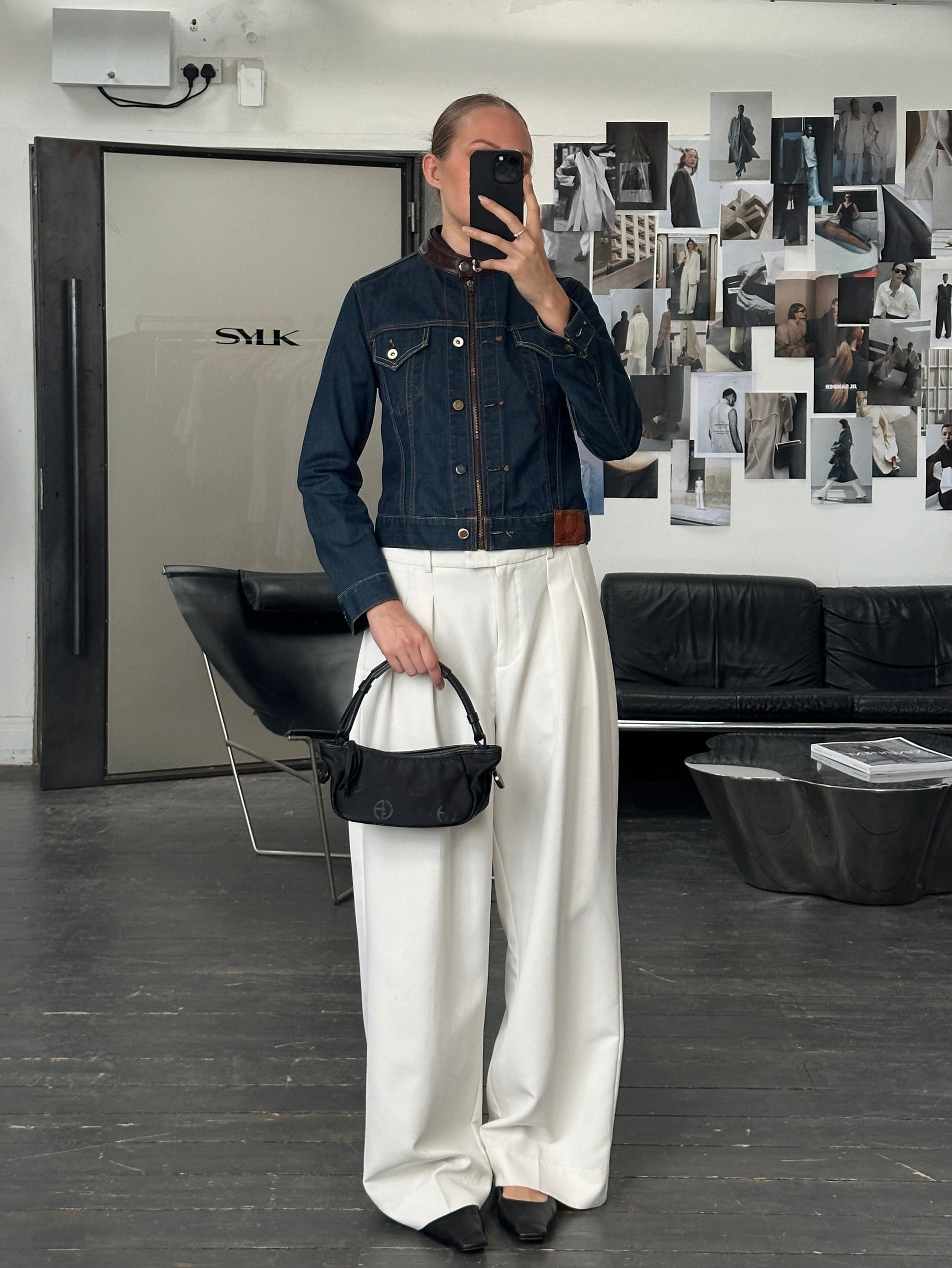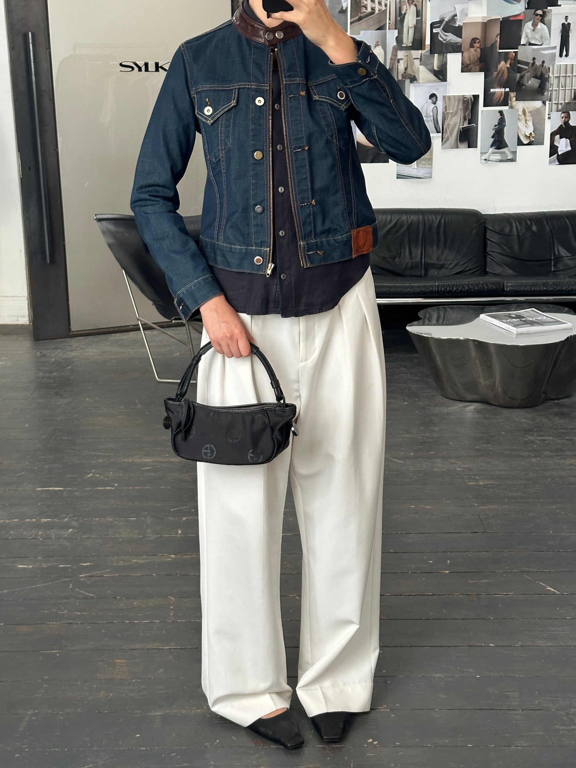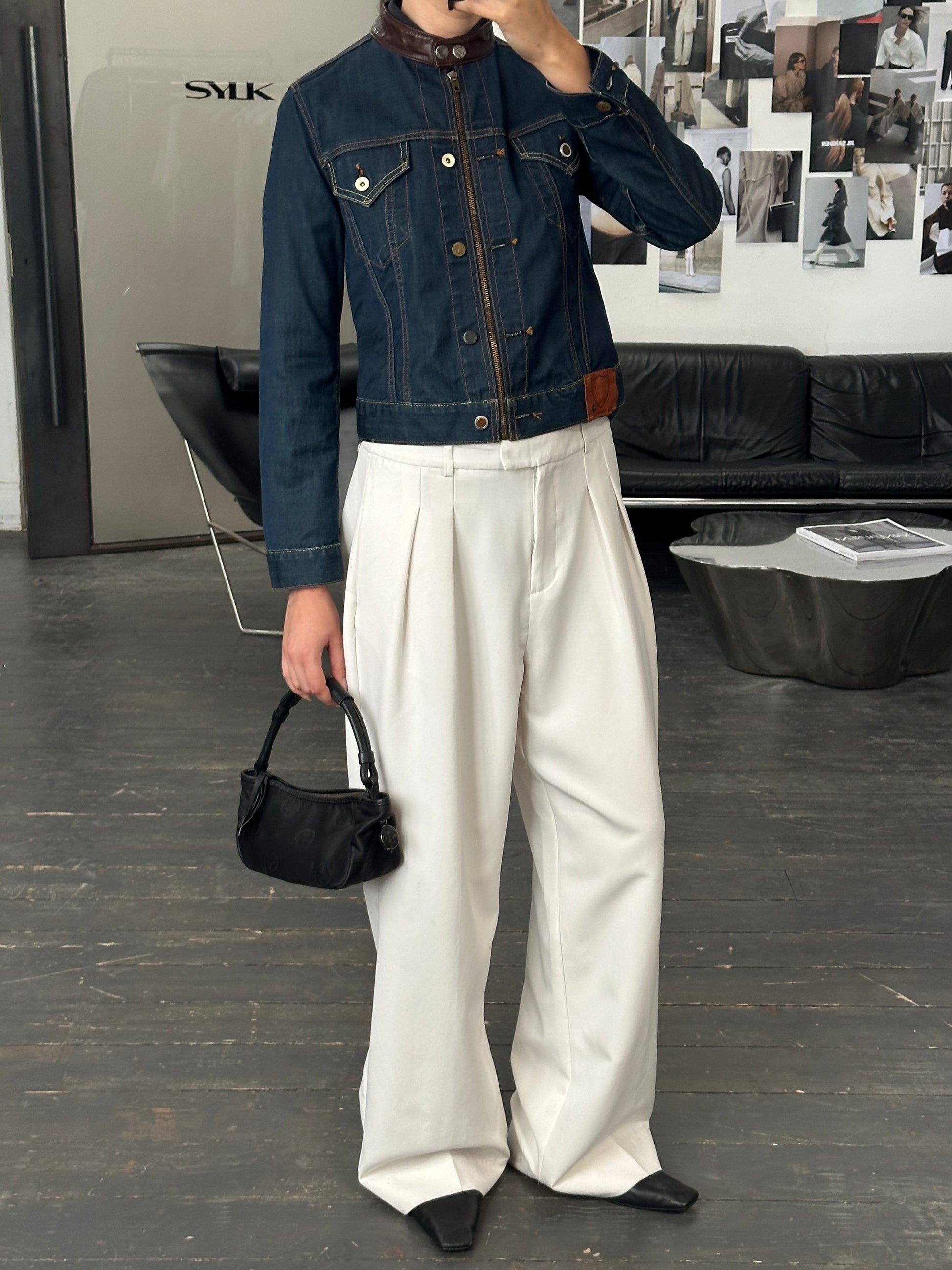 Cut from deadstock Italian denim, this HTC Night Flyer jacket reworks a classic trucker silhouette with motorcycle edge. The cropped fit is defined by bold paneling, a leather snap-tab collar, and contrast stitch detailing. It embodies HTC’s early 2000s fusion of heritage workwear and Los Angeles luxury.