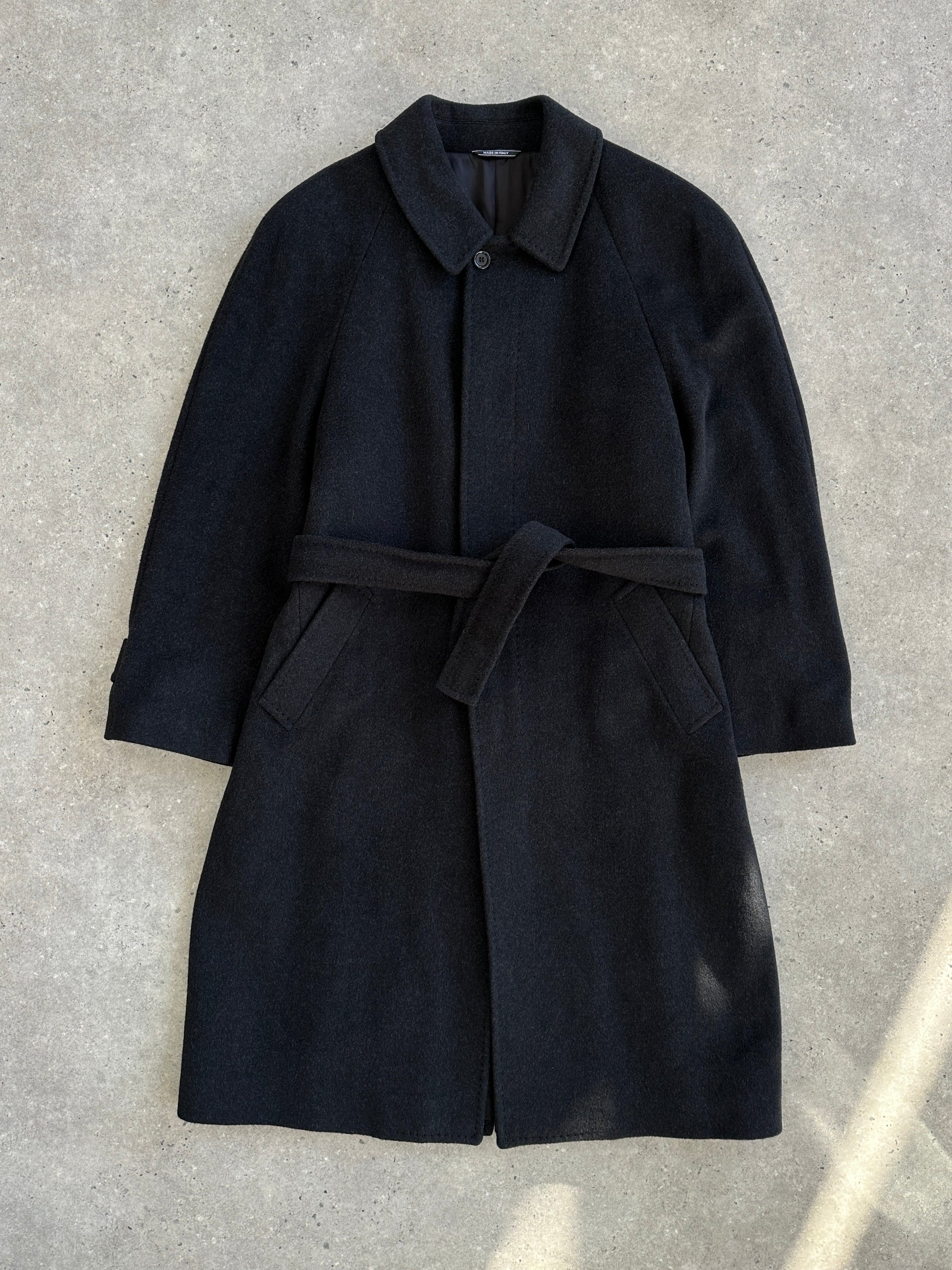 Grey vintage Abitale coat with a minimal concealed placket and a clean belted silhouette. Italian-made piece from the 1980s with a soft wool handle and a refined structured drape.