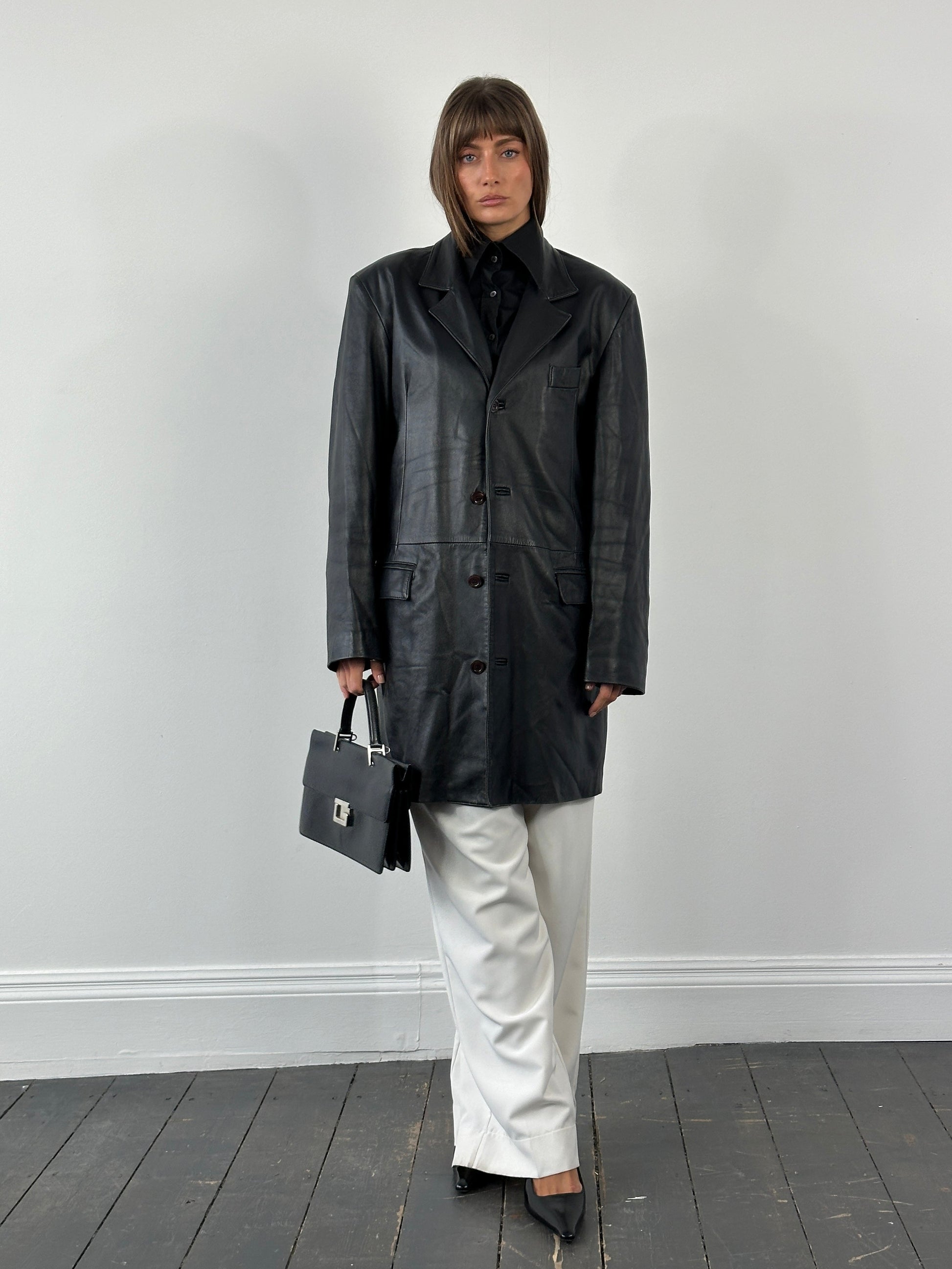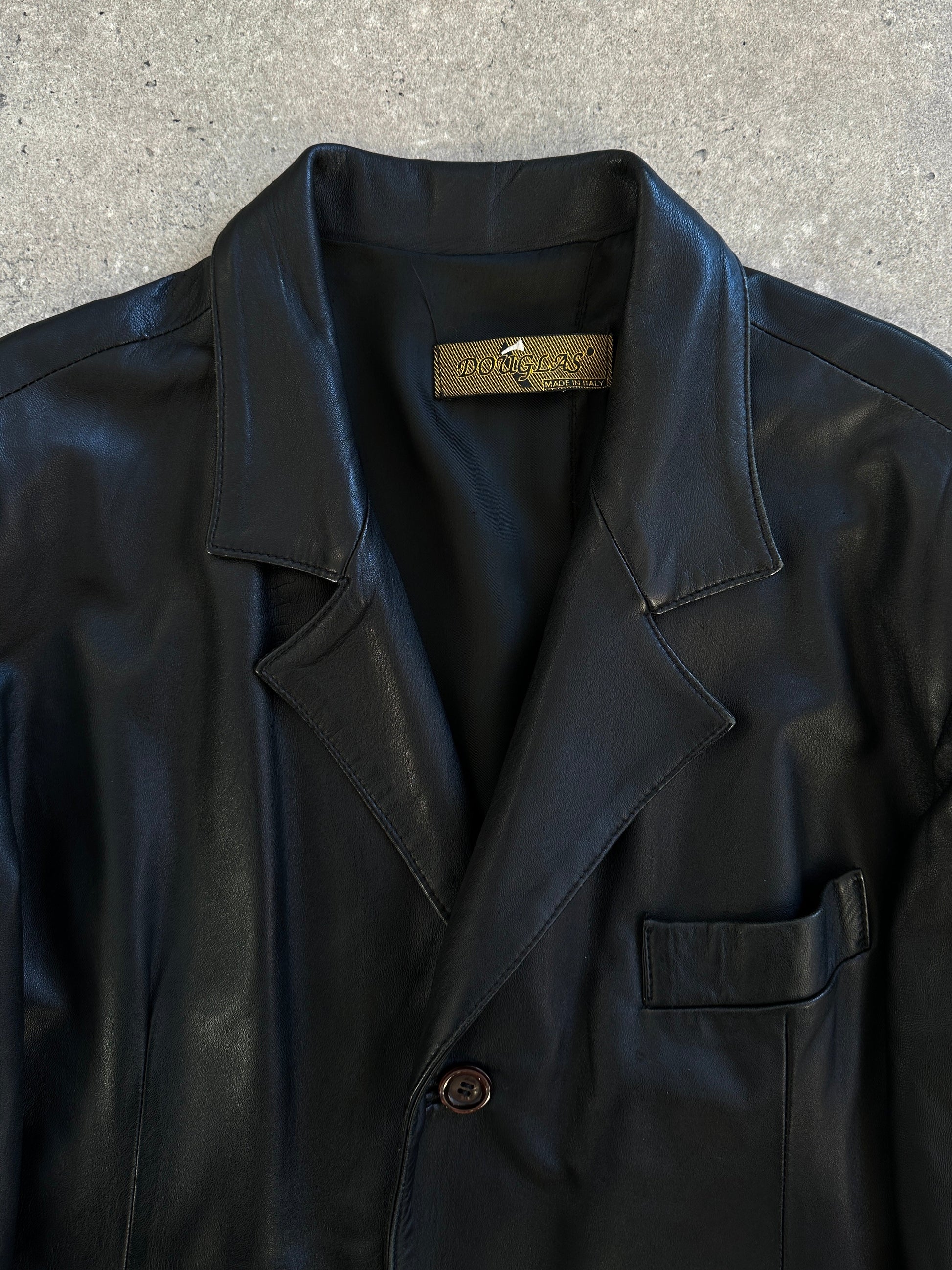 Black smooth leather trench coat with a clean single breasted cut and minimal lines. Crafted in Italy by Douglas and finished with a soft drape typical of 1990s outerwear.