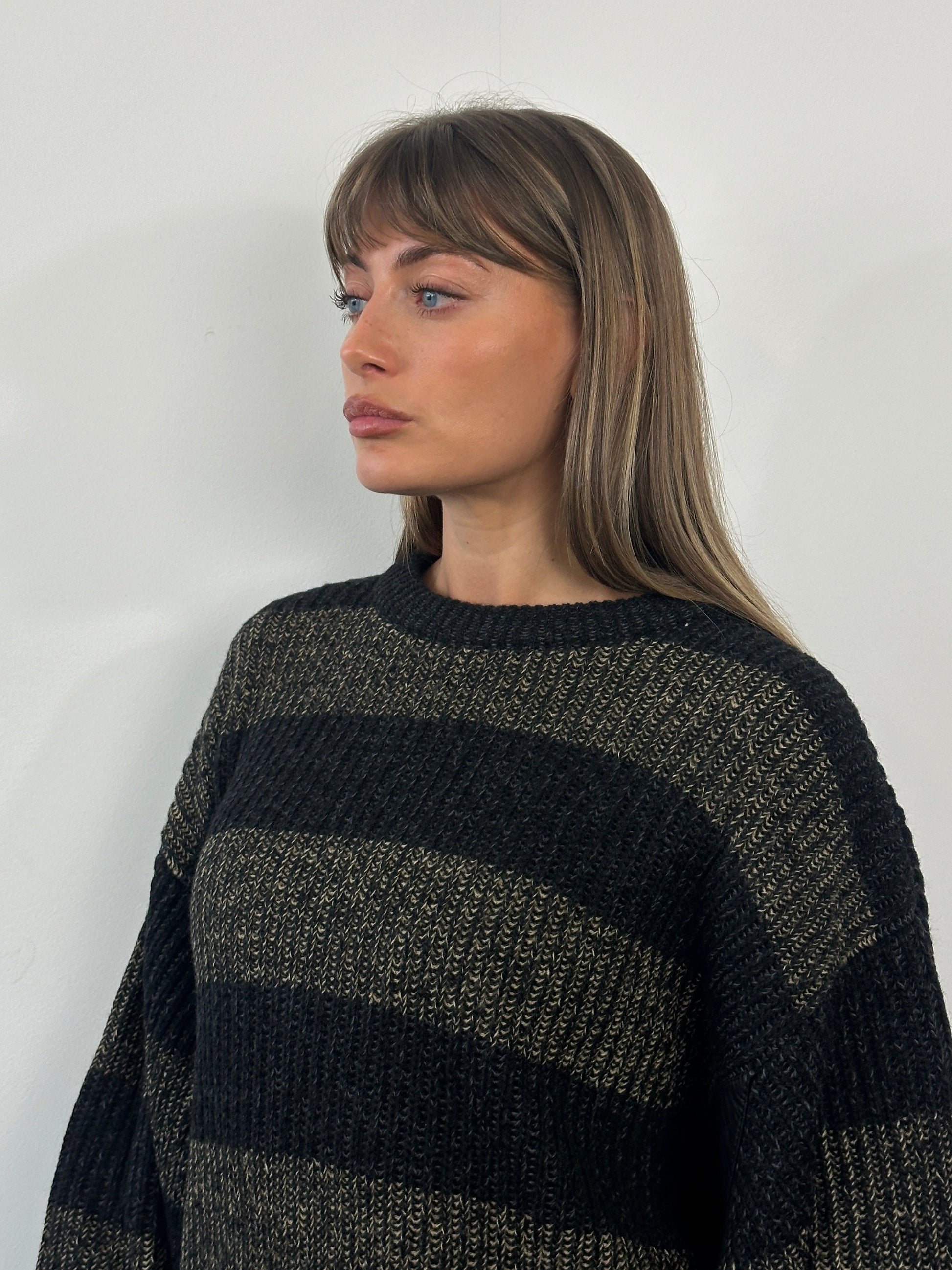 A vintage Italian knitted jumper in black and brown tones, featuring a bold horizontal stripe pattern and leather patches. Cut with a relaxed, boxy silhouette and finished with ribbed trims.