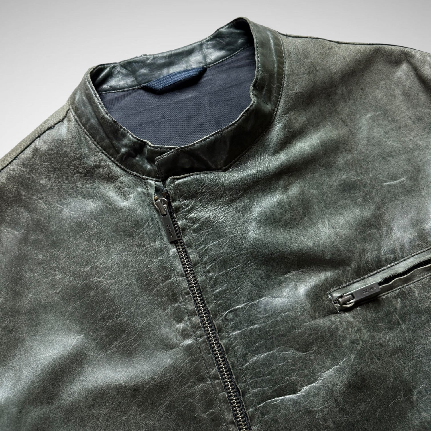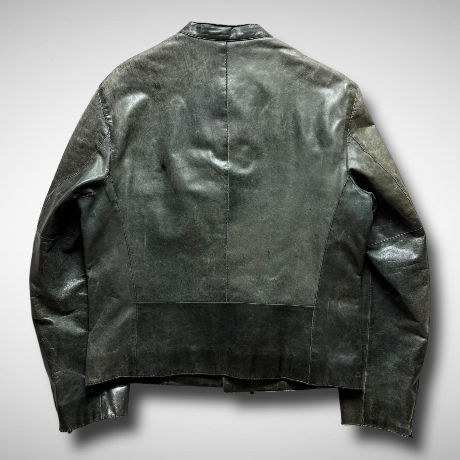 This Kenzo Homme leather jacket features a deep olive patina with a sleek, minimalist design. It has a band collar with snap closure, asymmetrical front zip, and three zippered pockets—two at the sides and one on the chest. The interior is fully lined with a black fabric and includes an additional inner pocket. Subtle fading and creasing give it a worn-in, vintage appeal.