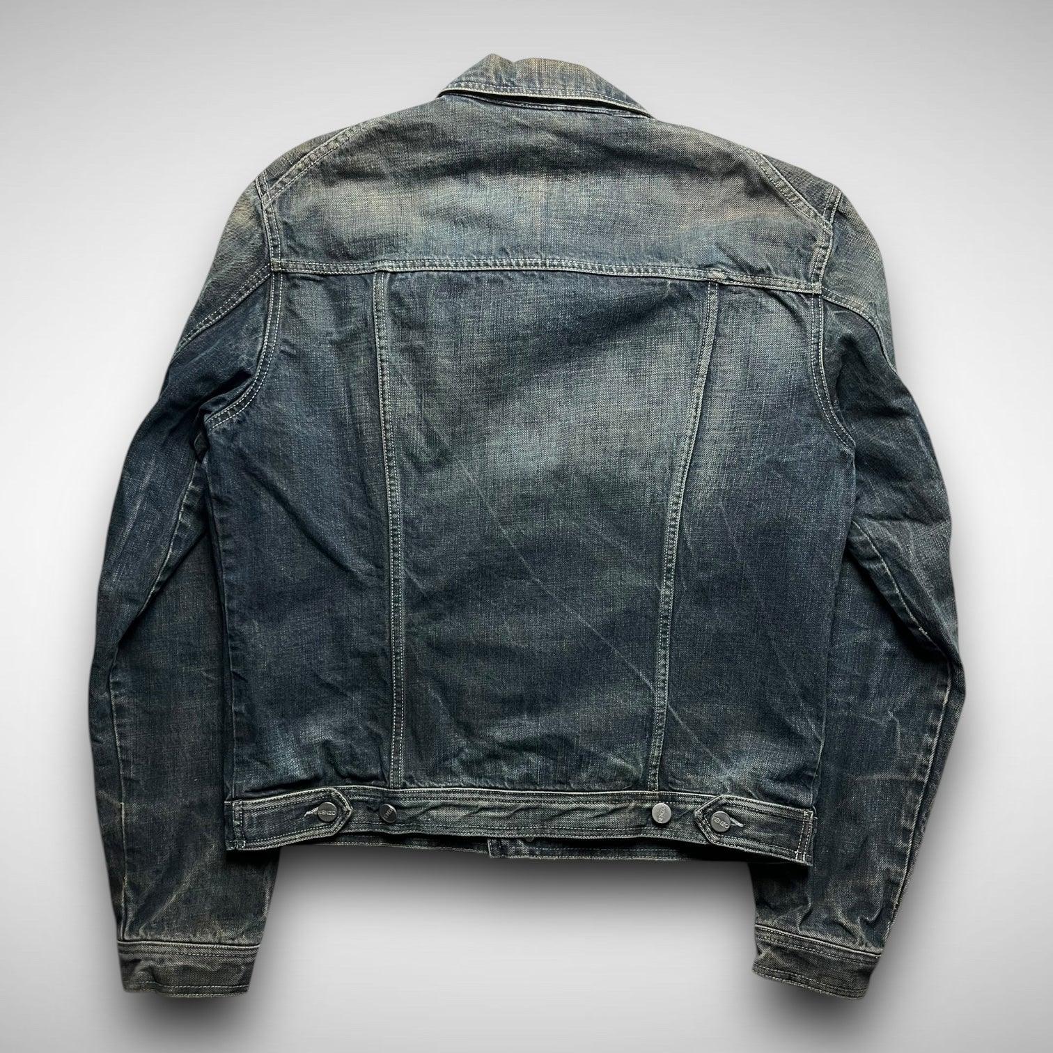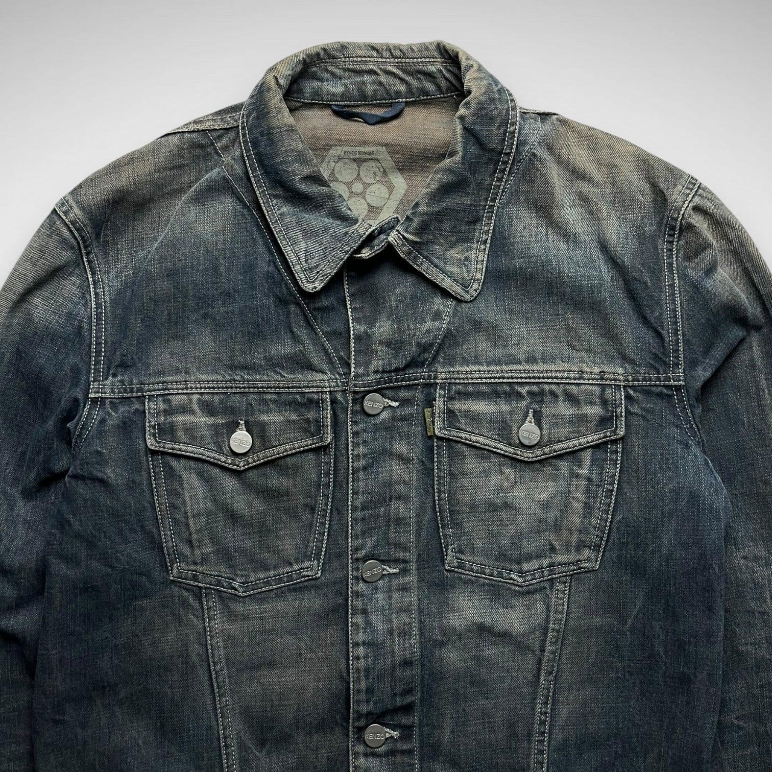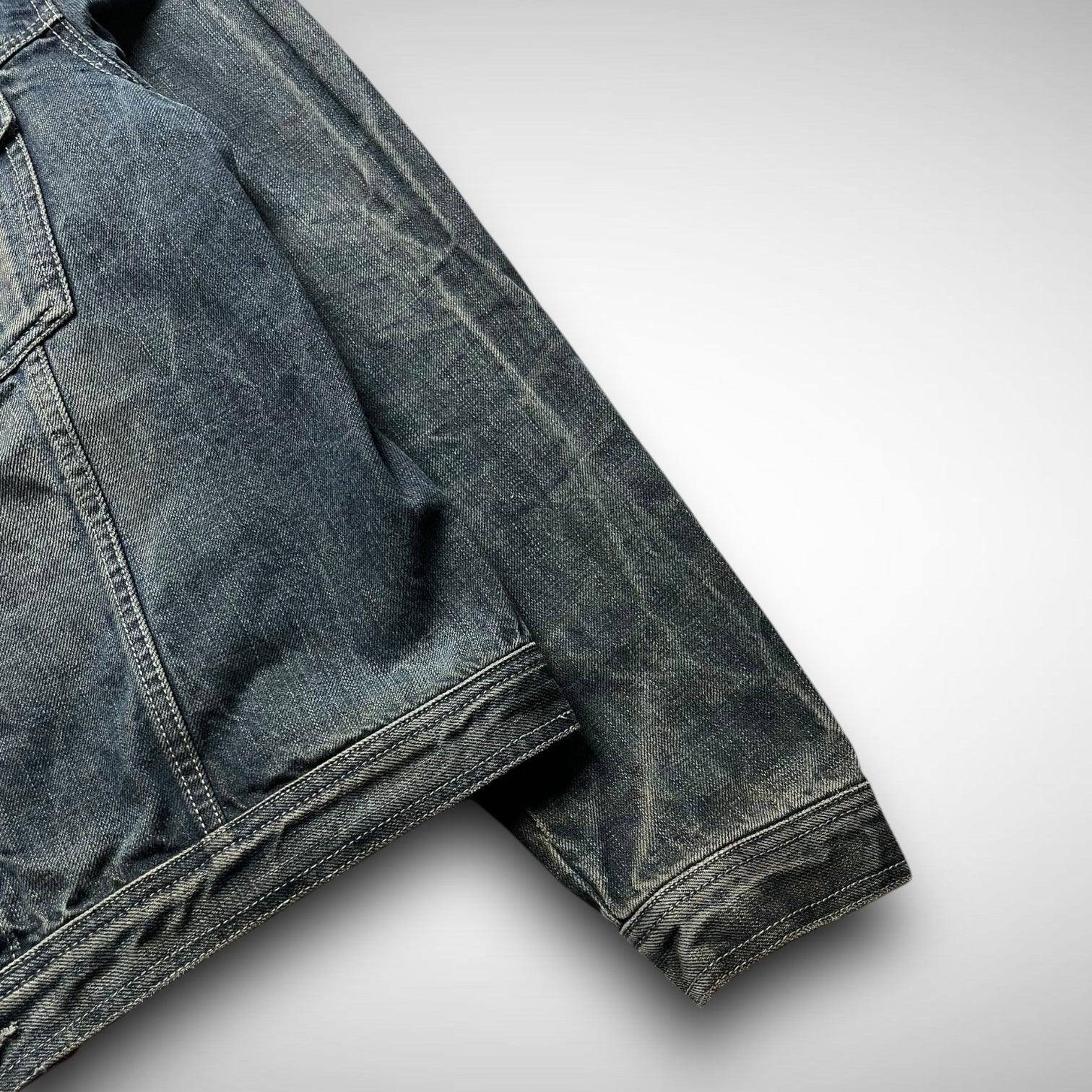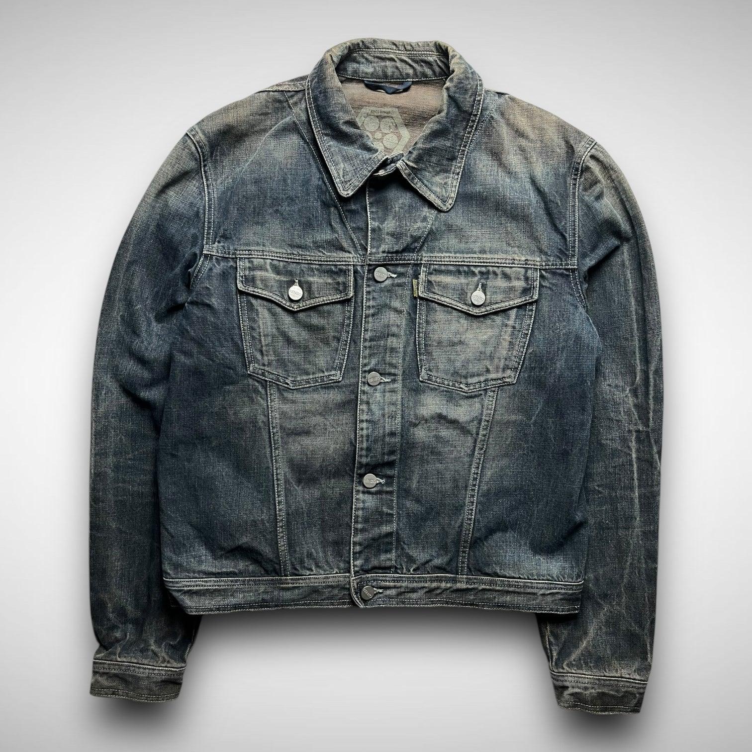 This is a 2000s Kenzo dark-wash denim jacket with a structured fit and heavy fading throughout. It features pointed flap chest pockets with branded buttons, a hidden hexagon logo print inside, and minimal branding on the chest. Finished with classic side adjusters and light sleeve creasing for a naturally worn look.