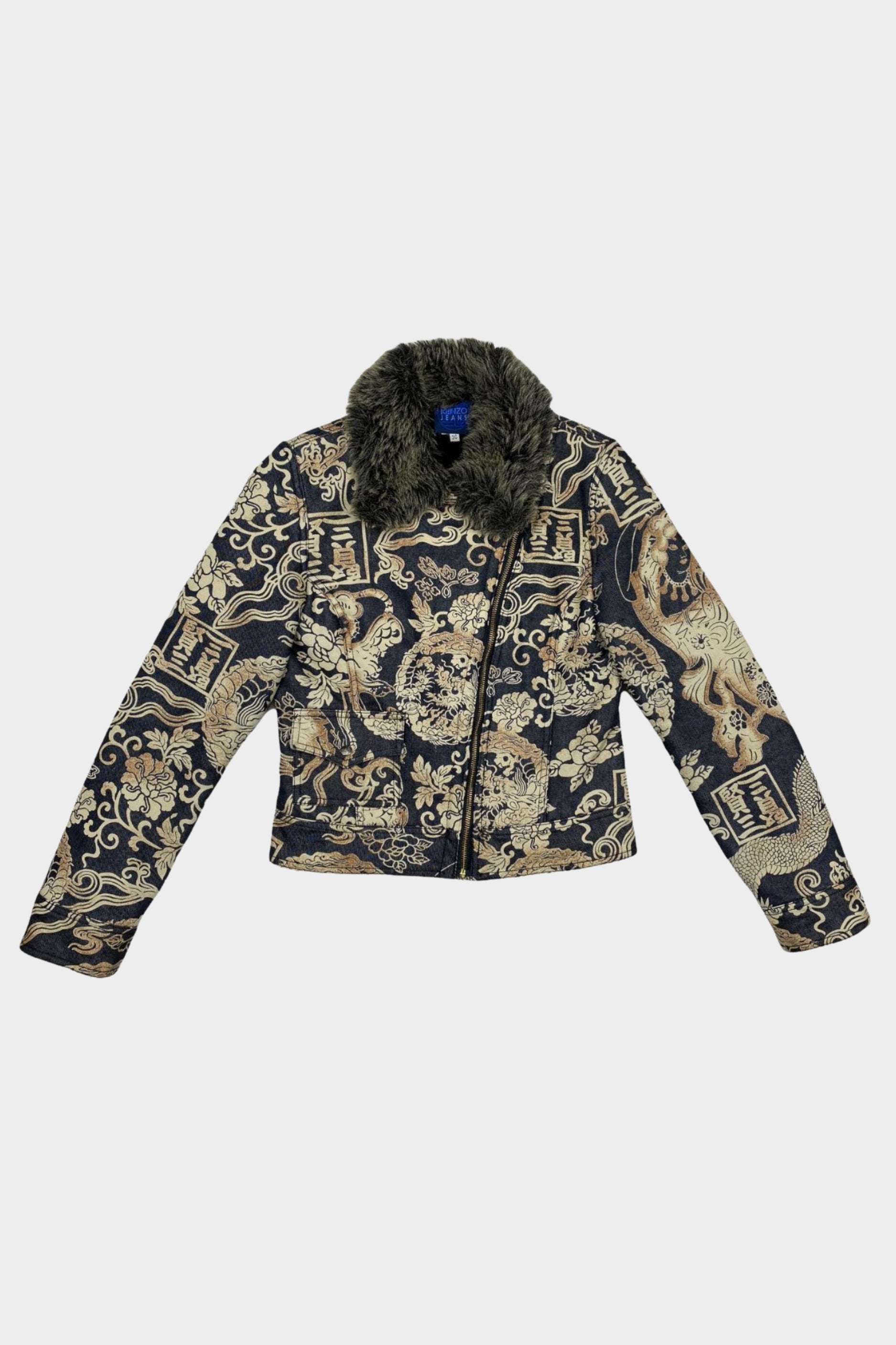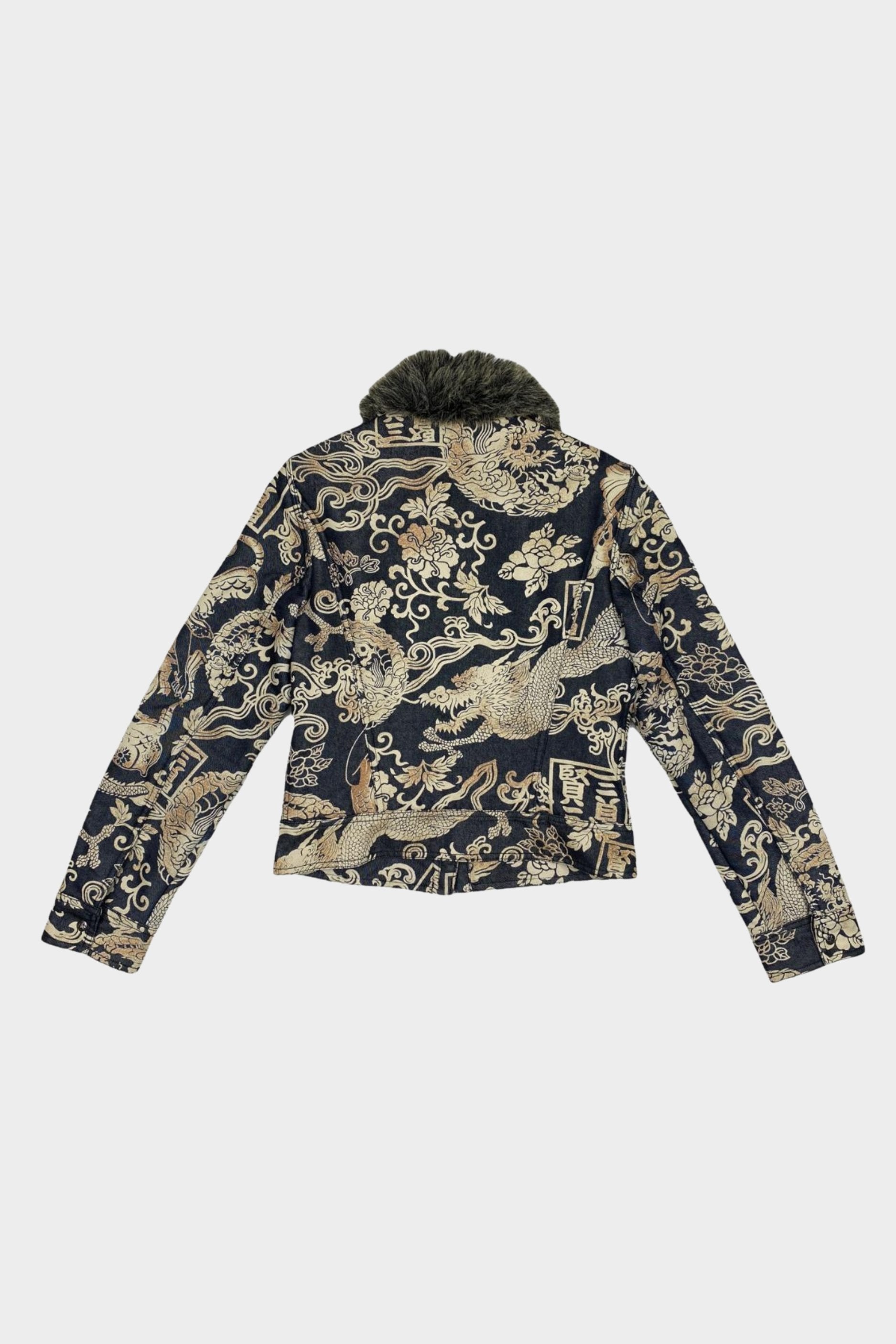 This vintage Kenzo aviator-style bomber from the house's 1990s collection is a true collector's piece, encapsulating the essence of the brand's identity. The jacket is tailored with classic aviator lapels, a zip fastening, and cozy faux fur lining. The standout feature is the iconic dragon and oriental-inspired print, set against a dark navy blue cotton-denim blend.