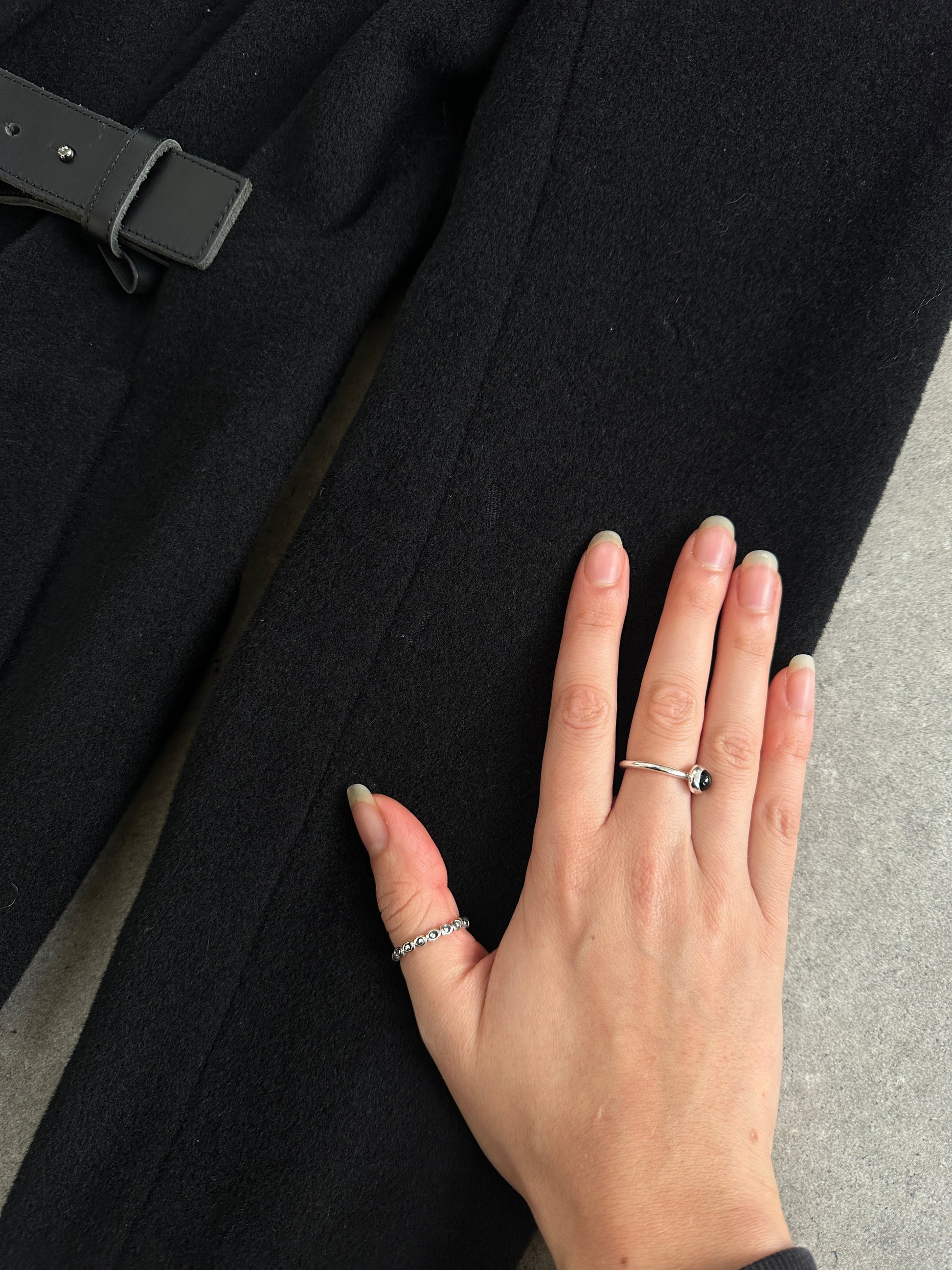 A refined black tailored coat from L.K. Bennett featuring a clean minimal silhouette with a dagger collar and a chic leather side-closure detail. Finished in a deep black tone with leather trim beneath the collar for a subtle elevated touch.