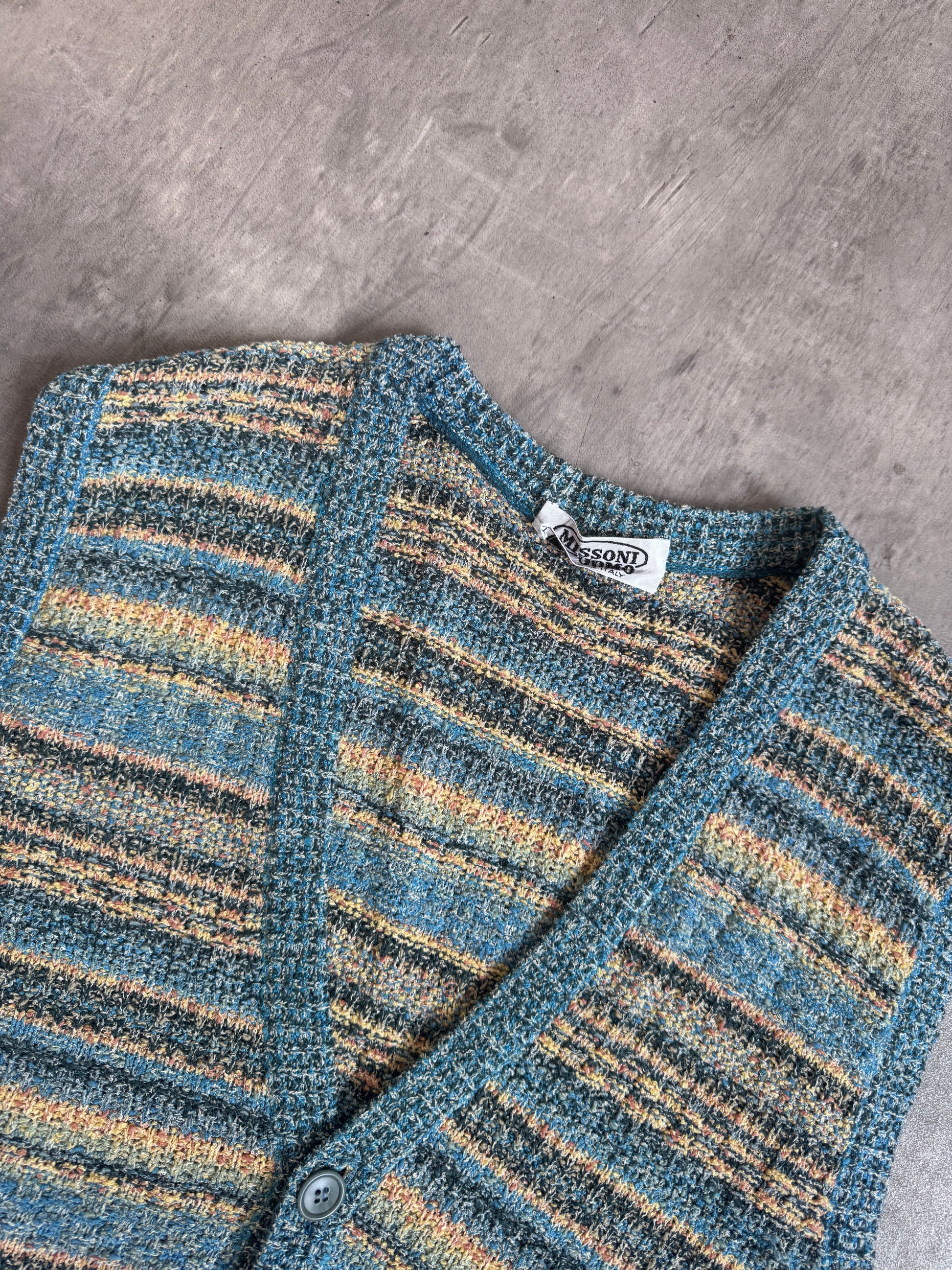 This Missoni Blue Button Down Sweater Vest is a refined piece from the legendary Italian fashion house, celebrated for its intricate knitwear and unmistakable patterns. Crafted in Italy, this vest showcases Missoni’s mastery of colour and texture — featuring a signature multi-tone stripe knit in shades of blue, beige, and ochre. The lightweight cotton-blend knit gives it a soft, breathable feel, perfect for layering or wearing as a standout statement piece.
