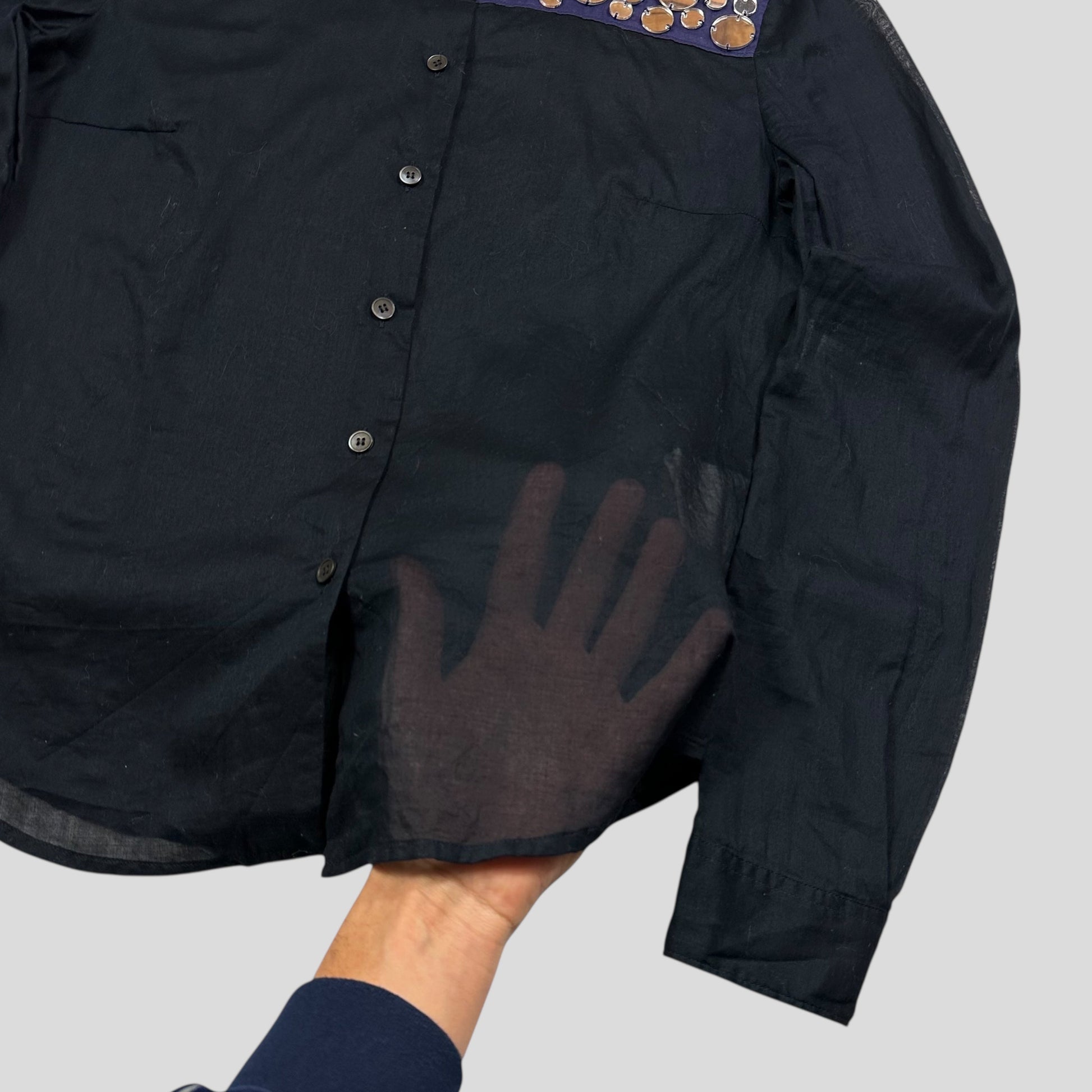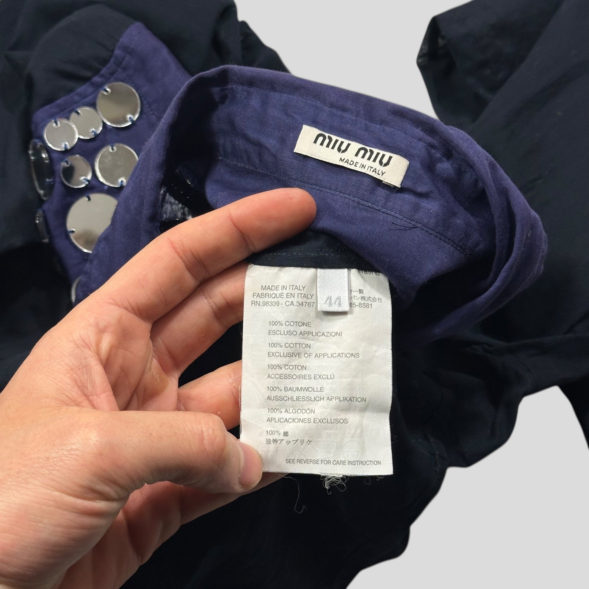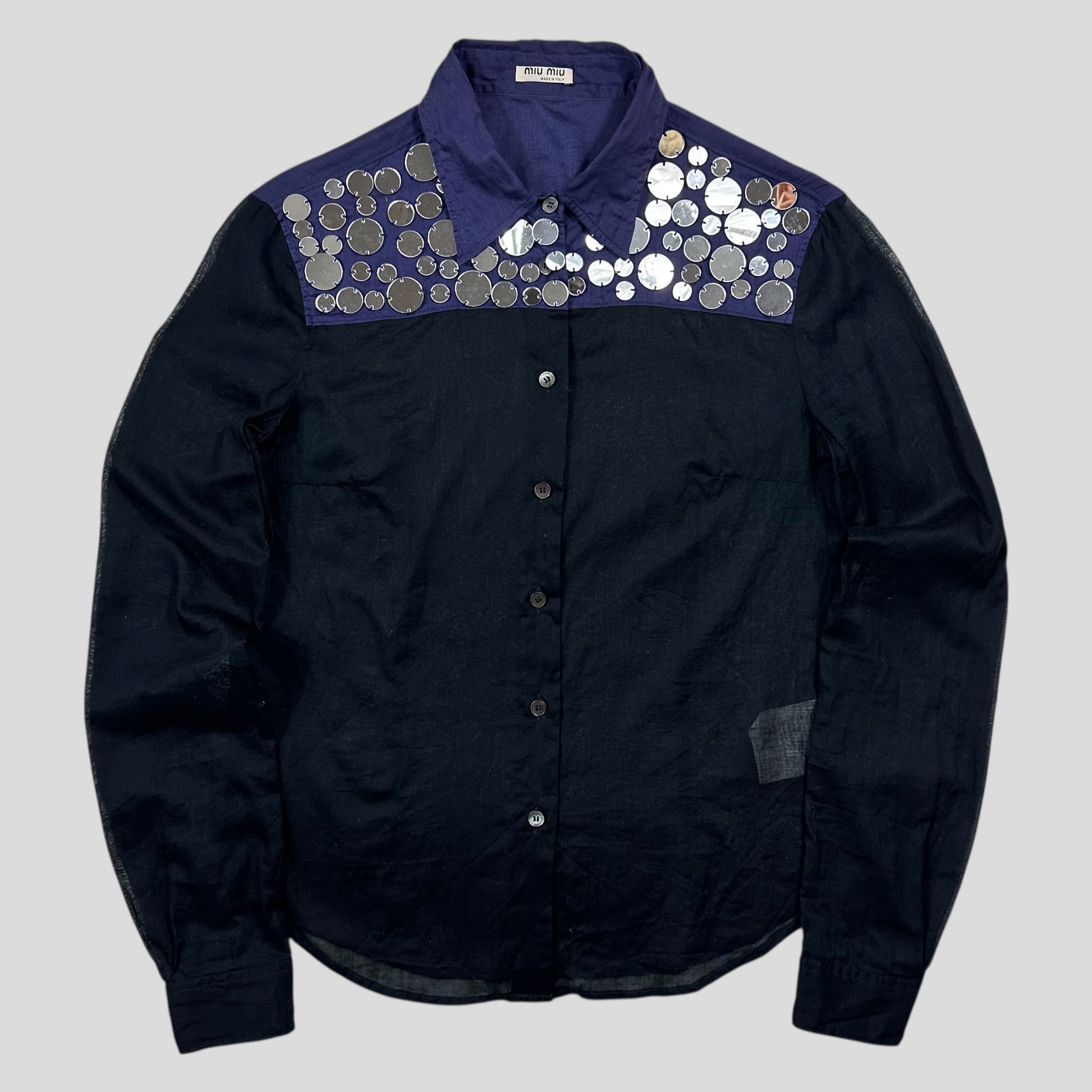 Extremely rare Miu Miu spring summer 2005 semi-sheer tissue cotton shirt, dark navy body with blue shoulder and collar, incredible disc mirrors stitched into the top chest panel, a true high fashion piece from one of Miu Miu best seasons.