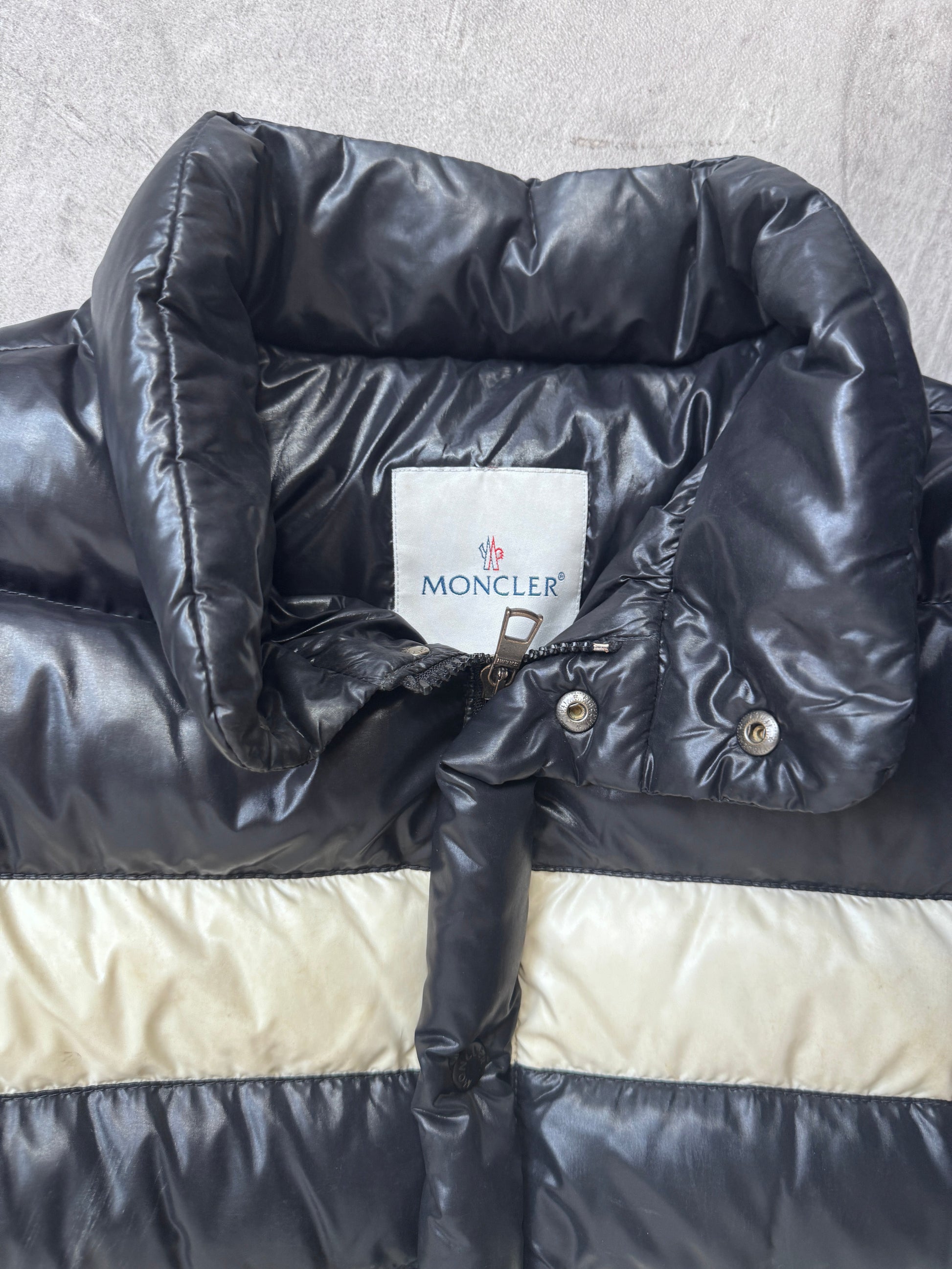 A standout from Moncler’s signature outerwear line, this Two Tone Tissu Puffer Jacket merges alpine functionality with refined Italian craftsmanship. Constructed from high-gloss nylon laqué, the jacket features contrasting cream horizontal panels that break the deep navy body, adding depth and visual impact to its quilted structure. Insulated with premium down fill, it offers superior warmth without compromising on weight or comfort. Design details include snap button and zip front closure, angled zip hand pockets, and the iconic Moncler logo badge on the sleeve. A bold yet timeless design that captures the label’s balance of luxury and technical performance.