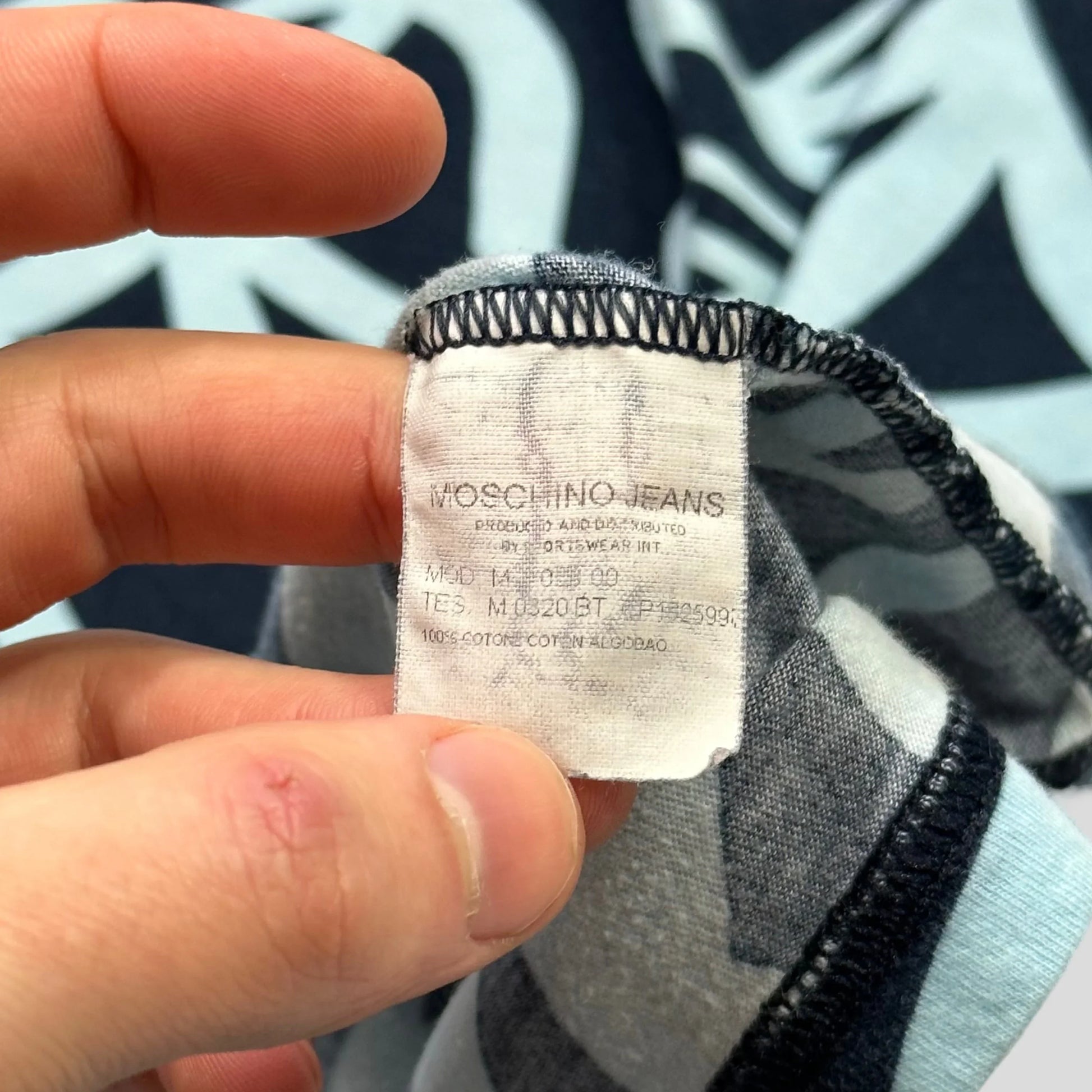 Stunning Moschino Jeans t-shirt, influenced by Salvador Dali’s melting clocks painting. All over peace logos with Moschino spellouts throughout.