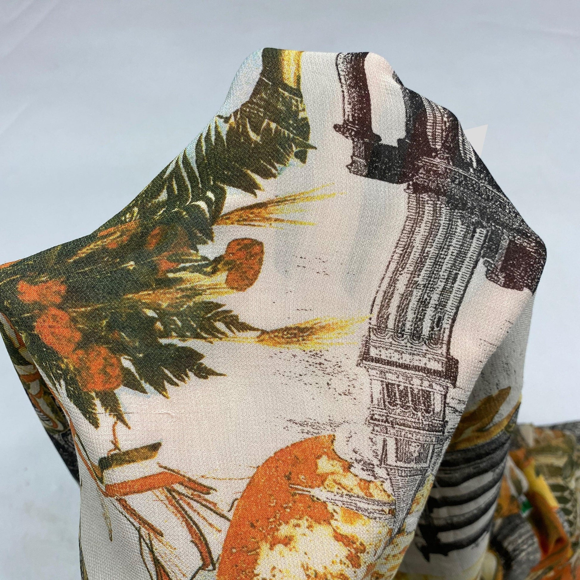 All over print depicting arty cliche scenes of Italy from bowls of pasta to the leaning tower of Pisa, constructed from semi-sheer see through lightweight rayon, made in Italy.