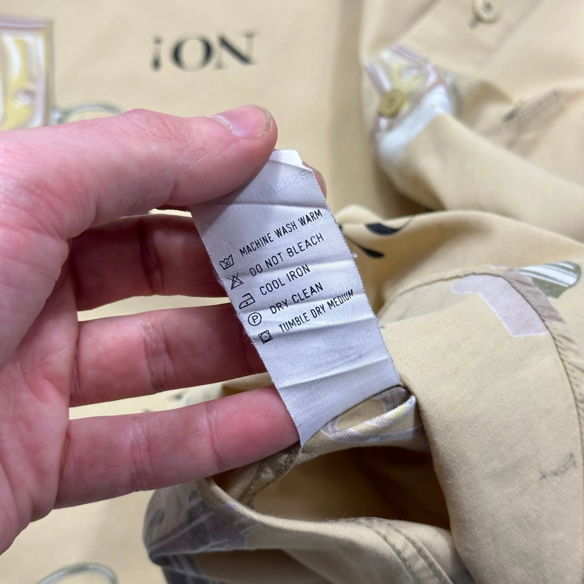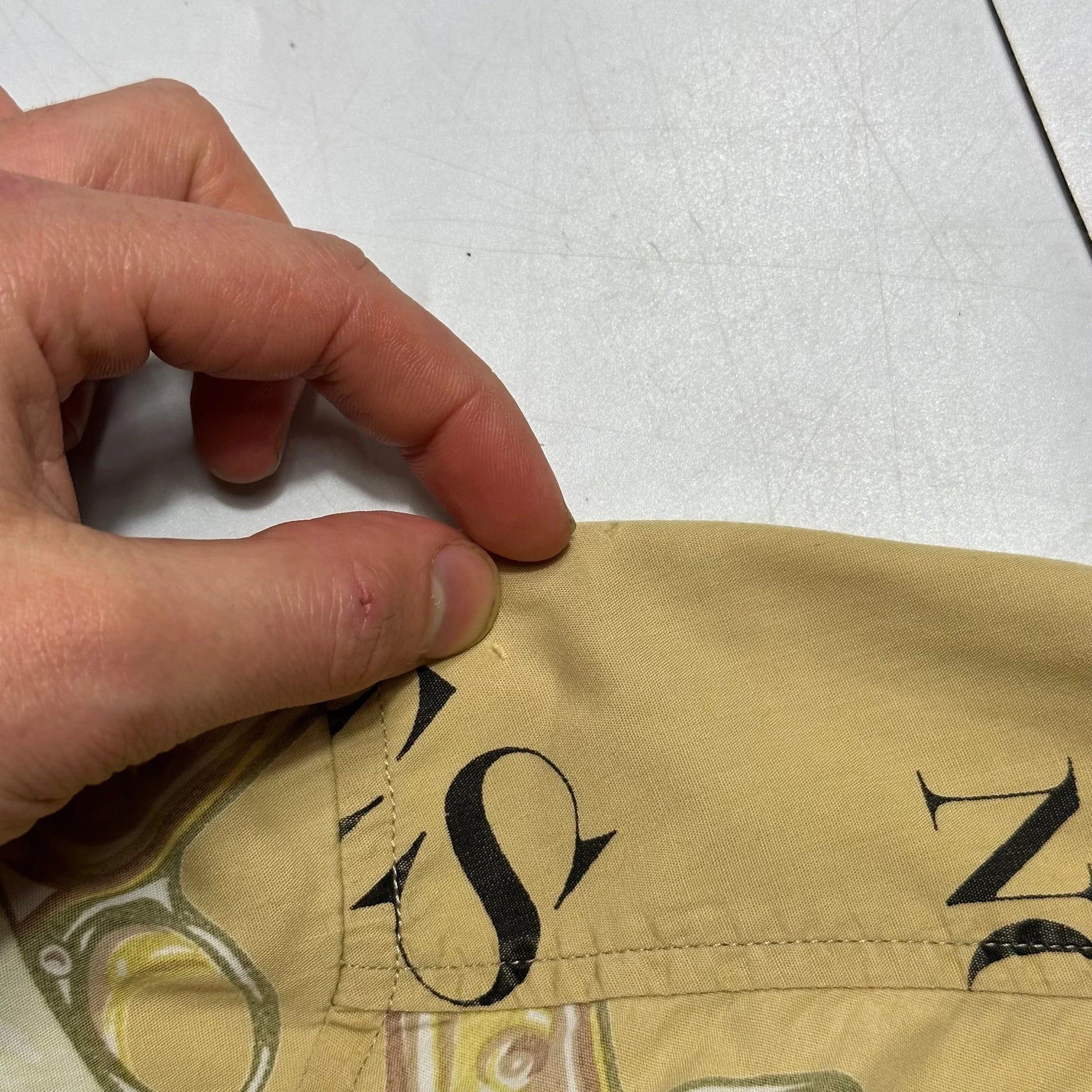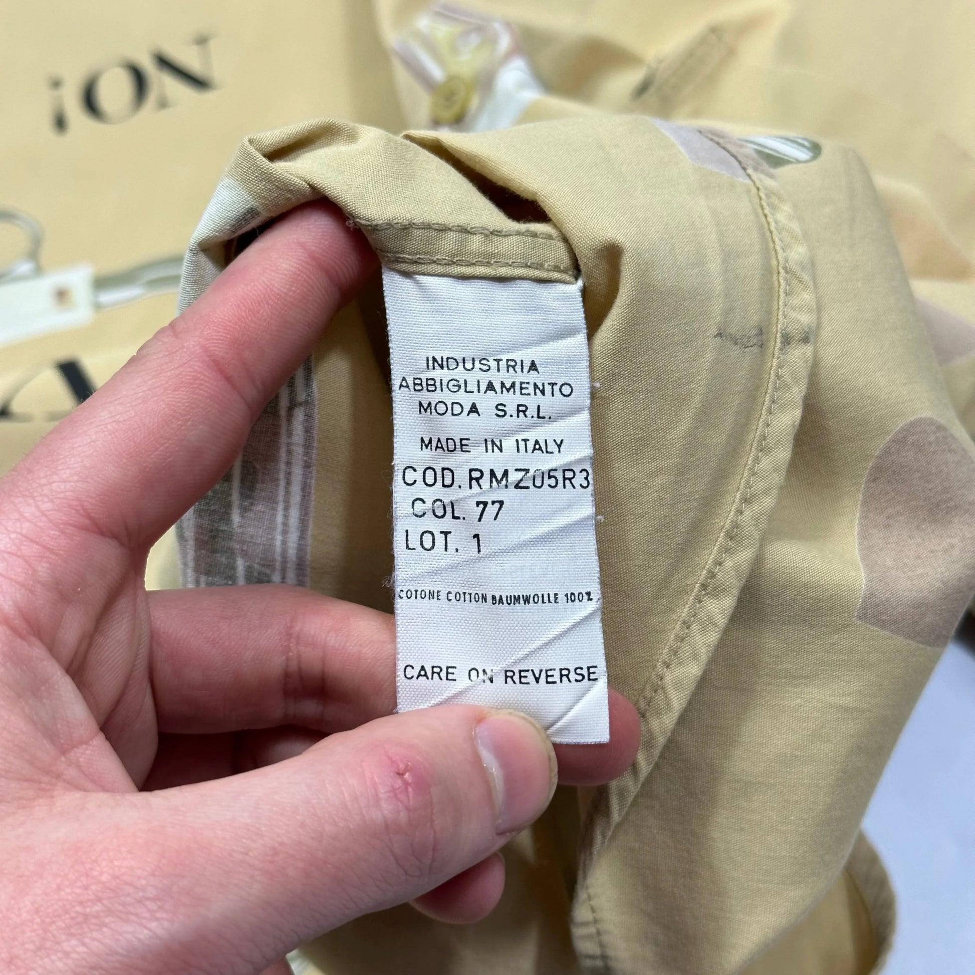 Extremely rare mid 1980’s Moschino Uomo Pale Yellow Shirt, beautiful mendini style pistol gun print with two variations of pistols decorated in style, yes / no spellouts and love hearts typical of Franco Moschino.