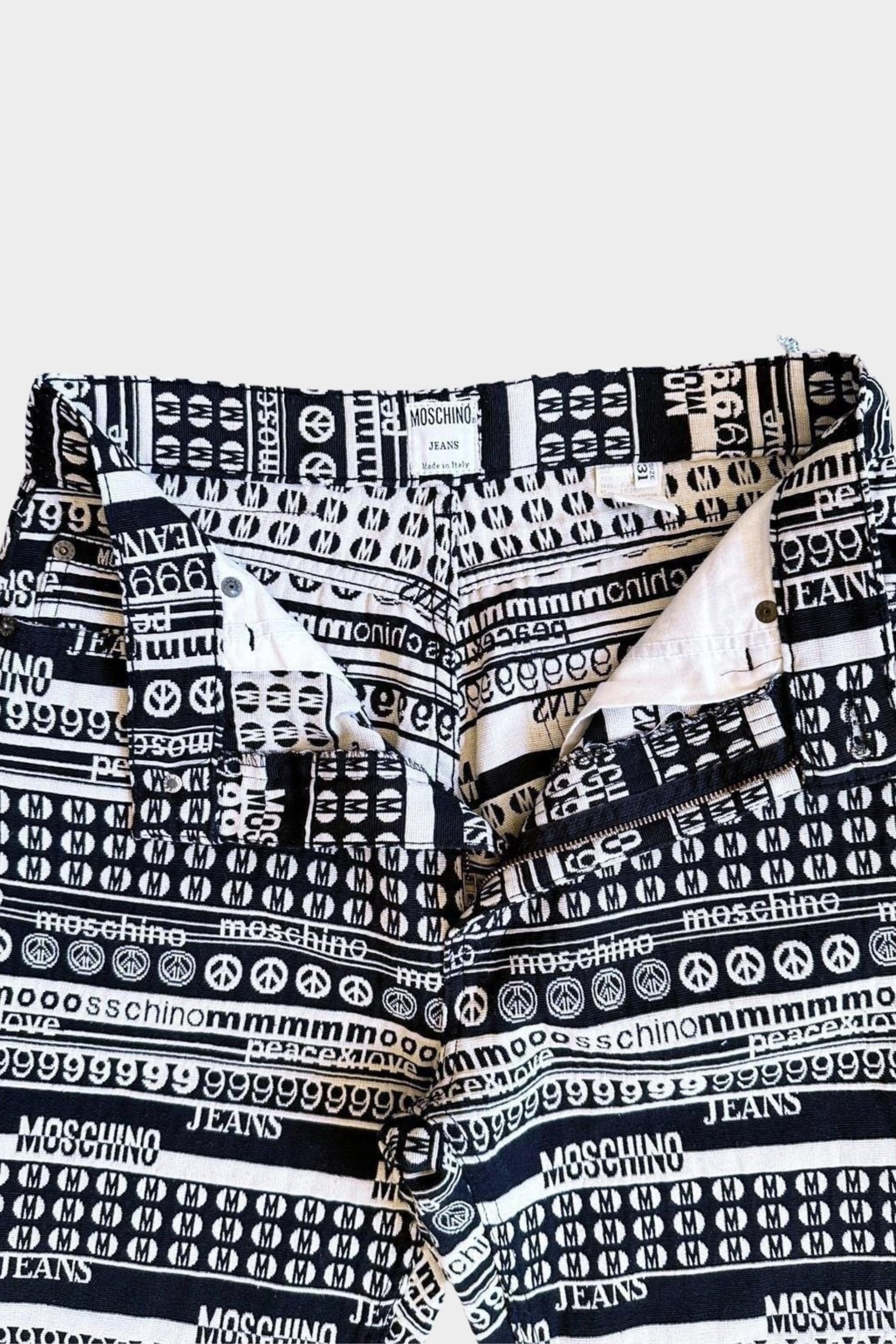 These Moschino black and white jeans showcase the iconic Peace & Love monogram print, paying homage to the vibrant rave culture of the 1990s. With a straight fit and mid-rise waist, they offer a unisex style that's as versatile as it is nostalgic. As a vintage pre-worn piece, they show some natural signs of wear and age, but they remain in good condition overall.