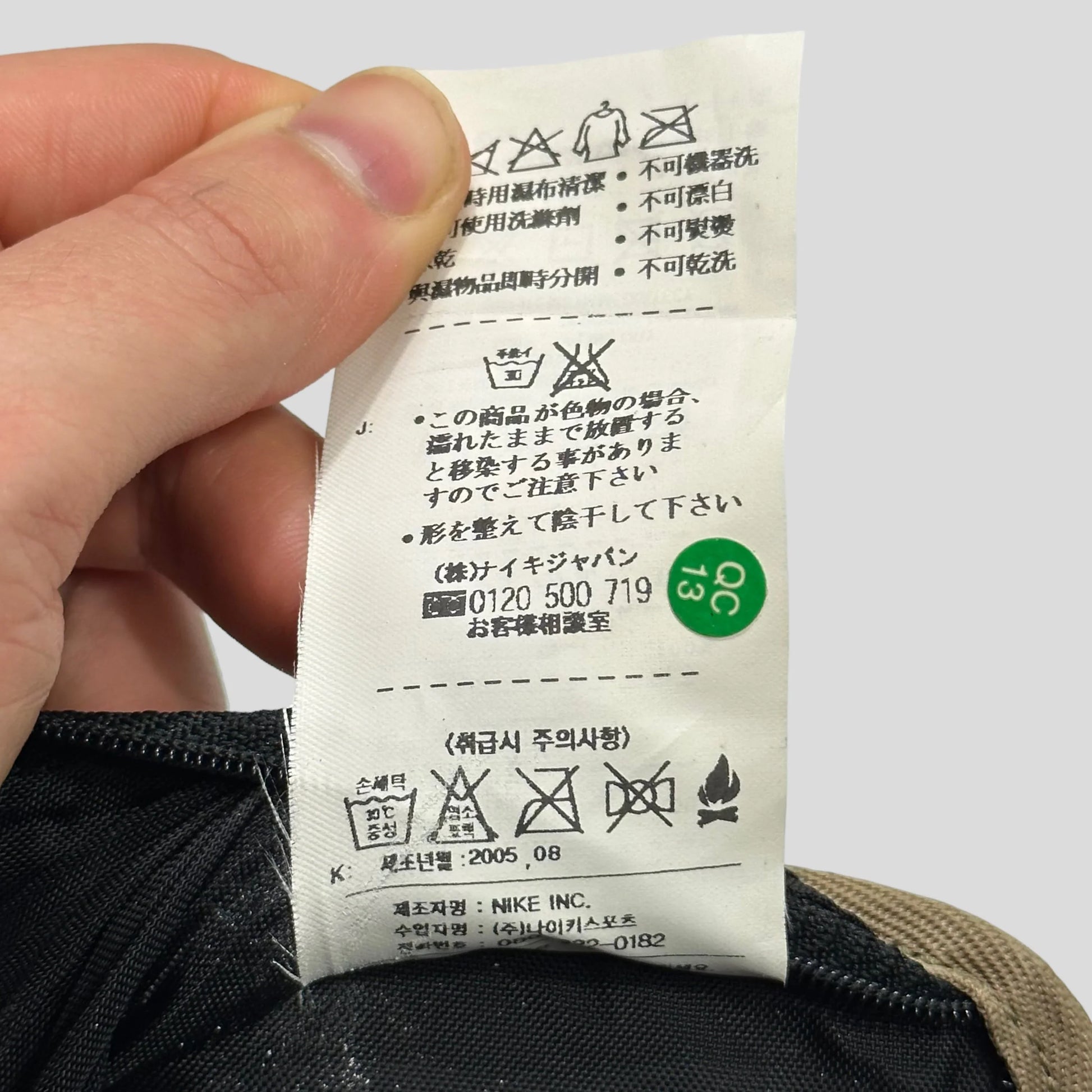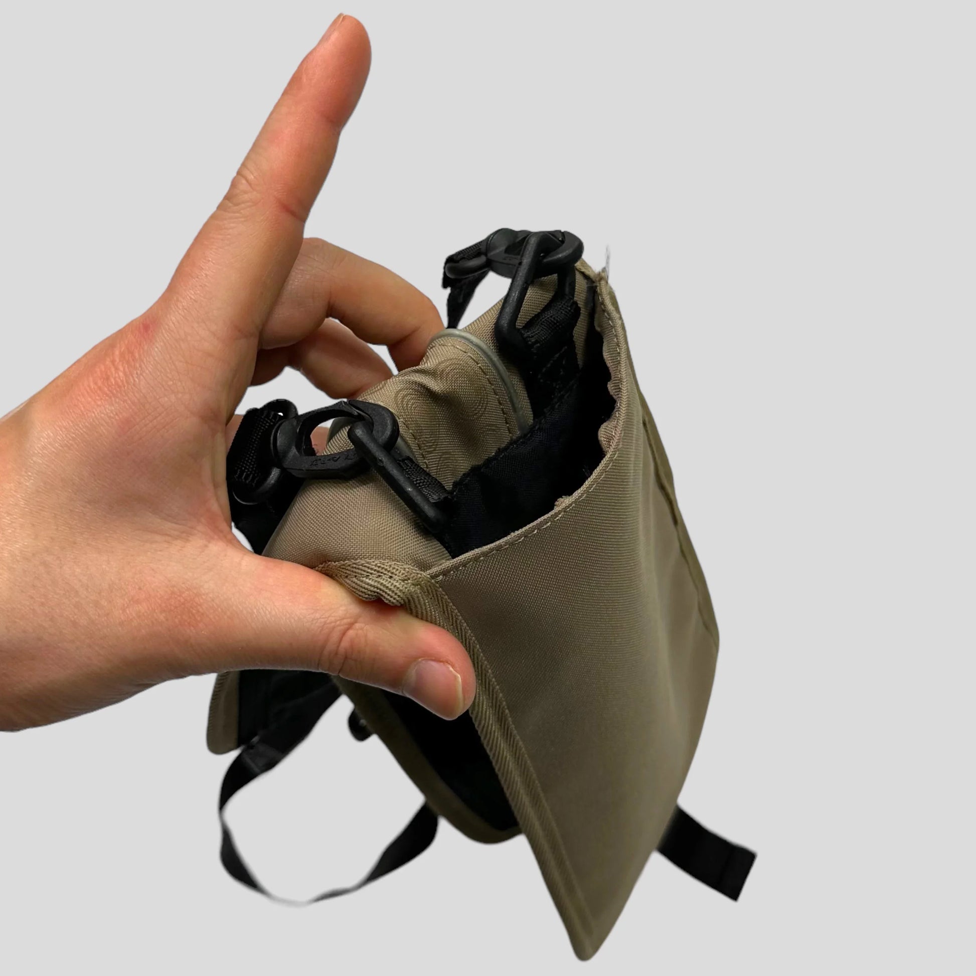Very rare and unique 2005 Nike tri-fold wallet bag, technically interesting piece with an embroidered swoosh and fingerprint pattern on the front, bag clips apart and folds out into a large wallet style bag with tonnes of zip and mesh storage and card slots, hidden large pocket on the back.